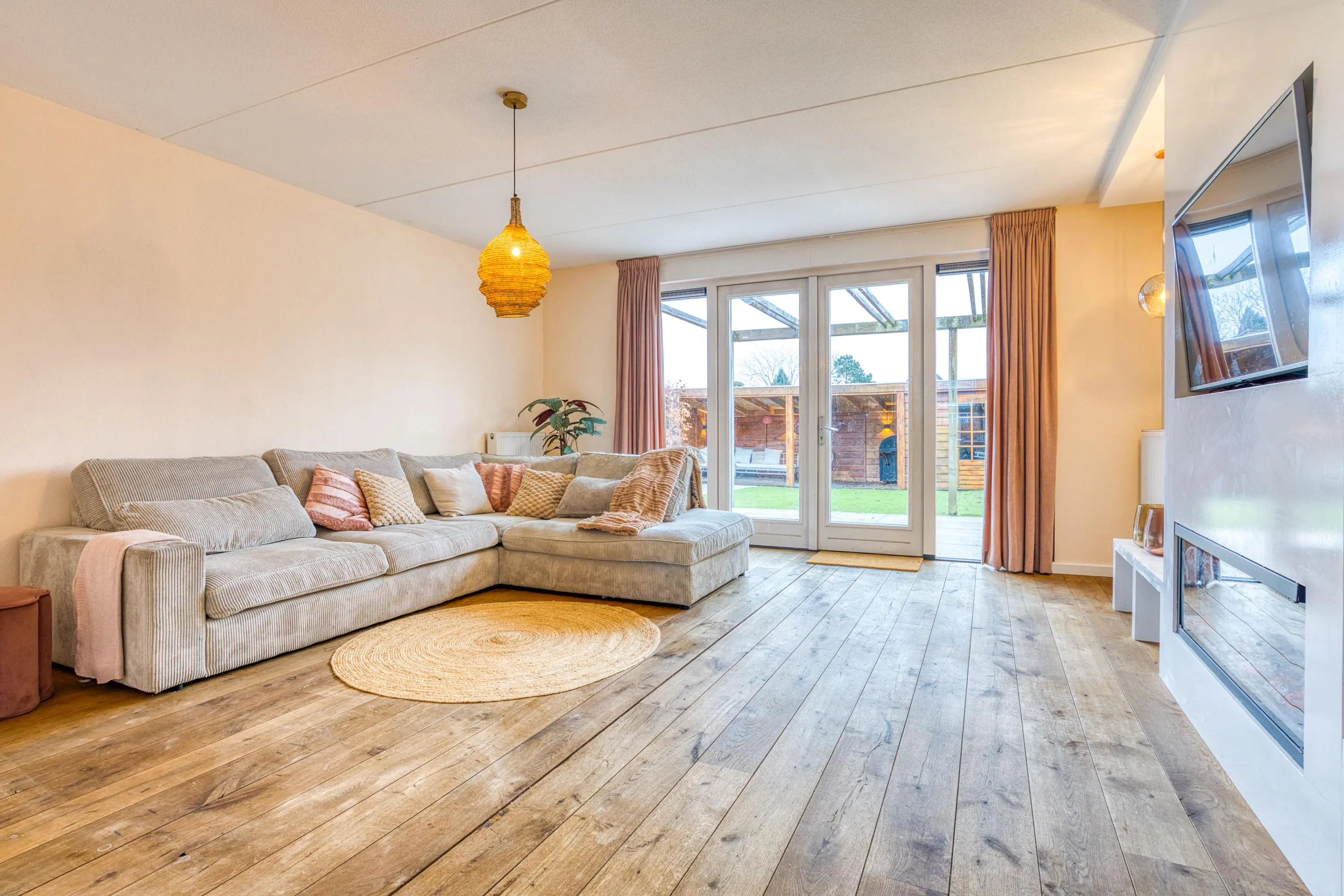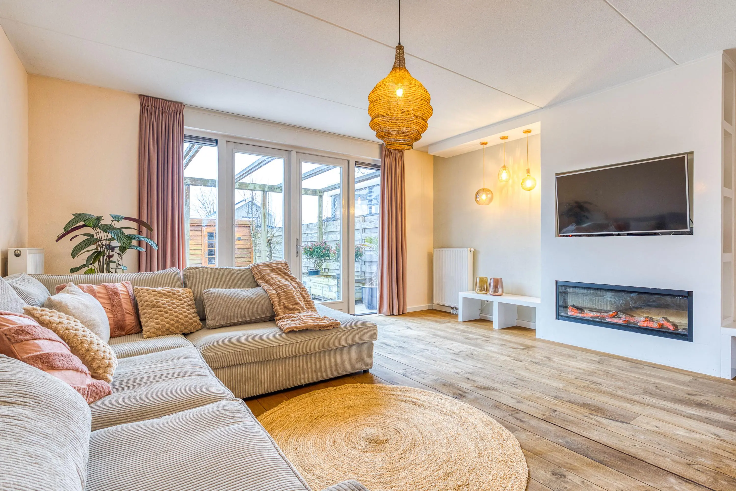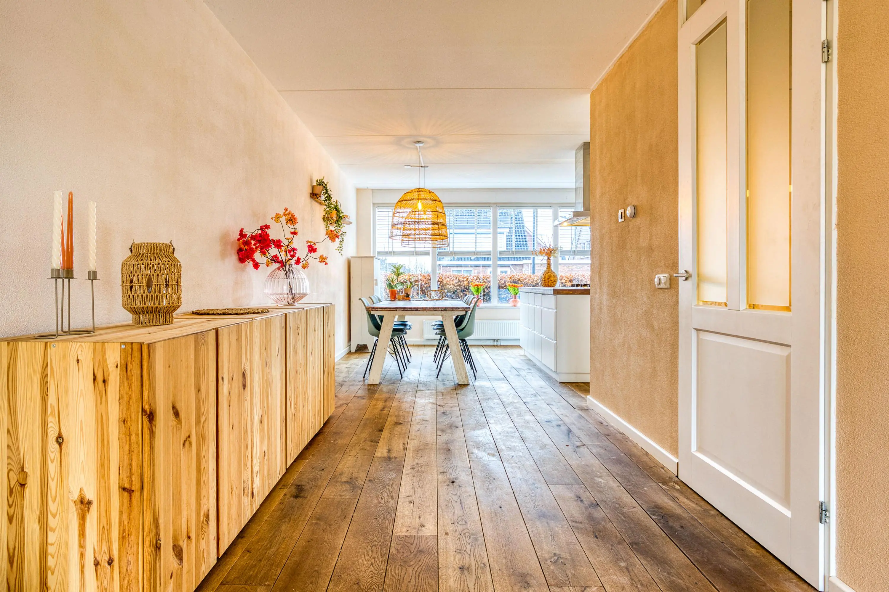 Via de zij-entree betreedt u de ruime hal met toilet, meterkast, garderobe, trapopgang en trapkast. Vanuit hier bereikt u de tuingerichte, uitgebouwde woonkamer: een sfeervolle leefruimte met veel lichtinval, grote raampartijen en dubbele openslaande deuren naar de achtertuin.