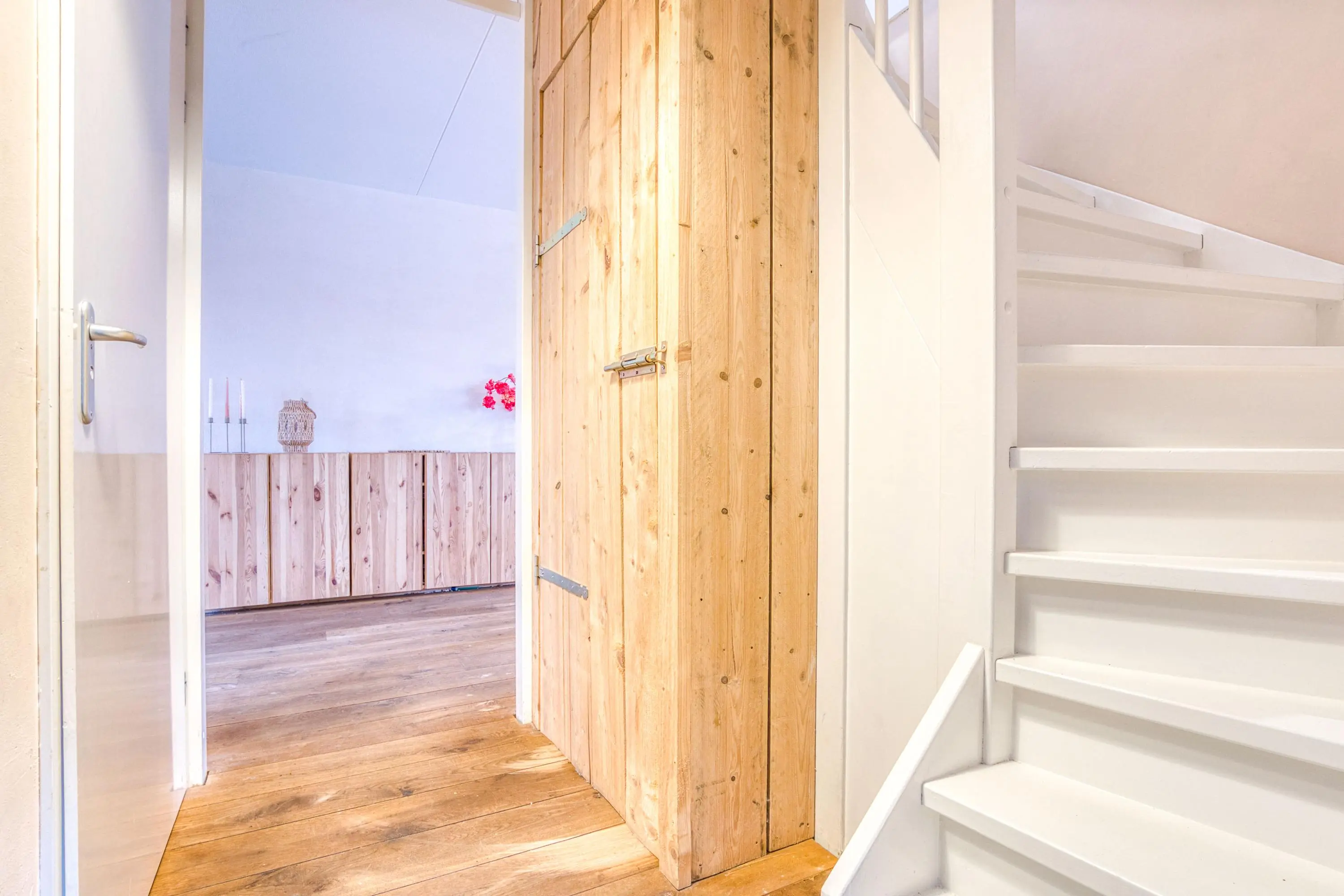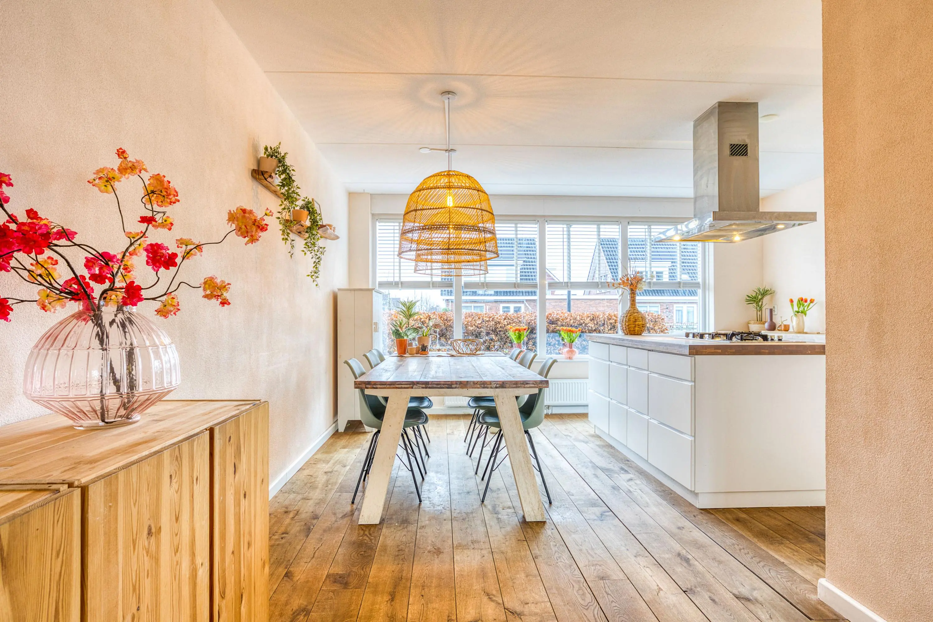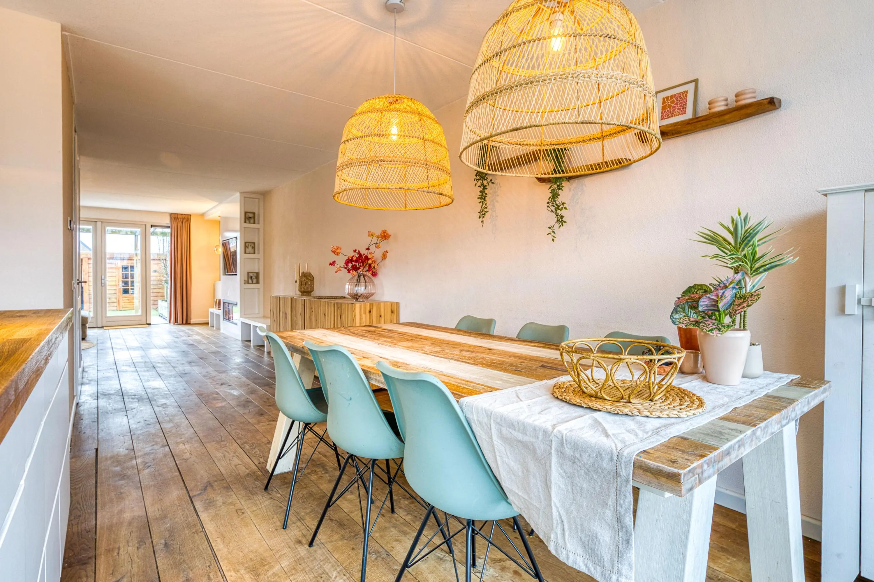 Via de zij-entree betreedt u de ruime hal met toilet, meterkast, garderobe, trapopgang en trapkast. Vanuit hier bereikt u de tuingerichte, uitgebouwde woonkamer: een sfeervolle leefruimte met veel lichtinval, grote raampartijen en dubbele openslaande deuren naar de achtertuin.
