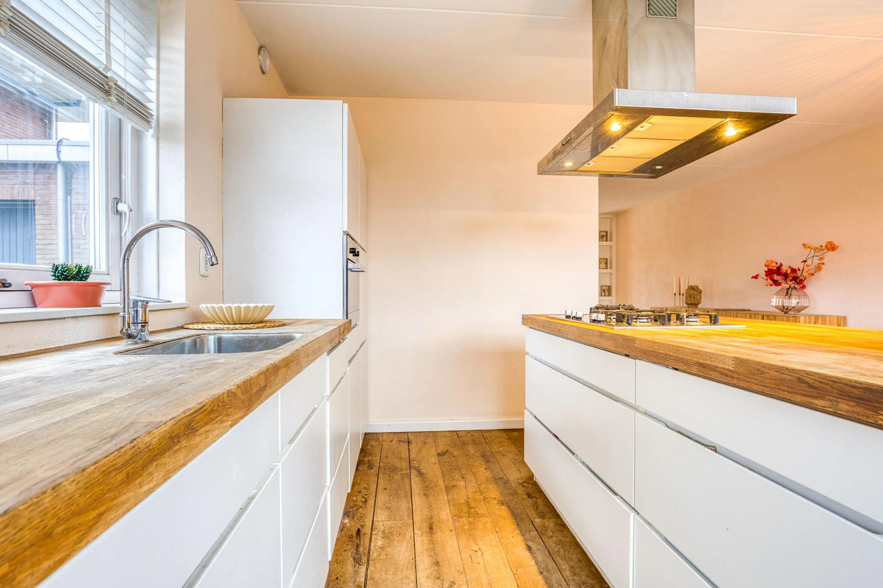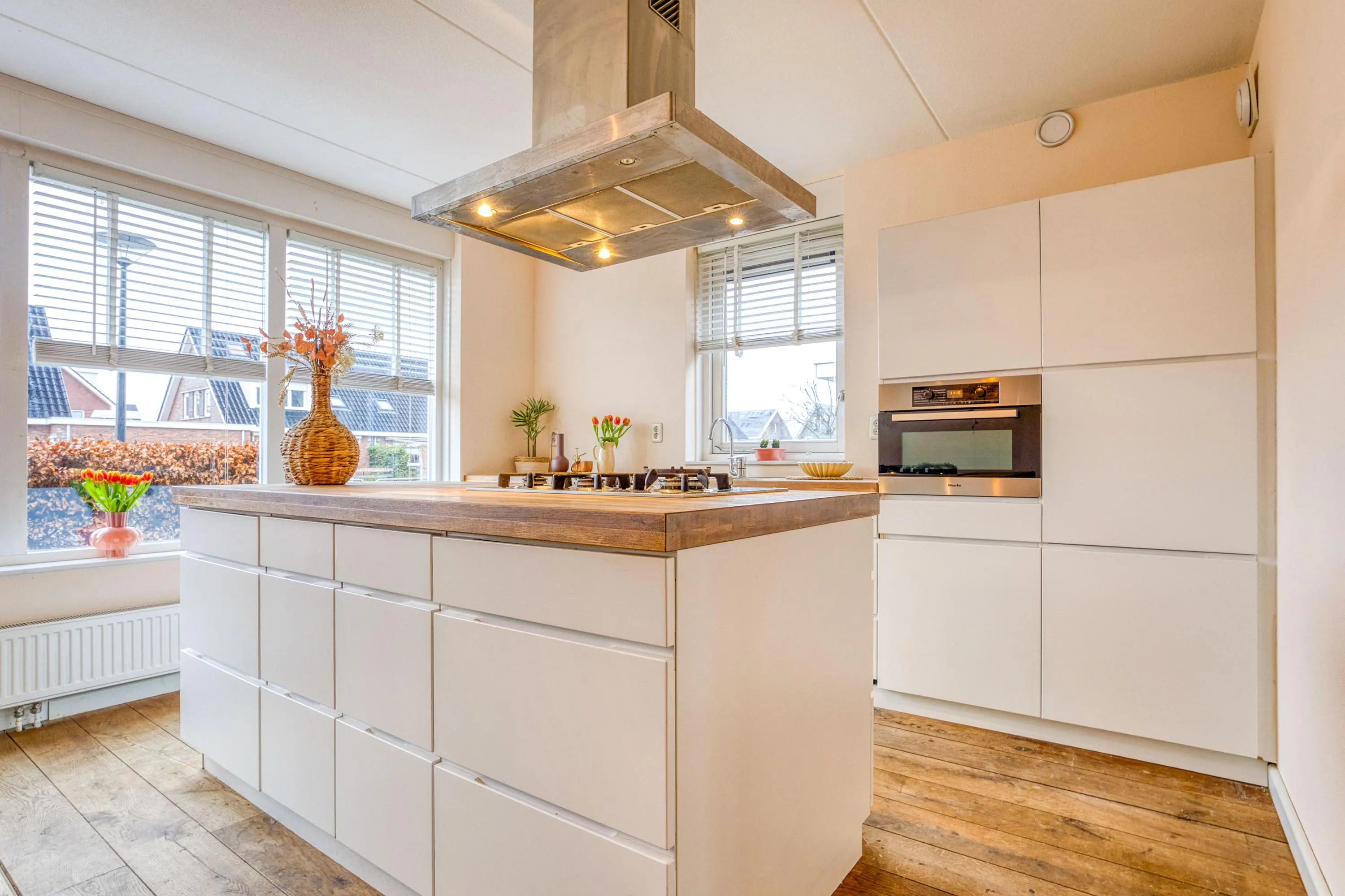 Aan de voorzijde bevindt zich de moderne keuken met rechte opstelling en kookeiland. Dankzij het grote raam geniet u hier van een prettige lichtinval en vrij uitzicht richting het water. De keuken is compleet uitgerust met onder andere een koelkast, vriezer, combi-oven, vaatwasser, gaskookplaat en afzuigkap — perfect voor kookliefhebbers.