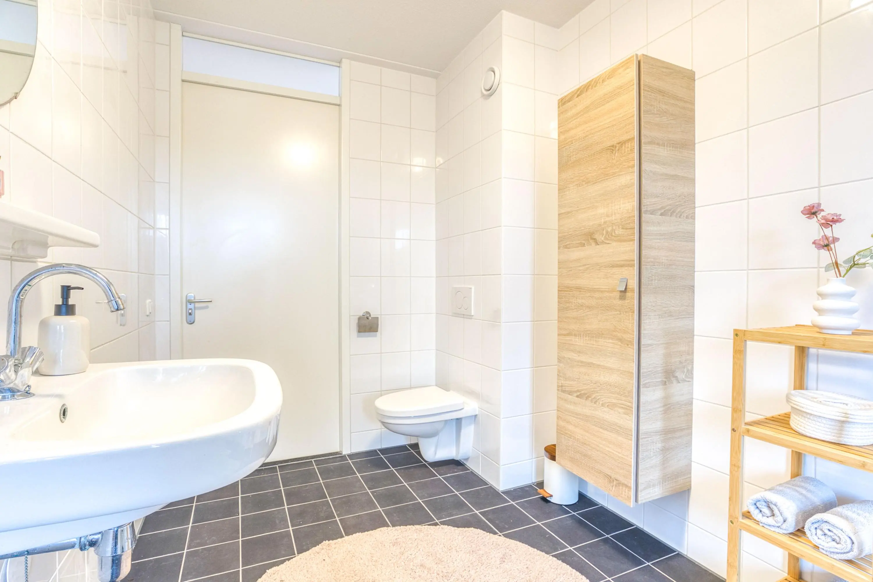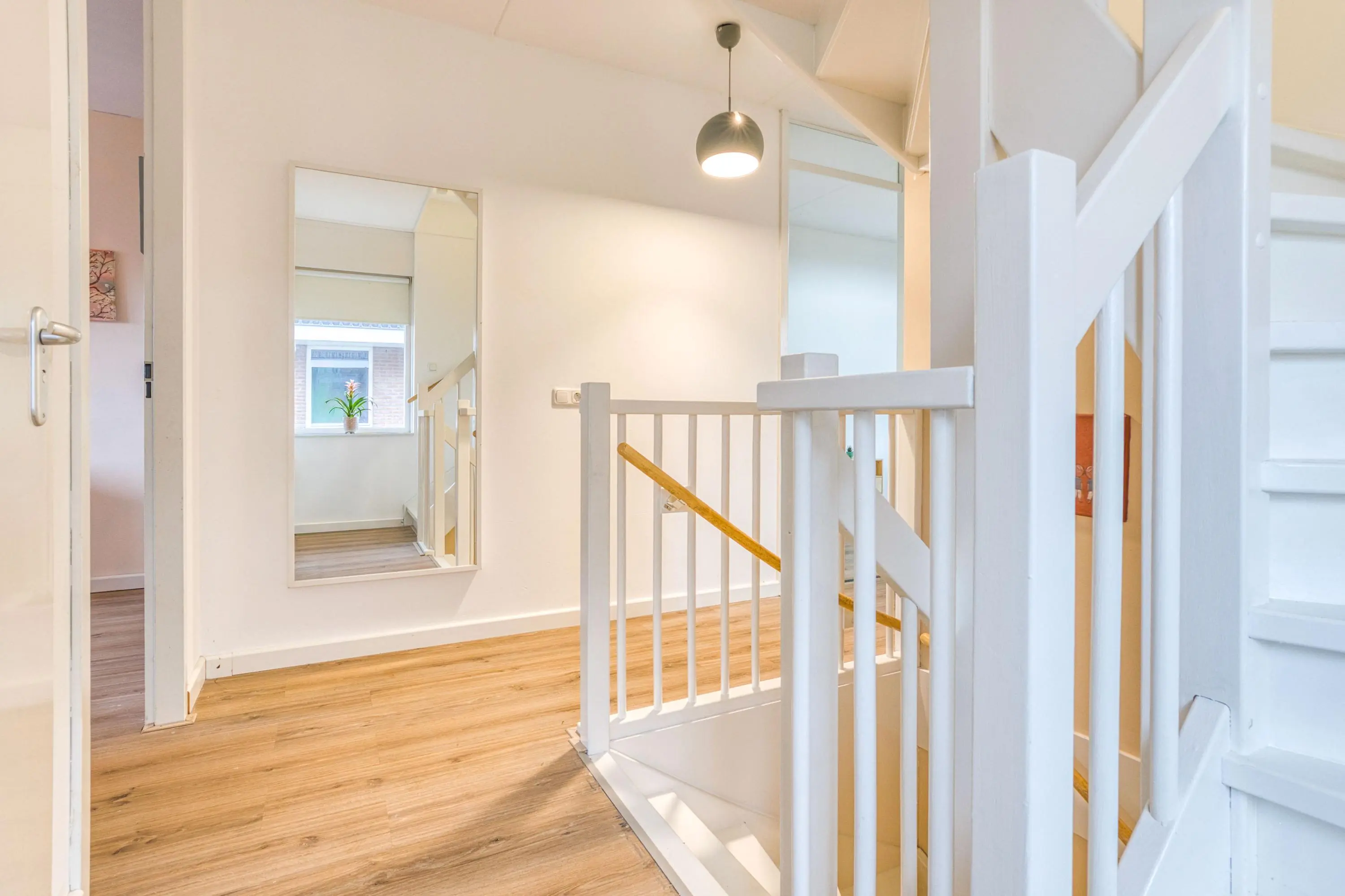 De verdieping is, met uitzondering van de badkamer, afgewerkt met een nette laminaatvloer. De badkamer is uitgevoerd in lichte tinten en voorzien van een inloopdouche, wastafelmeubel, designradiator en hangend toilet.