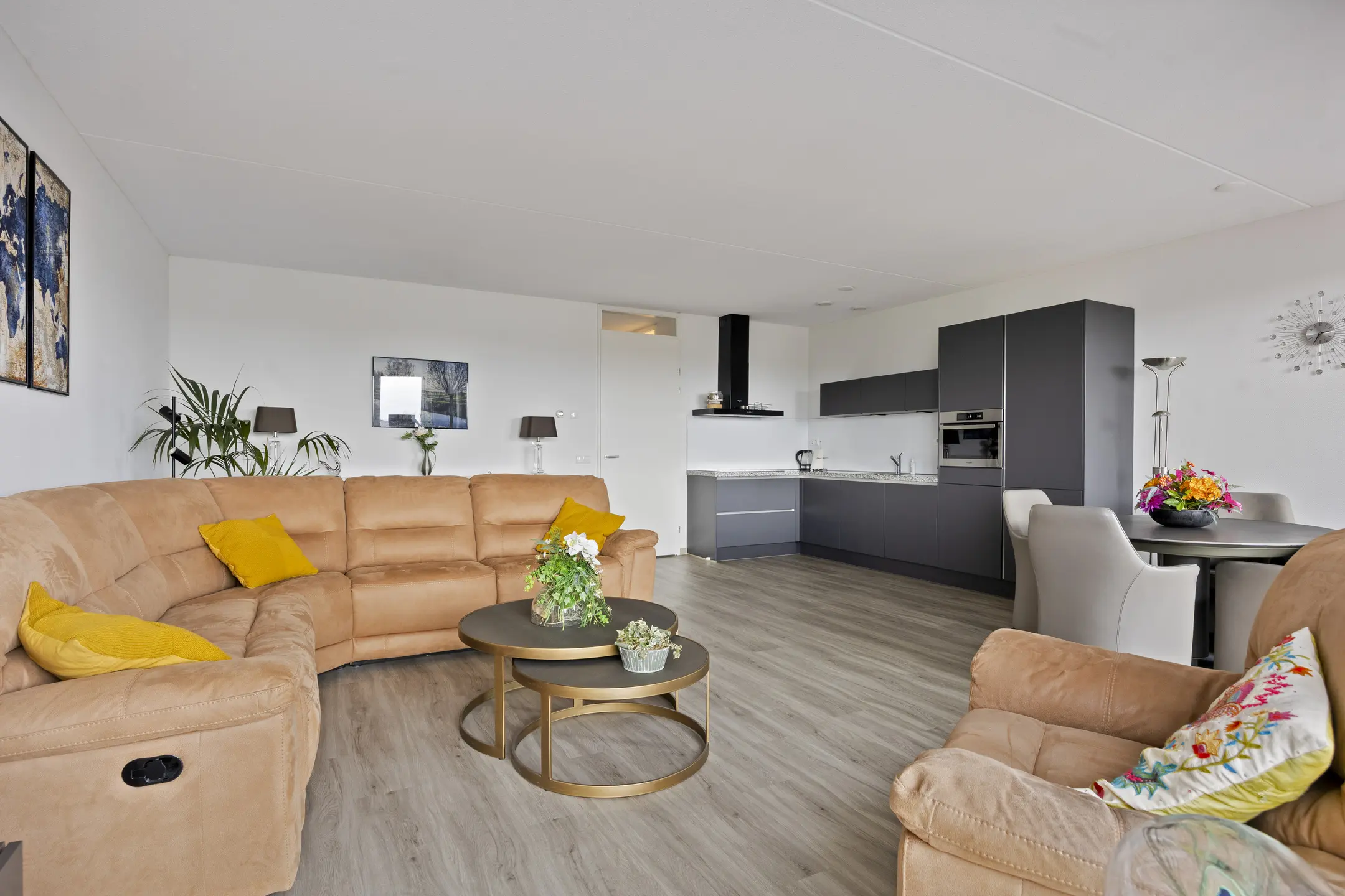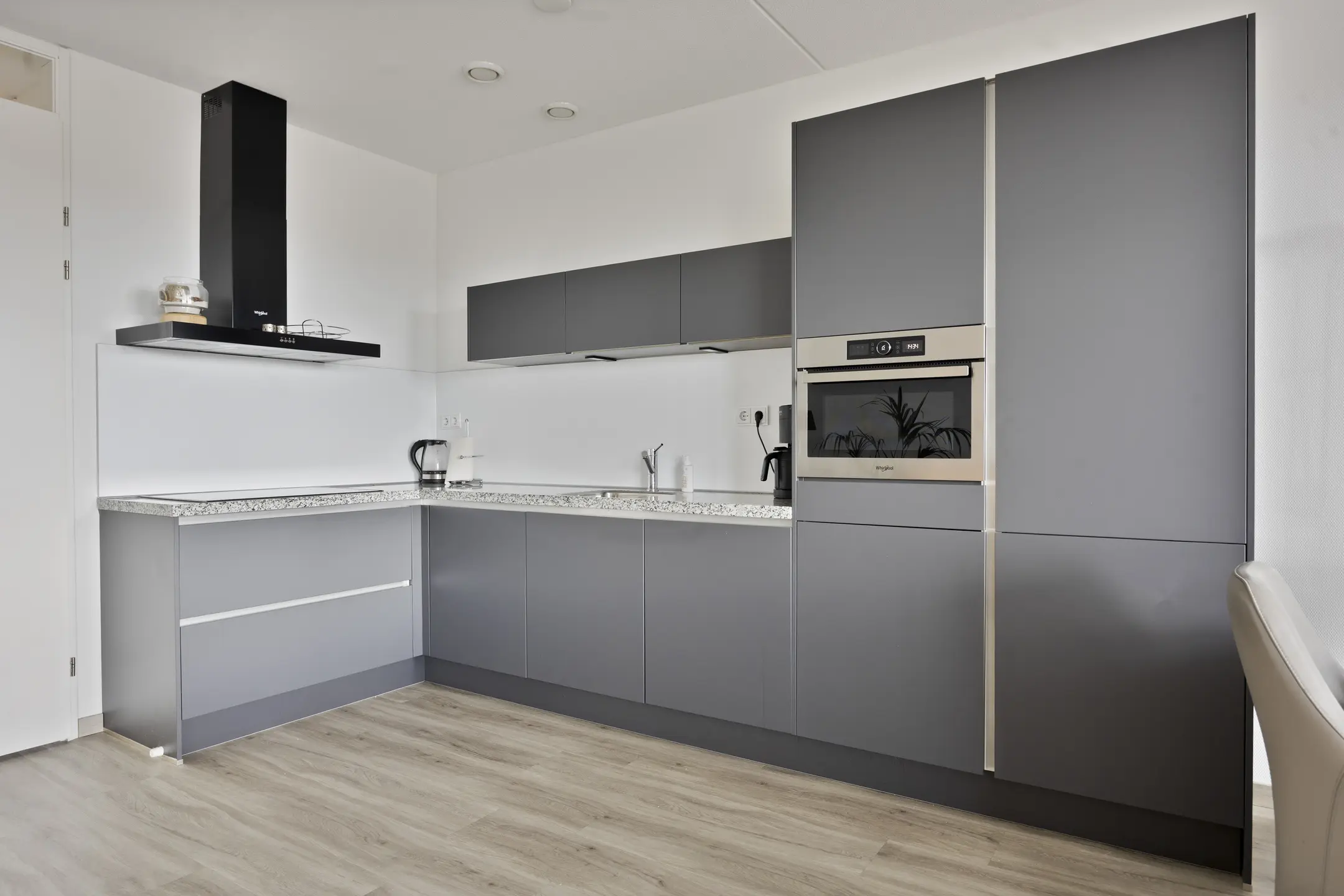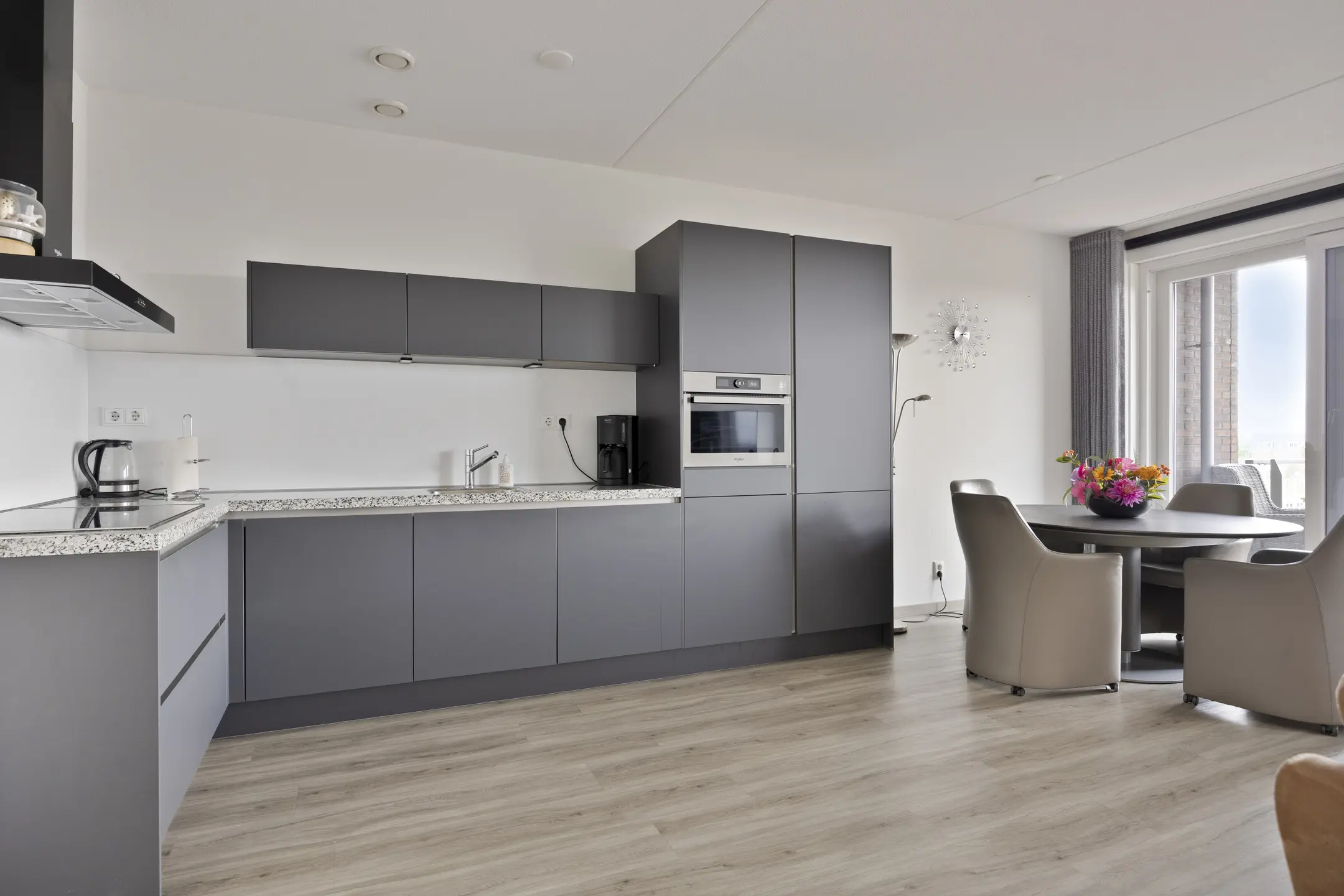 De ruime living is stijlvol afgewerkt en voorzien van een moderne open keuken in L-opstelling, uitgerust met hoogwaardige inbouwapparatuur zoals een inductiekookplaat, vaatwasser, combi-oven, koel-/vriescombinatie en afzuigkap. Het gehele appartement beschikt over een keurige pvc-vloer met vloerverwarming.