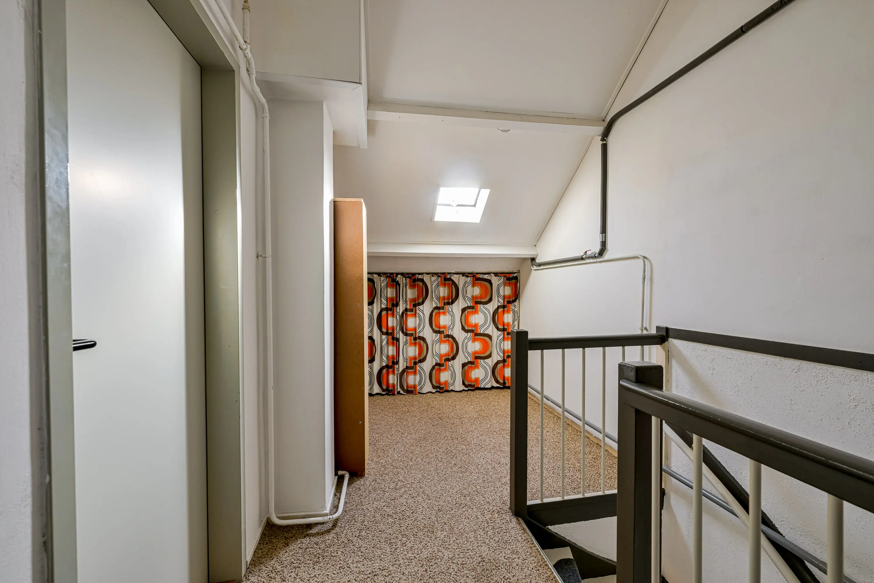 Tweede verdieping : Via de vaste trap bereikt u de tweede verdieping. Op deze verdieping is een kunststof dakkapel geplaatst. Zo is er hier een ruime vierde slaapkamer ontstaan. Op de voorzolder is de Cv-ketel geplaatst. Ook is daar ruimte voor een wasmachine en droger. Achter de knieschotten is voldoende ruimte over voor het opbergen van spullen die u niet dagelijks gebruikt.