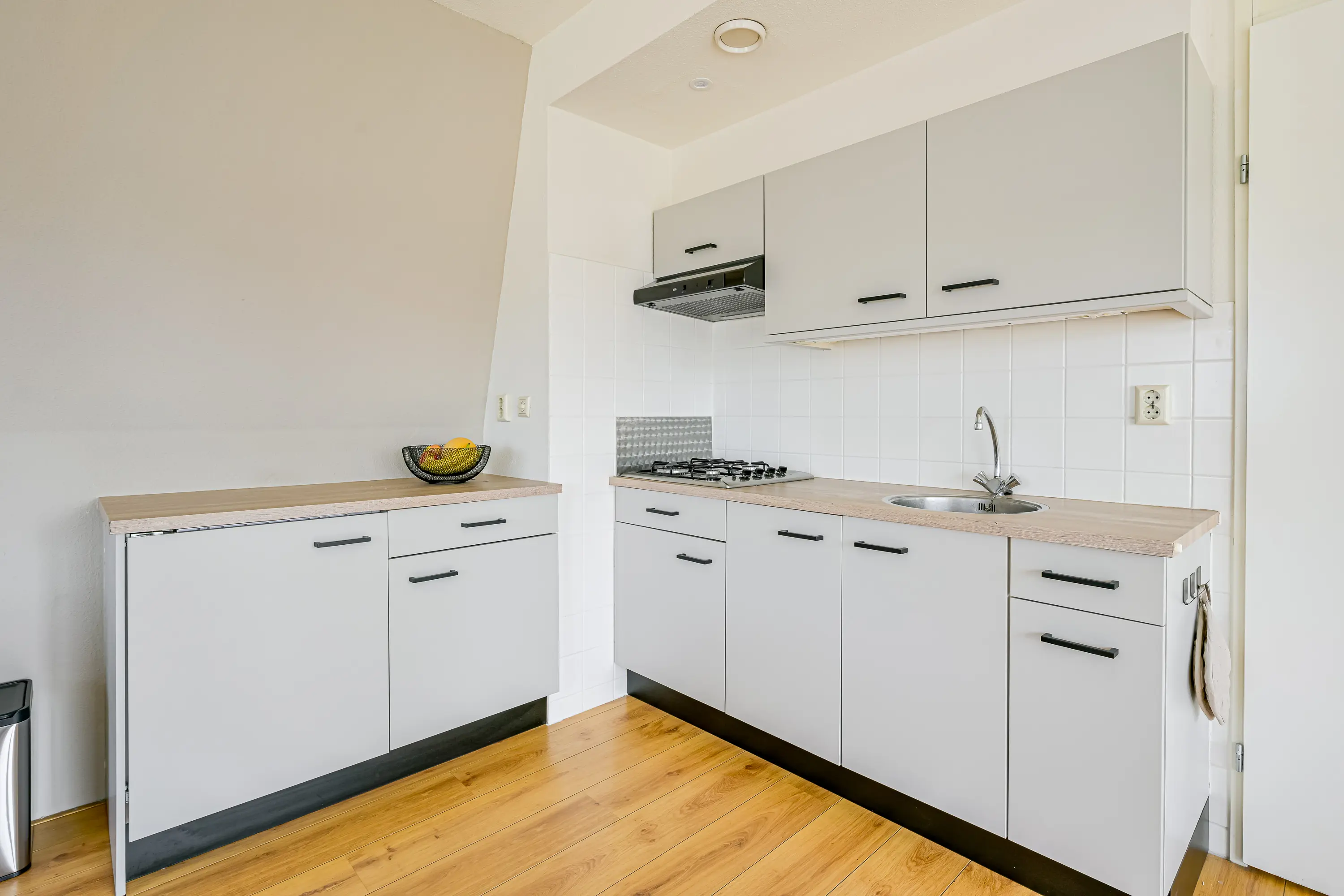 De open keuken is netjes en beschikt over een inbouwkoelkast, gasfornuis en een afzuigkap. Verder is er in de keuken voldoende kastruimte aanwezig voor het opbergen van al uw keukengerei.