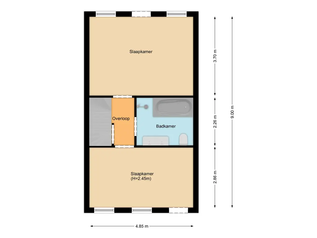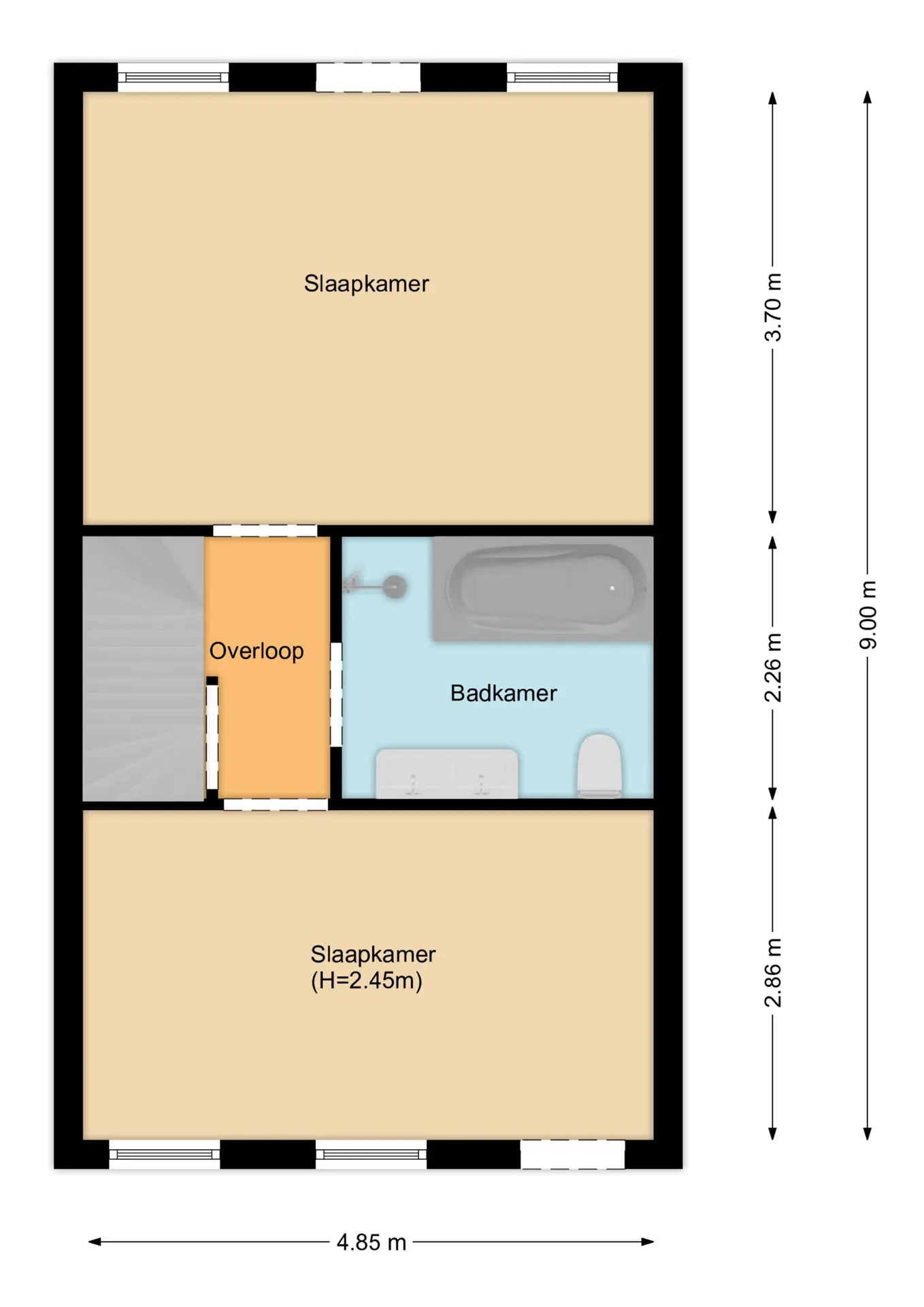 Eerste verdieping: overloop met trapopgang naar de tweede verdieping. Nette/ruime badkamer met inloopdouche, toilet, ligbad, dubbele wastafel en een designradiator. Er bevindt zich een ruime slaapkamer aan de voorzijde én een ruime slaapkamer met inbouwkast aan de achterzijde van het huis, beide met Frans balkon. Deze verdieping is voorzien van rechte wanden waardoor alle ruimte optimaal te gebruiken is.