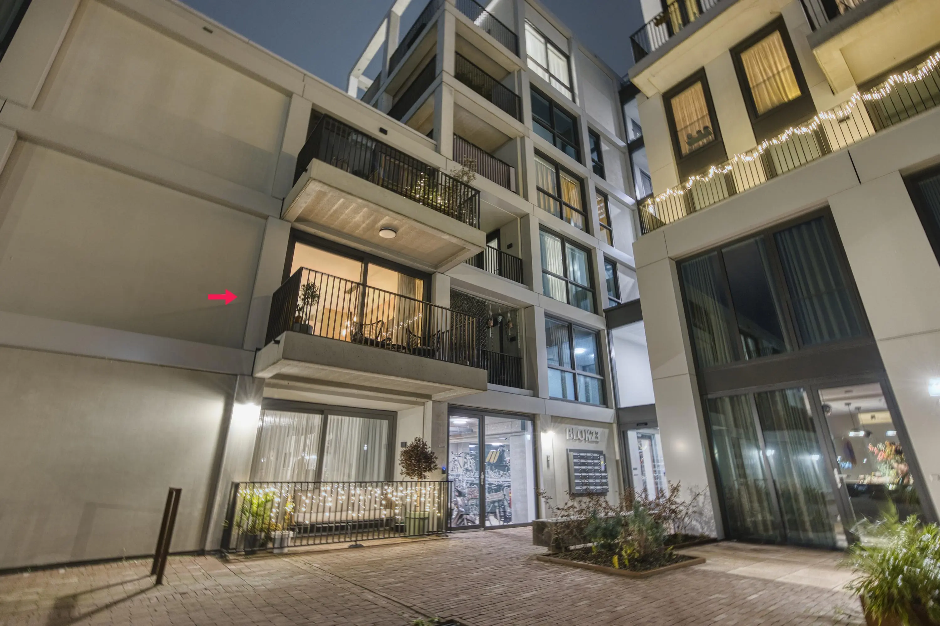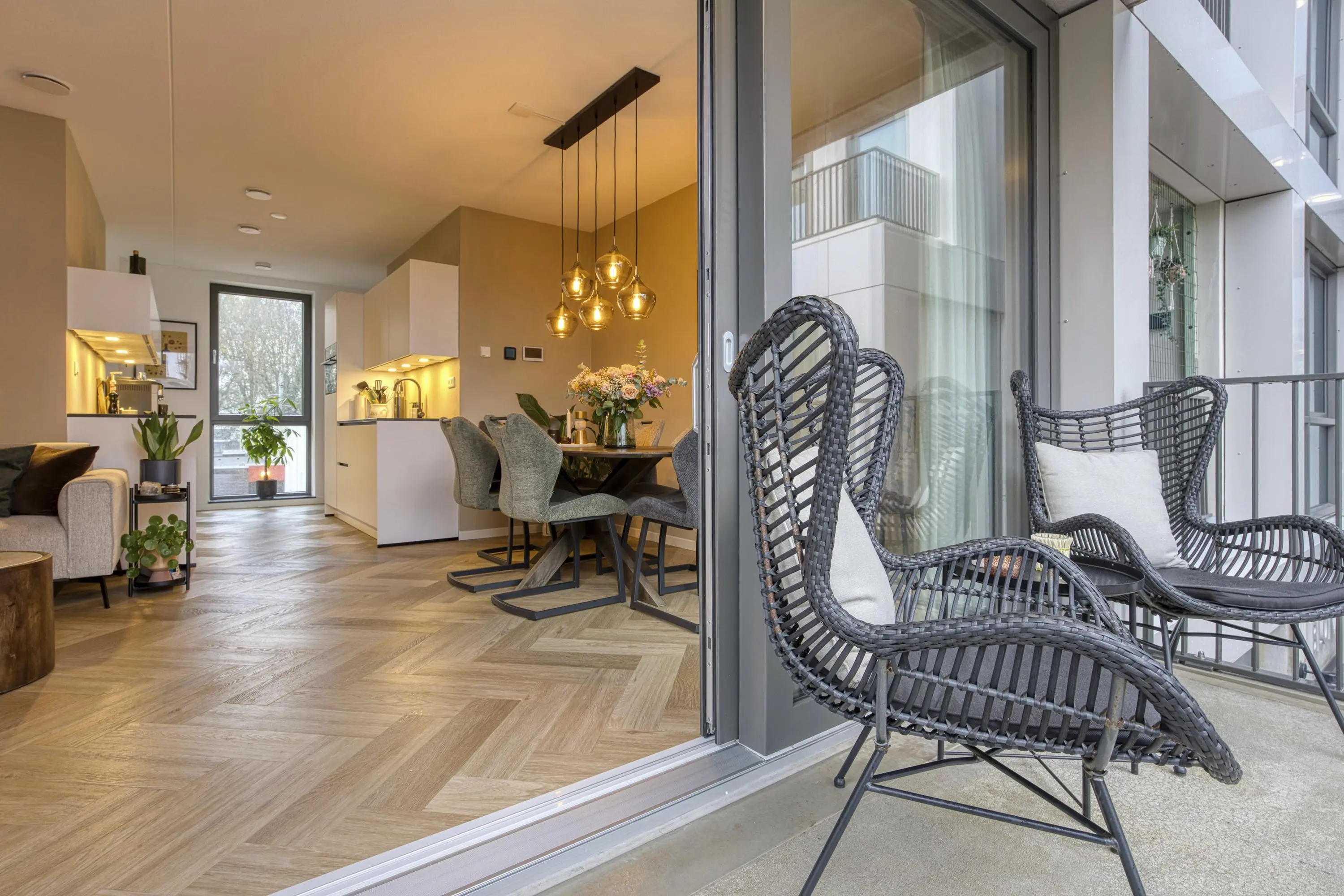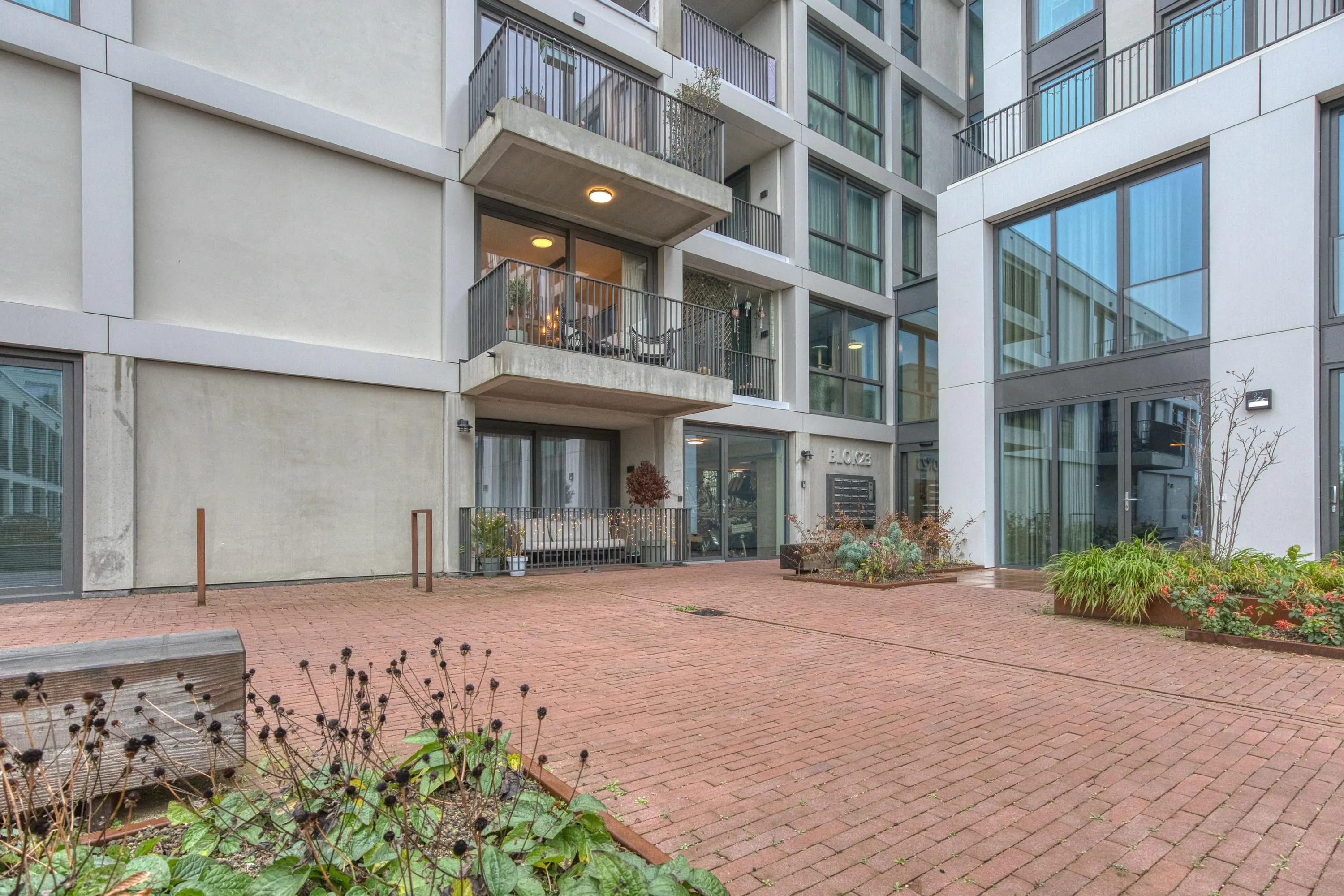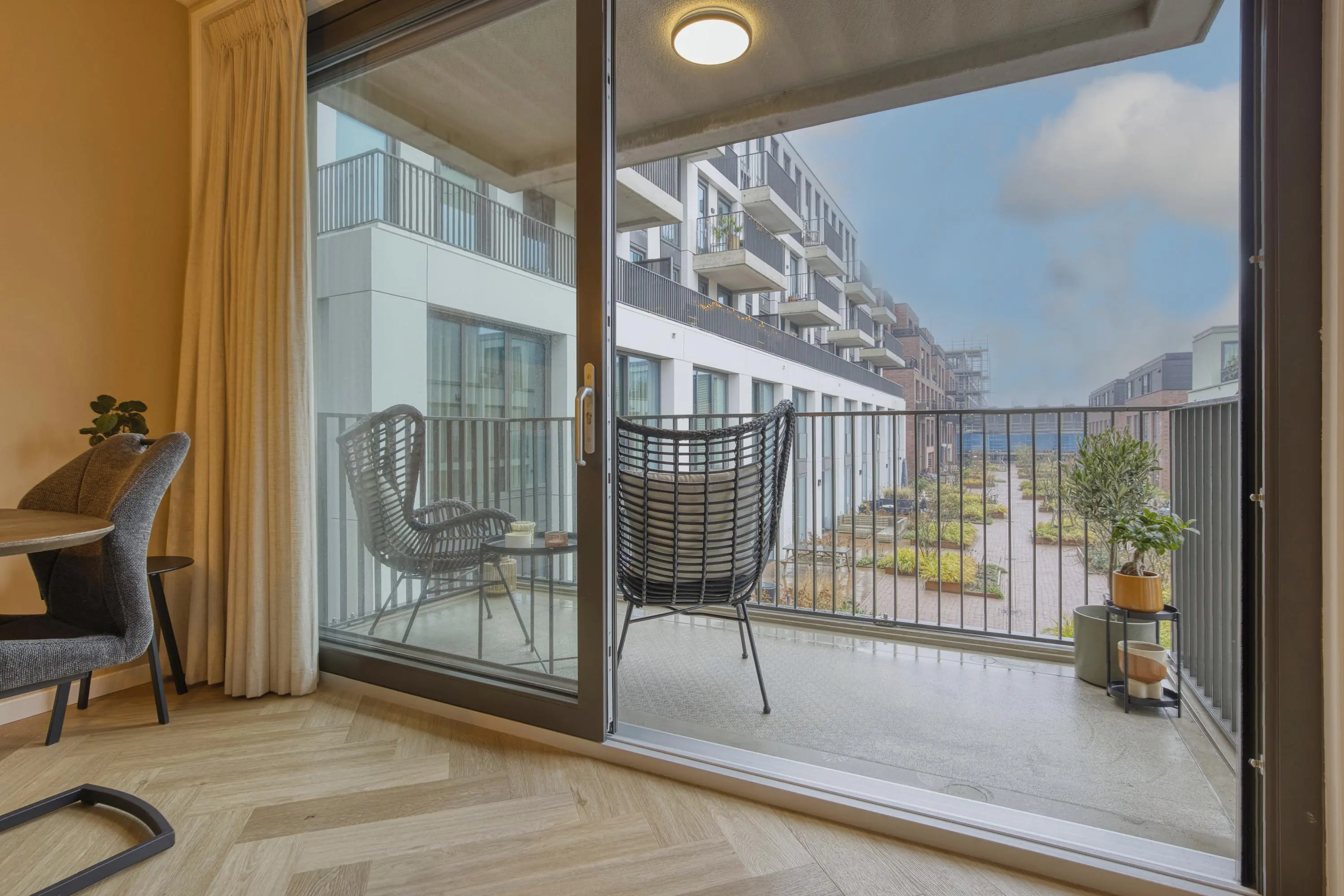 Centraal in de woning bevindt zich de moderne keuken, uitgerust met hoogwaardige inbouwapparatuur: inductiekookplaat met geïntegreerde afzuiging, vaatwasser, koelkast, vriezer, combi-oven, ruime lades en kastruimte. Dankzij de open opstelling heeft u direct doorloop naar zowel de woonkamer en het eetgedeelte, waardoor de woning licht, modern en open blijft. De woonkamer biedt door de logische indeling ruimte voor zowel een comfortabele zithoek als een ruime eettafel. De grote ramen zorgen voor een mooie lichtinval. Via deze ruimte betreedt u het balkon op het zonnige zuidoosten. Vanaf hier heeft u een vrij uitzicht over de sfeervolle binnenplaats. ’s Avonds is de binnenplaats mooi verlicht, waardoor dit een heerlijke plek is om te ontspannen.