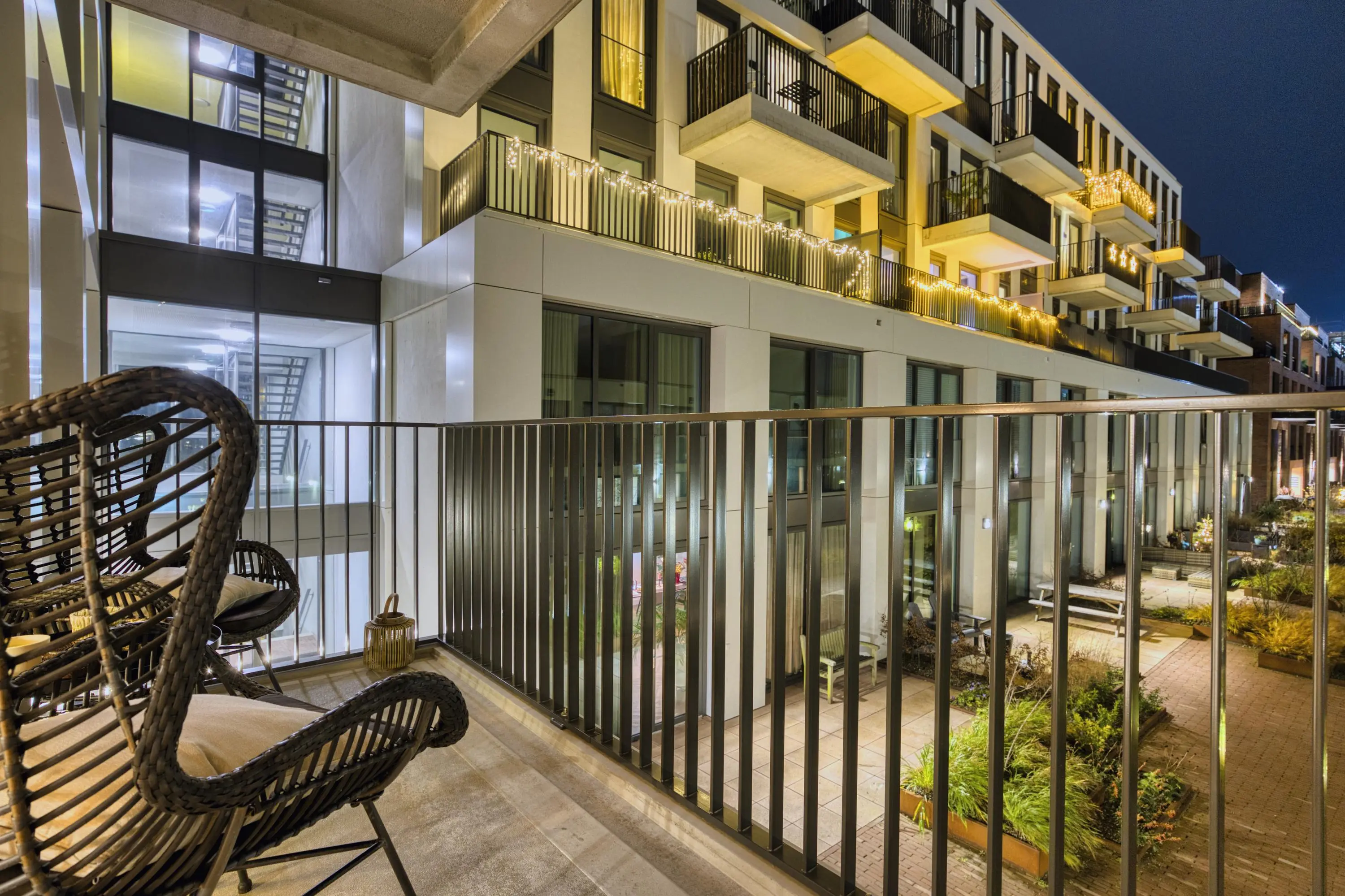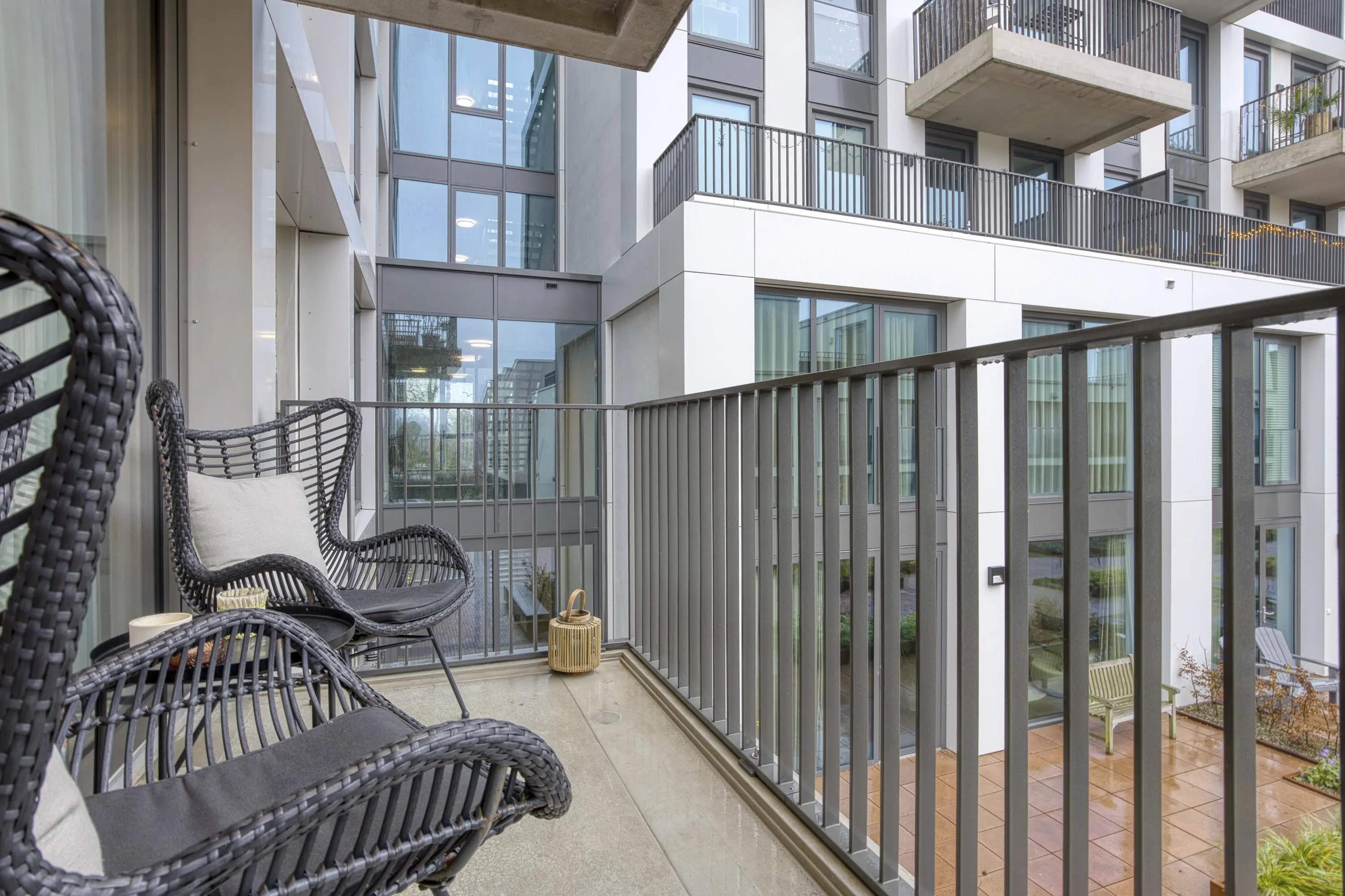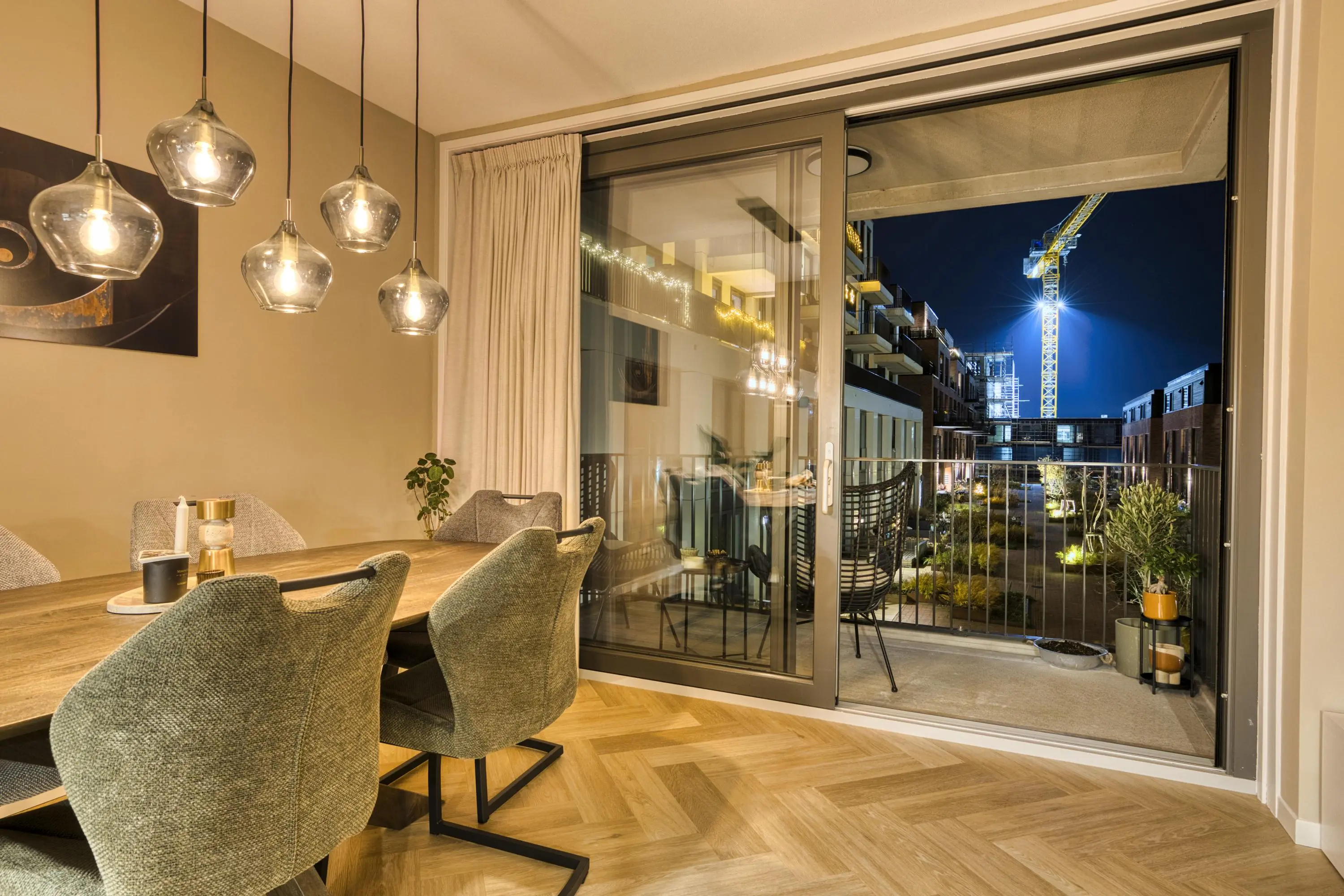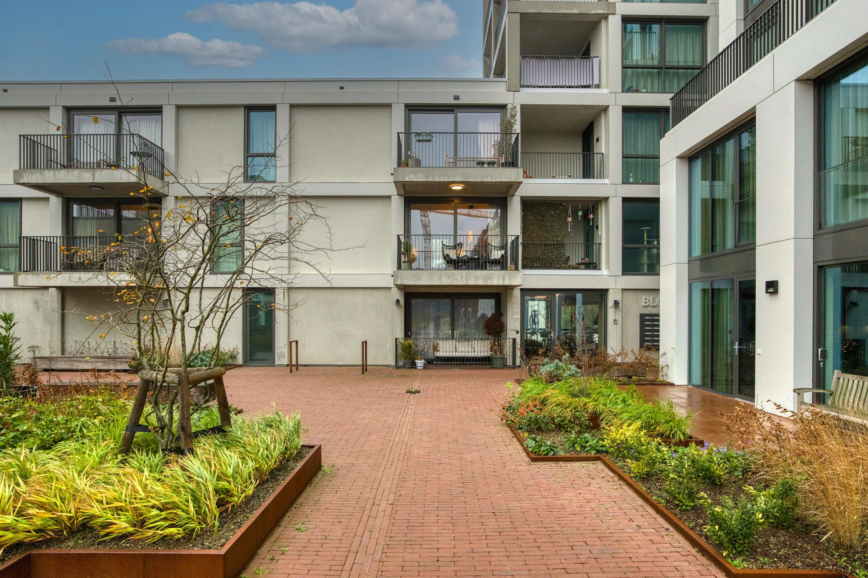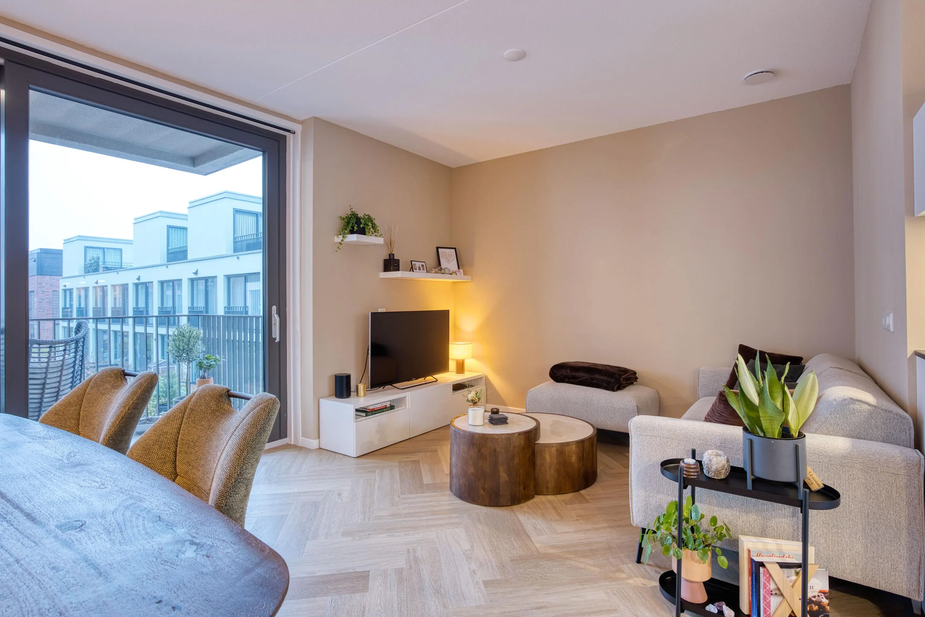 Centraal in de woning bevindt zich de moderne keuken, uitgerust met hoogwaardige inbouwapparatuur: inductiekookplaat met geïntegreerde afzuiging, vaatwasser, koelkast, vriezer, combi-oven, ruime lades en kastruimte. Dankzij de open opstelling heeft u direct doorloop naar zowel de woonkamer en het eetgedeelte, waardoor de woning licht, modern en open blijft. De woonkamer biedt door de logische indeling ruimte voor zowel een comfortabele zithoek als een ruime eettafel. De grote ramen zorgen voor een mooie lichtinval. Via deze ruimte betreedt u het balkon op het zonnige zuidoosten. Vanaf hier heeft u een vrij uitzicht over de sfeervolle binnenplaats. ’s Avonds is de binnenplaats mooi verlicht, waardoor dit een heerlijke plek is om te ontspannen.