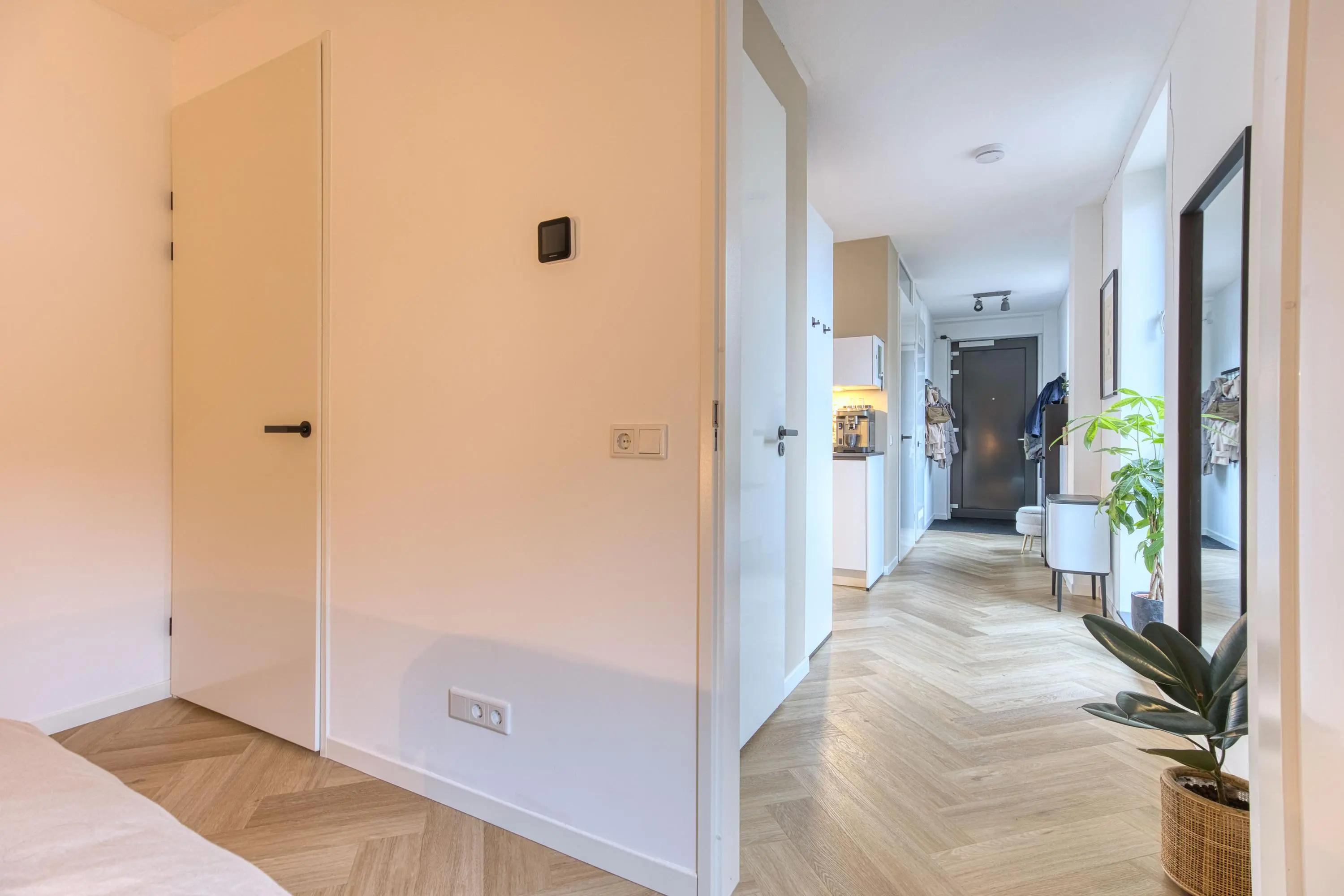Via uw eigen opgang bereikt u het appartement op de eerste etage. Bij binnenkomst betreedt u de verrassend lichte, diepe hal waarin de hoge plafonds en het natuurlijke licht direct voor een ruimtelijk gevoel zorgen. De gehele woning is voorzien van een nette visgraat PVC-vloer, wat zorgt voor een warme en moderne uitstraling. Aan de rechterzijde van de hal vindt u de meterkast en aansluitend de technische ruimte. In deze ruimte bevindt zich onder andere de warmtepompboiler, (een energiezuinig systeem dat warmte uit de lucht haalt om efficiënt warm water te produceren). Hierdoor wordt het appartement volledig gasloos verwarmd en voorzien van warm water. Daarnaast vindt u hier de WTW-unit (warmte-terug-win systeem) die zorgt voor frisse lucht in huis en efficiënt hergebruik van warmte, wat bijdraagt aan een gezond en energiezuinig binnenklimaat. Deze ruimte biedt bovendien extra bergruimte voor het opbergen van uw spullen.