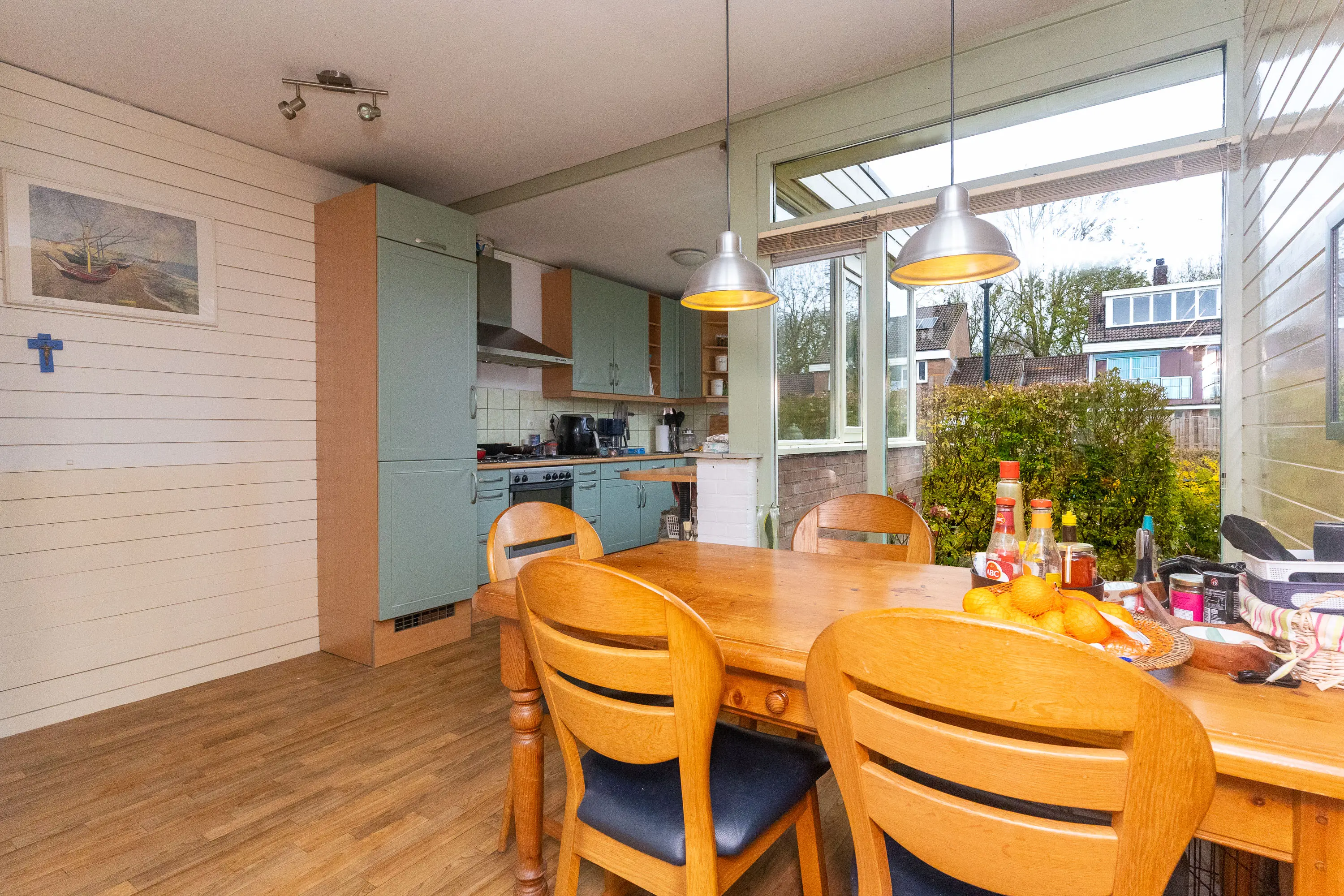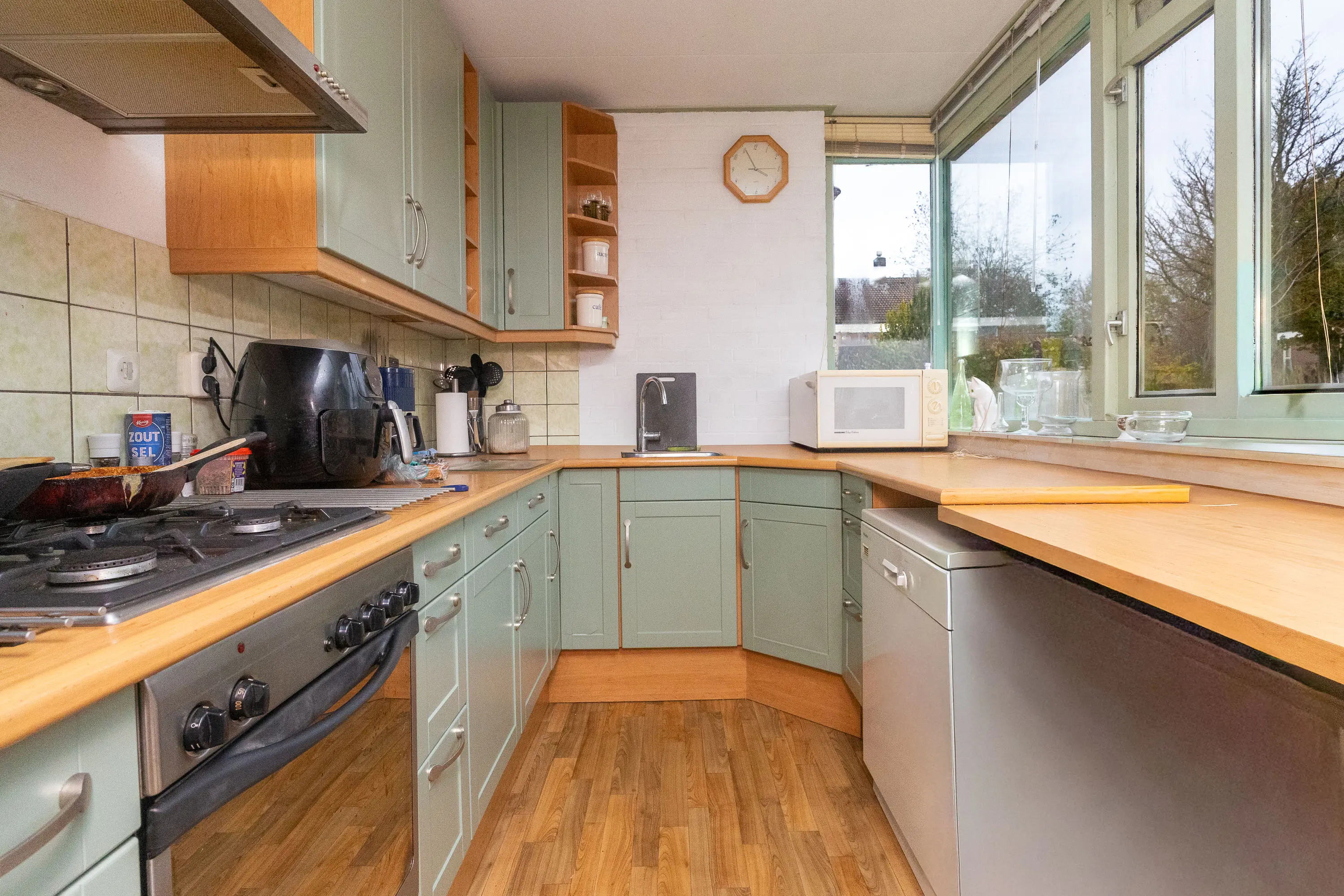 De half open keuken aan de voorzijde is praktisch ingedeeld en biedt veel kastruimte en werkoppervlak. Vanuit hier heb je fijn uitzicht op de voorzijde en speelplaats voor de kleinere kinderen.
