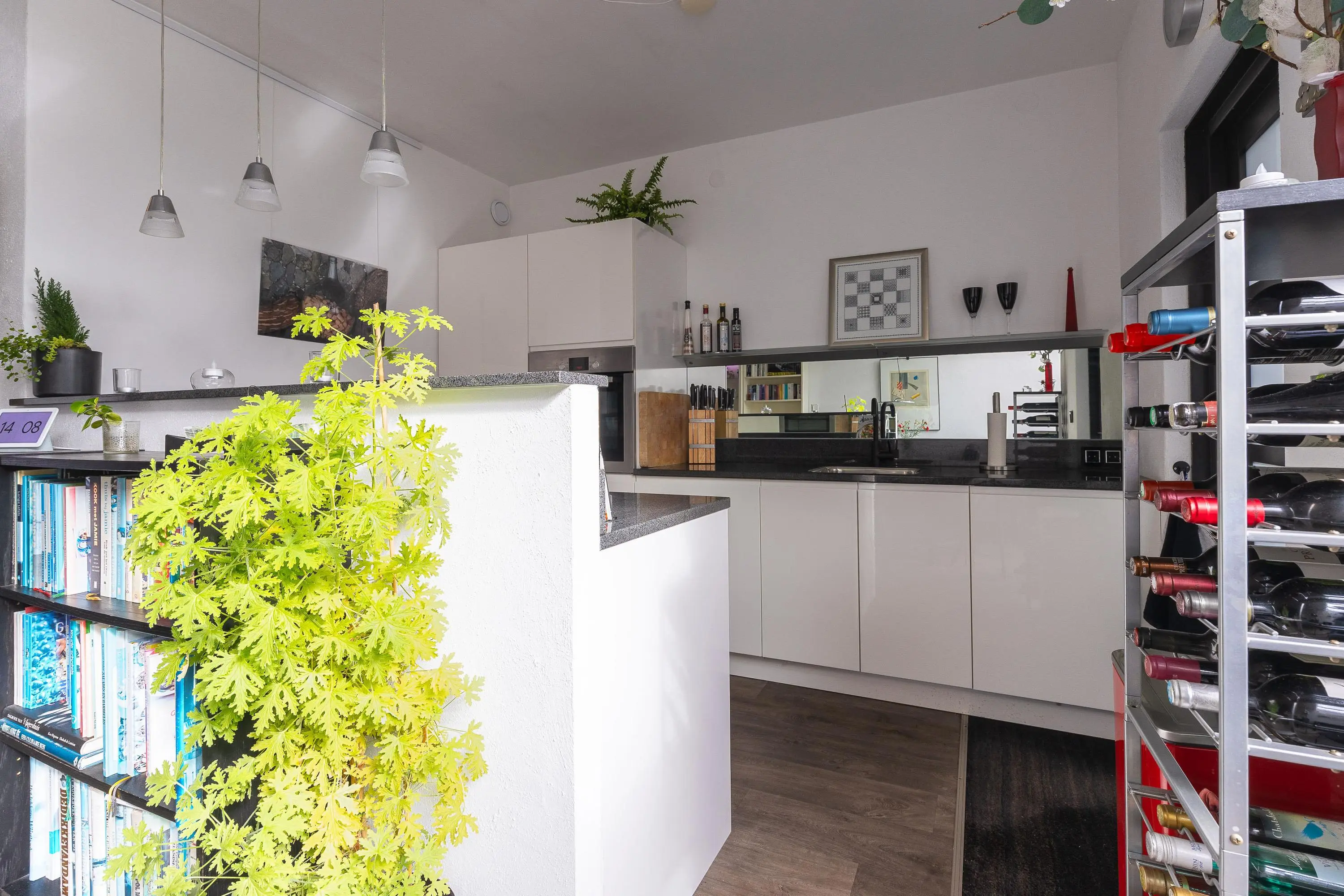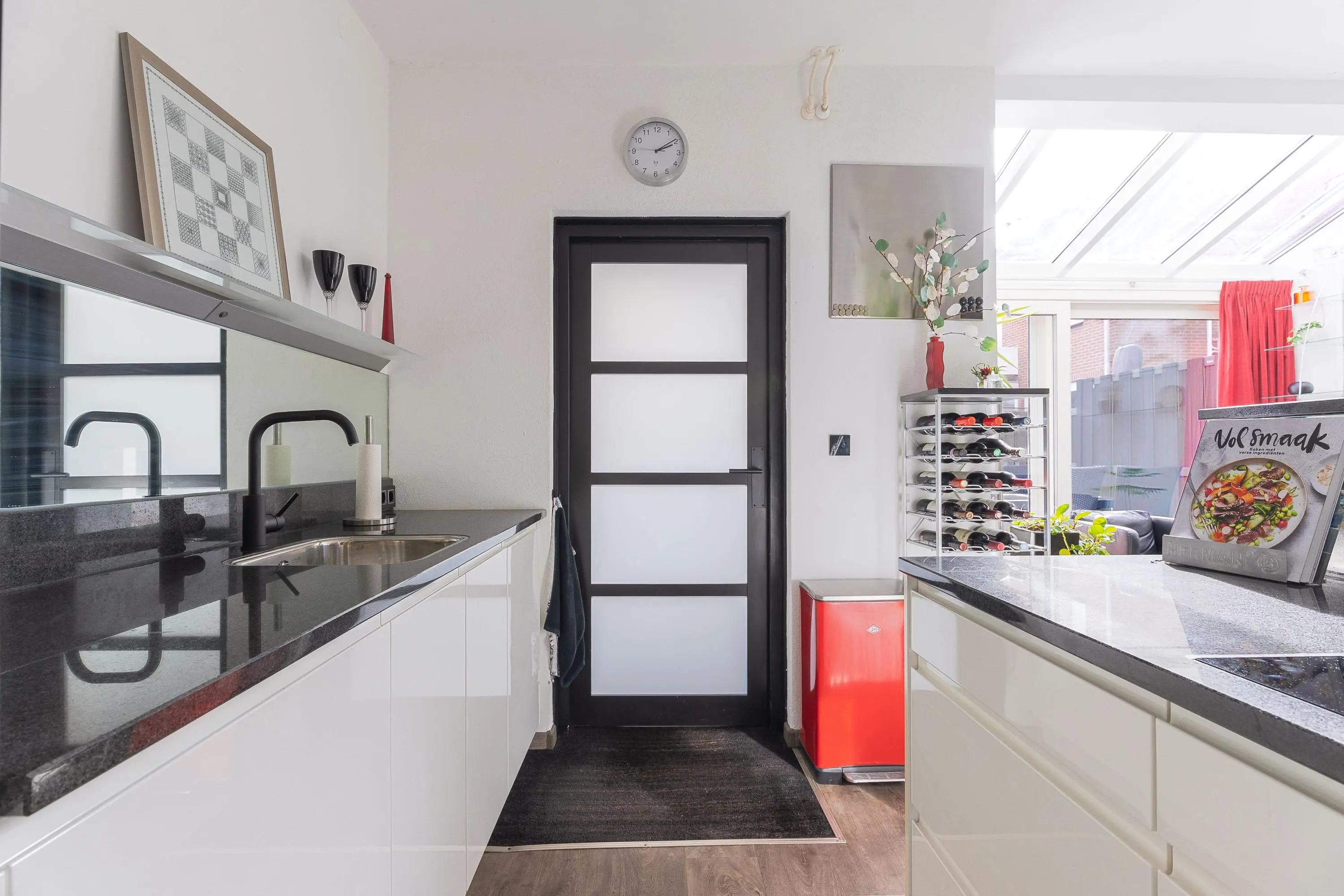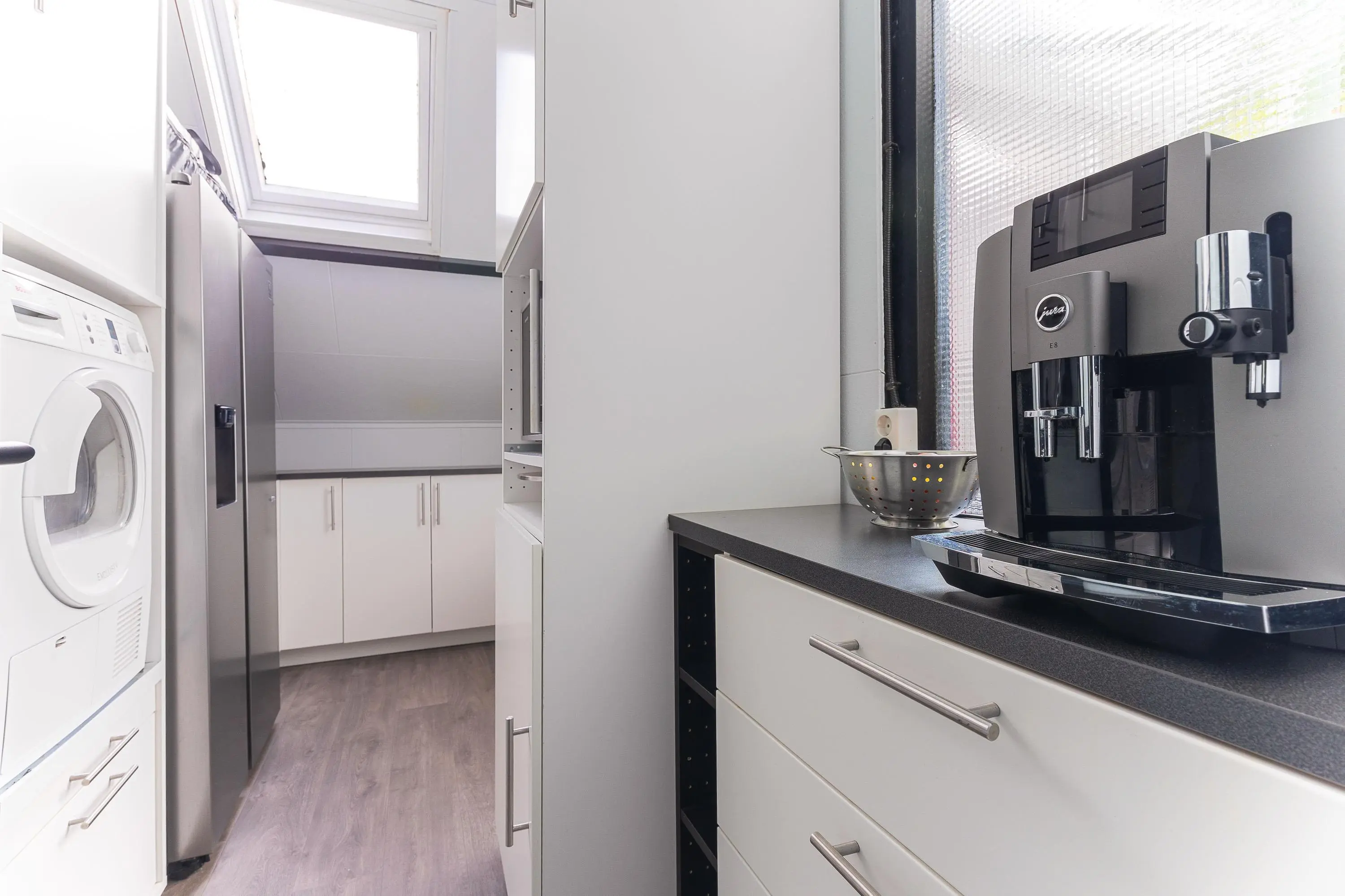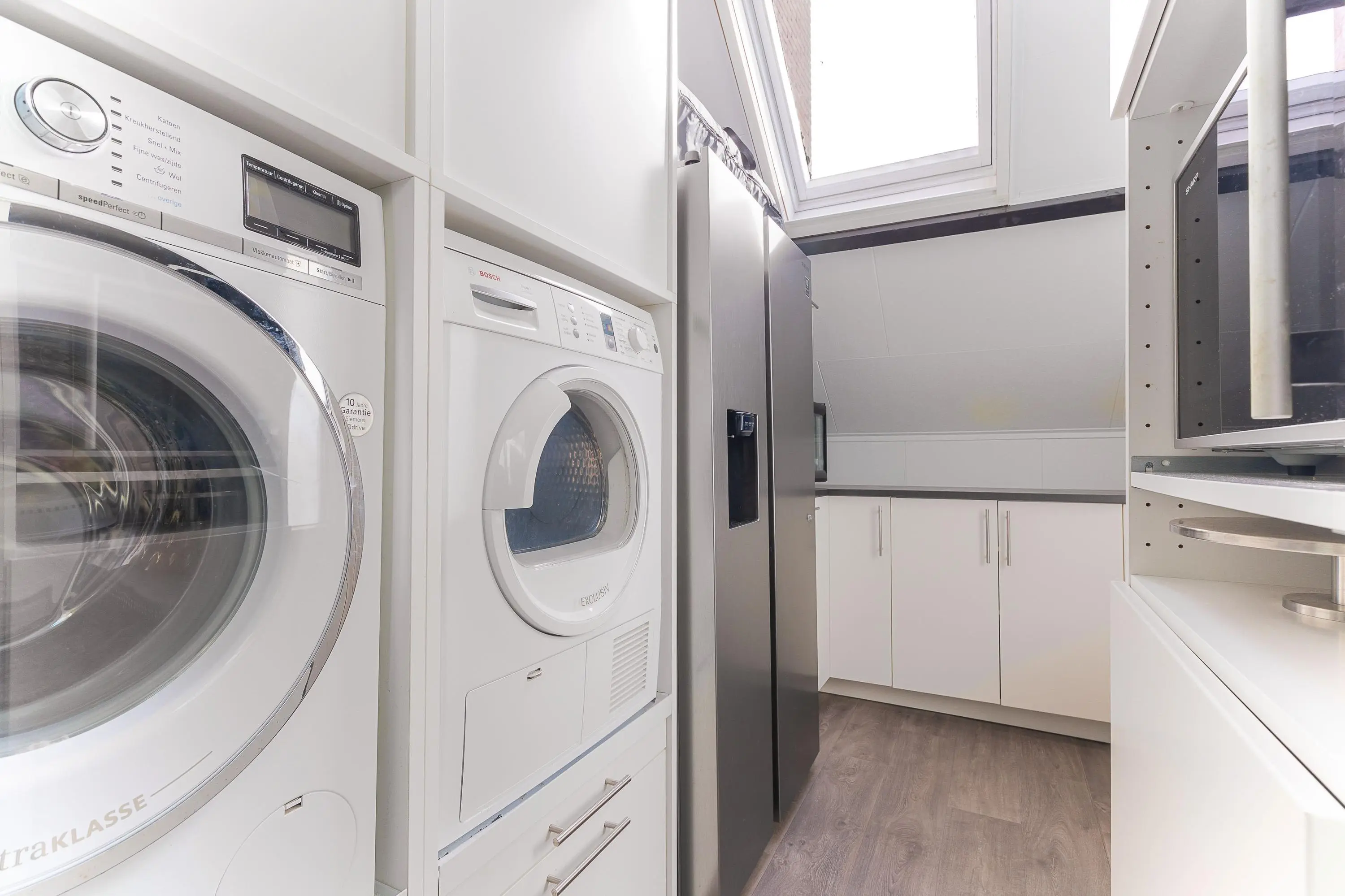De moderne open keuken is voorzien van diverse inbouwapparatuur en sluit naadloos aan op de leefruimte. Aansluitend vind je een zeer verzorgde berging, die fungeert als verlengstuk van de keuken – ideaal voor extra opslag en gebruiksgemak.