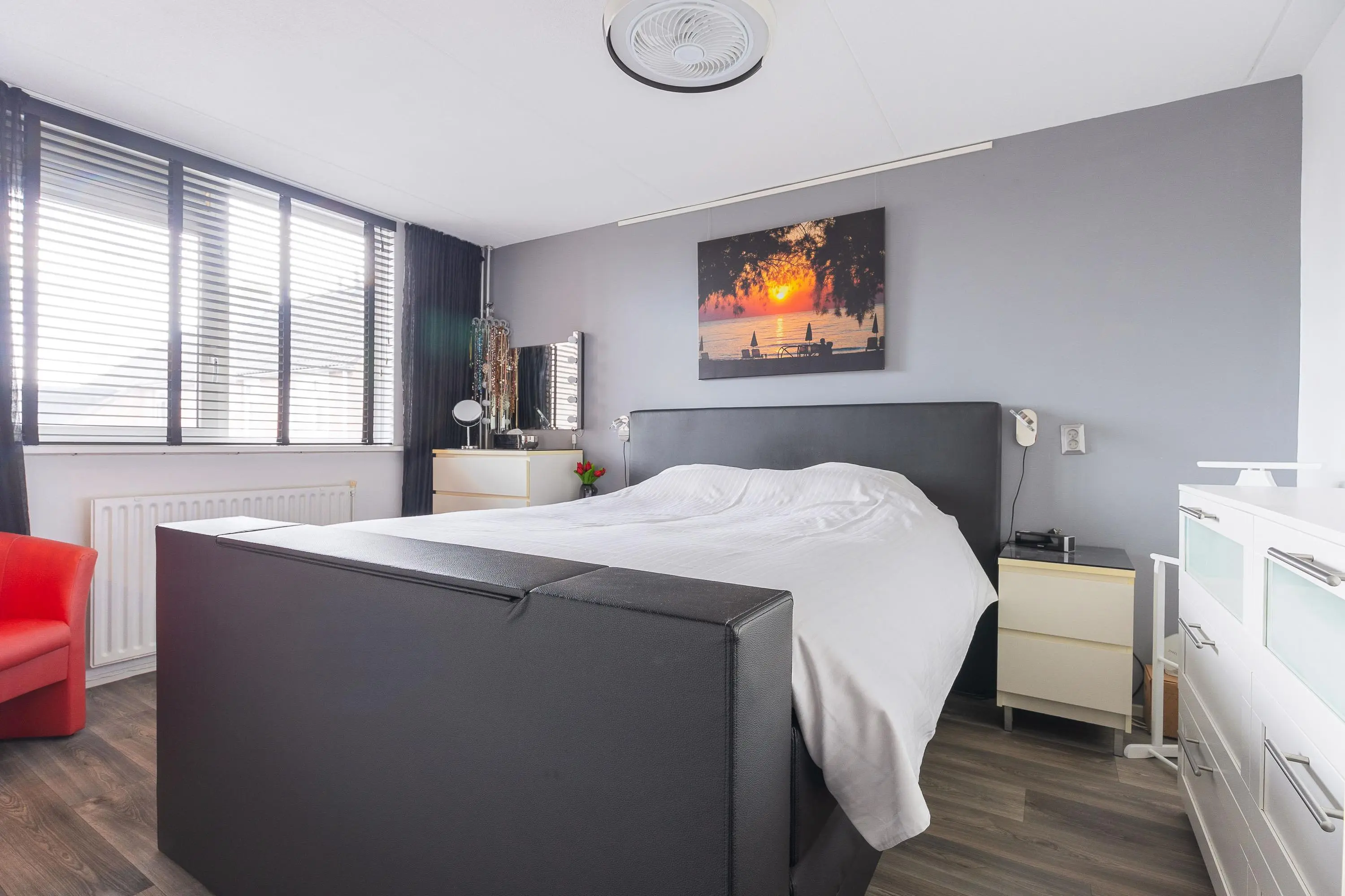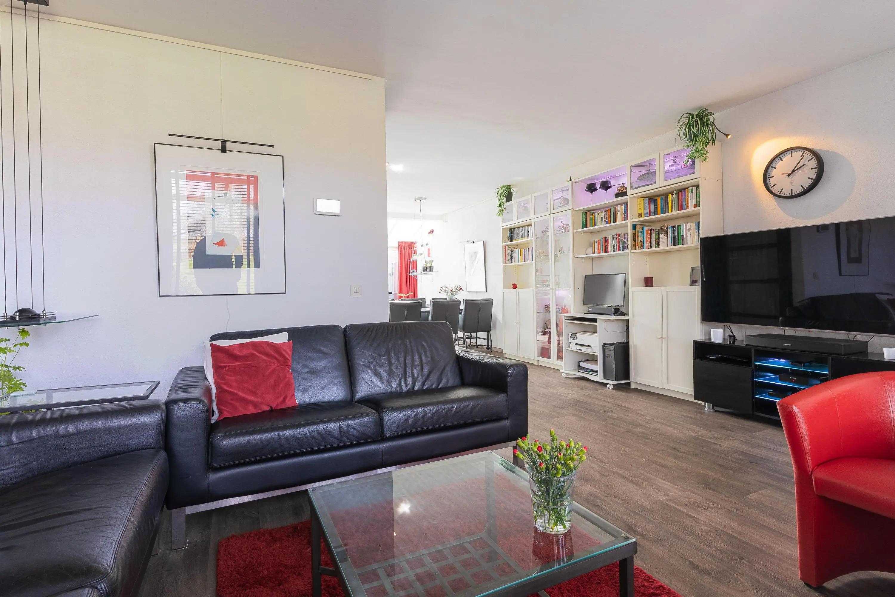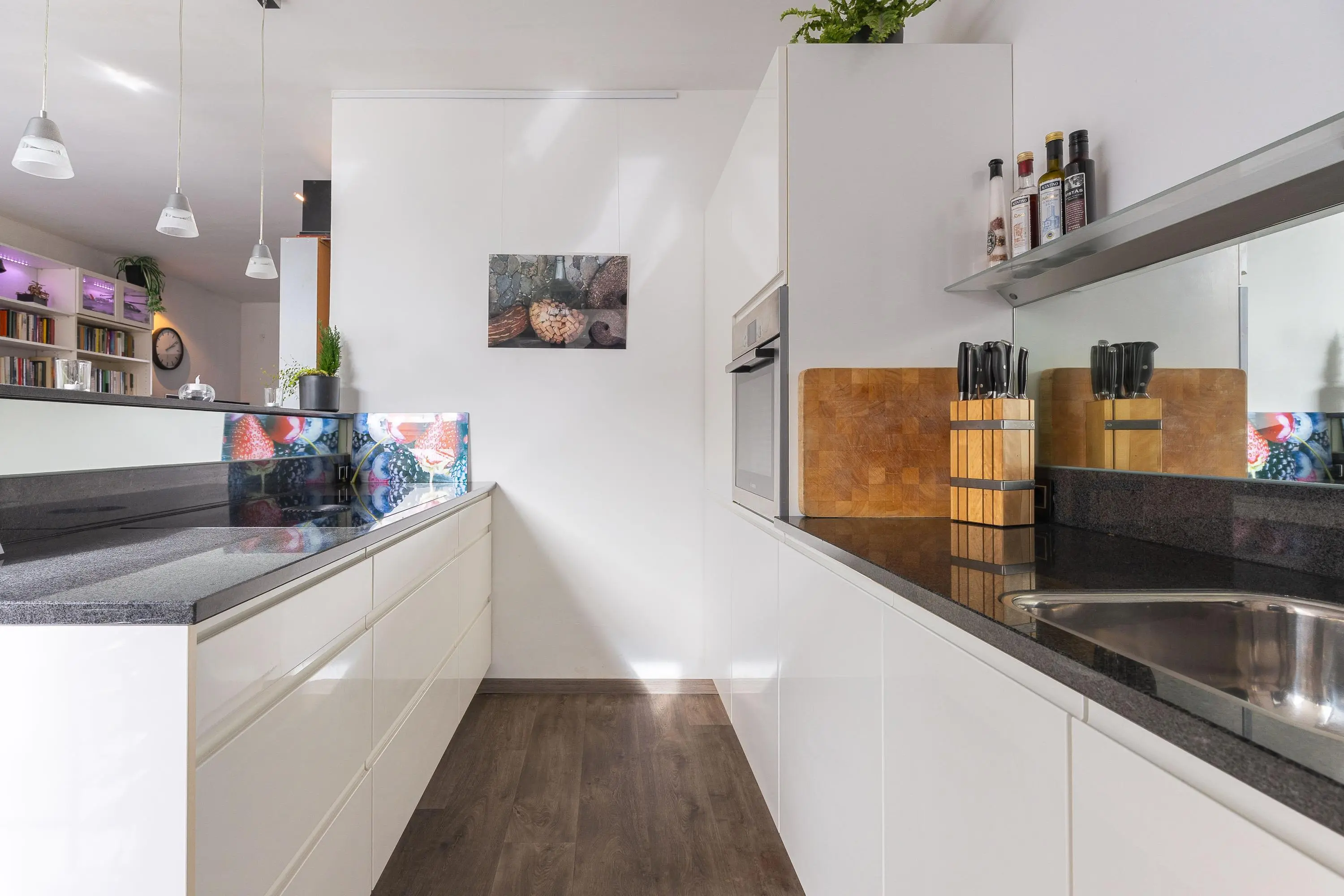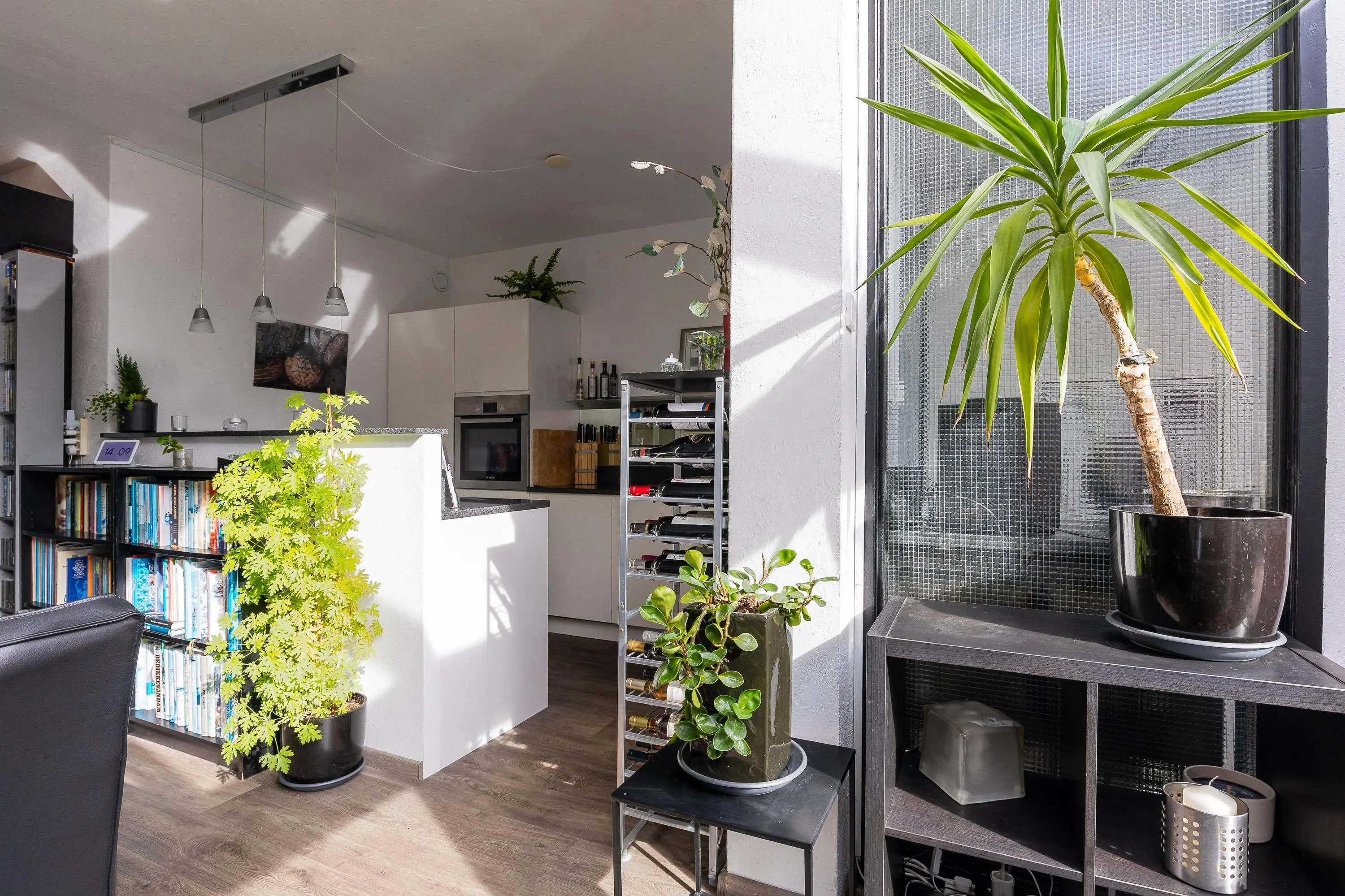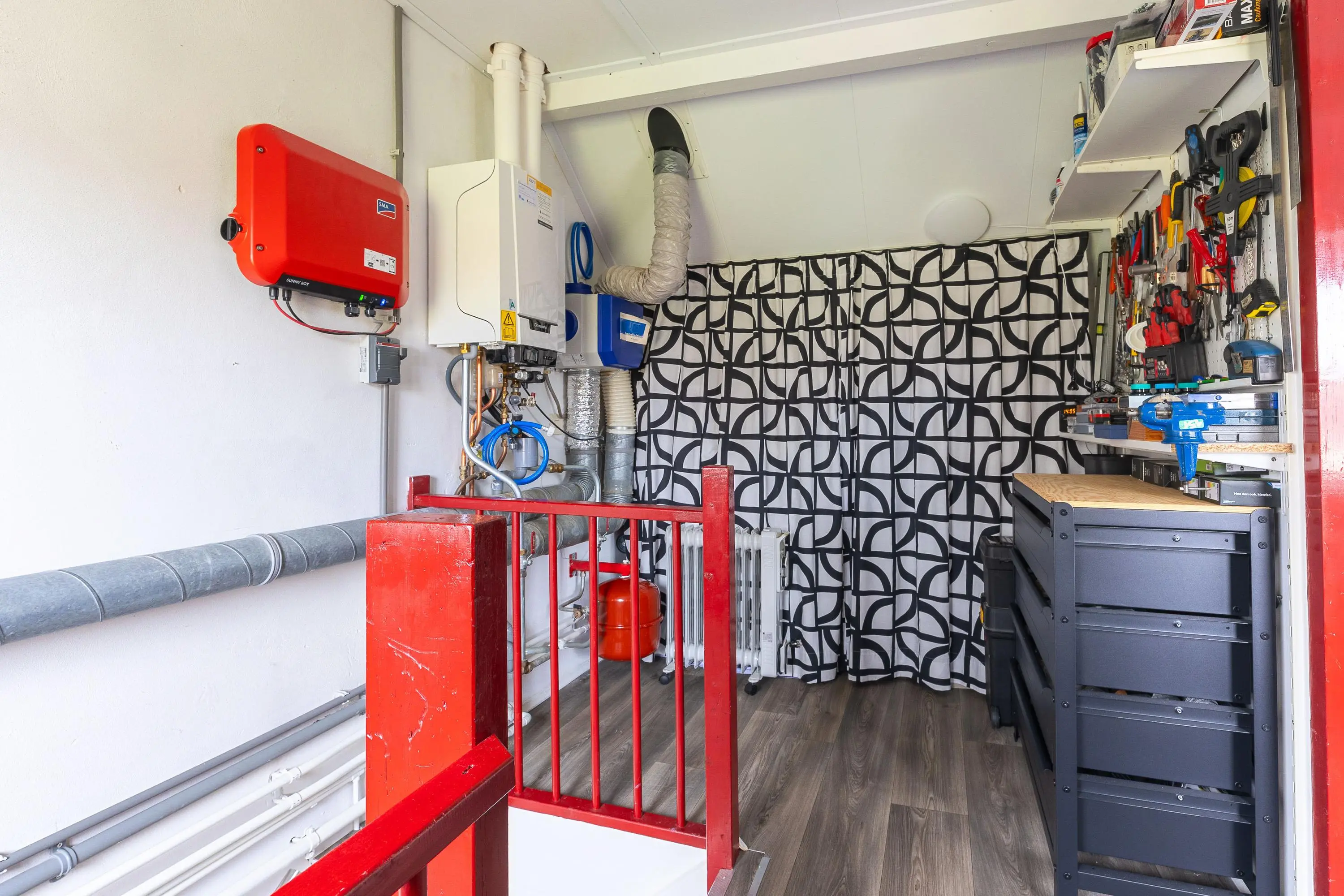 De moderne open keuken is voorzien van diverse inbouwapparatuur en sluit naadloos aan op de leefruimte. Aansluitend vind je een zeer verzorgde berging, die fungeert als verlengstuk van de keuken – ideaal voor extra opslag en gebruiksgemak.