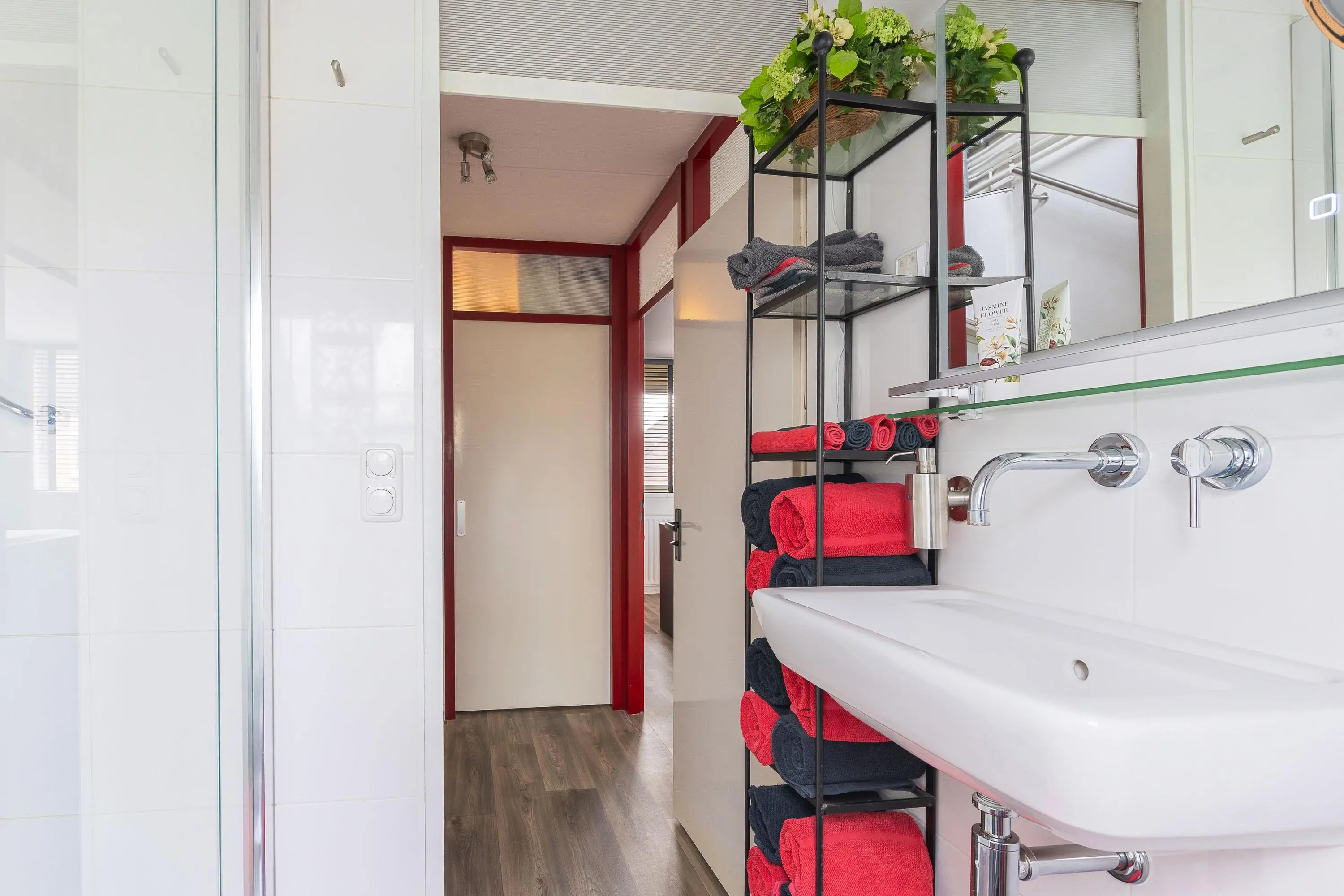 De verzorgde badkamer is van alle gemakken voorzien waaronder een toilet, wastafel douche en een heerlijk twee persoons jacuzzi bad om volledig tot rust te komen.