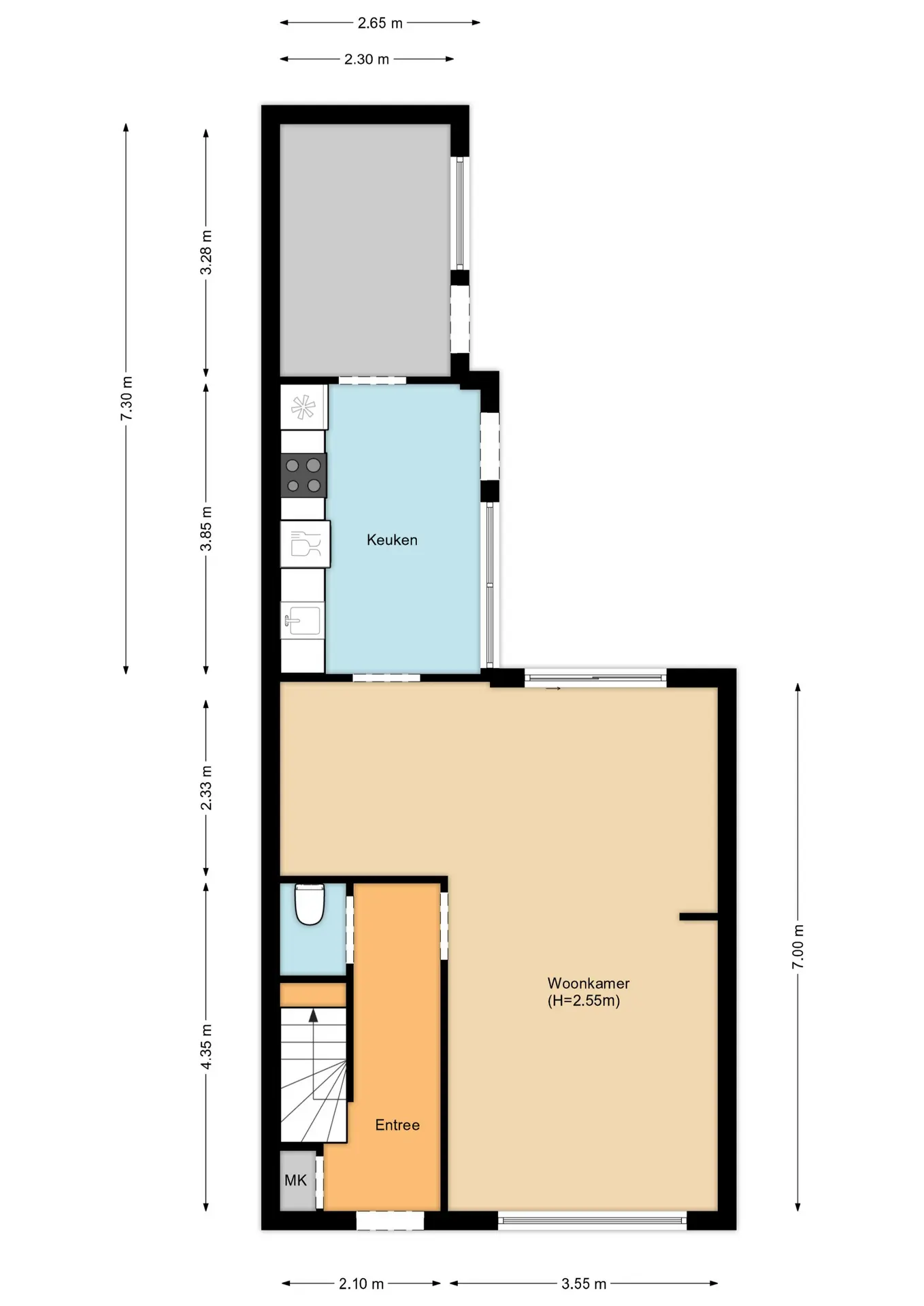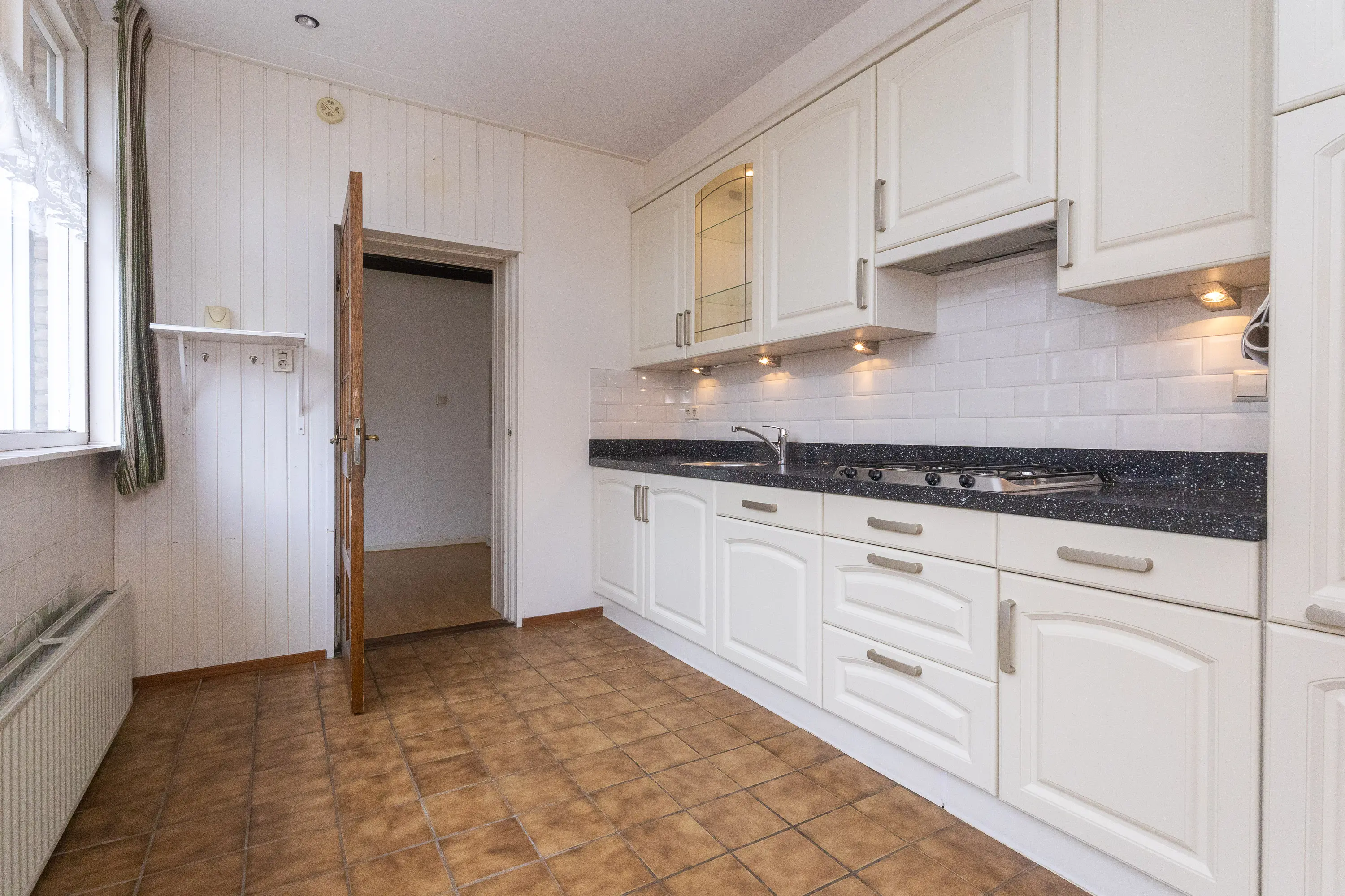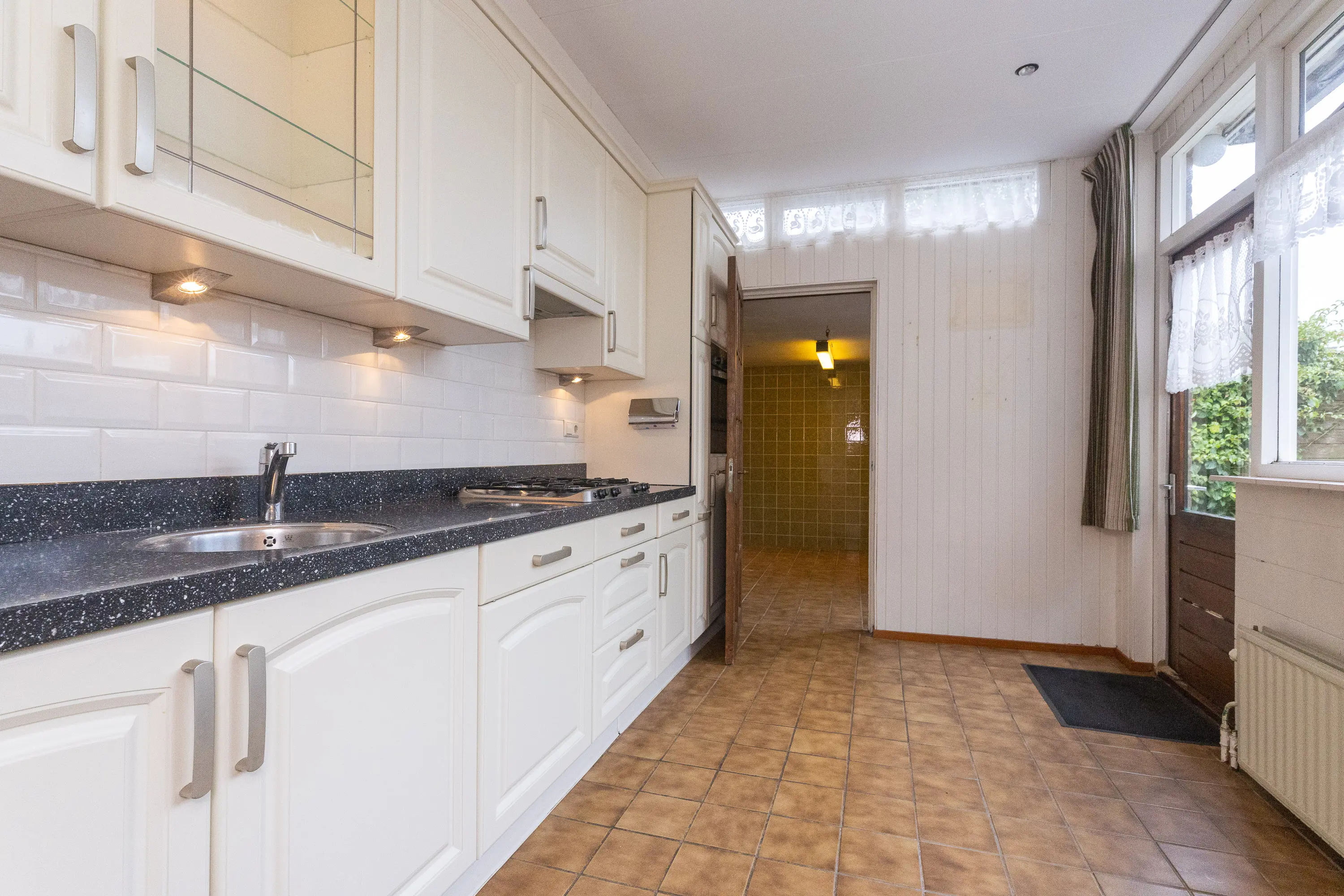De voortuin met groen en bloemen verwelkomt u direct bij aankomst. Via de overdekte entree komt u in de hal met toilet, meterkast, trapopgang, trapkast en toegang tot de woonkamer. De royale woonkamer is heerlijk licht dankzij de grote ramen en de aluminium schuifpui naar de achtertuin. Aan de achterzijde bevindt zich de ruime keuken, voorzien van diverse inbouwapparatuur zoals een koelkast, oven, vaatwasser, 4-pits gaskookplaat, natuurstenen aanrechtblad en elektrische boiler. Achter de keuken bevindt zich de praktische bijkeuken met witgoedaansluitingen en extra bergruimte.