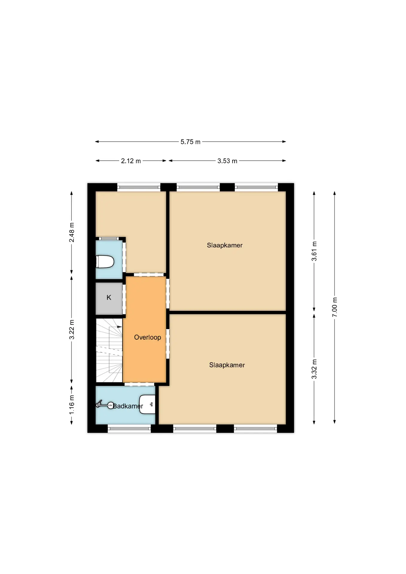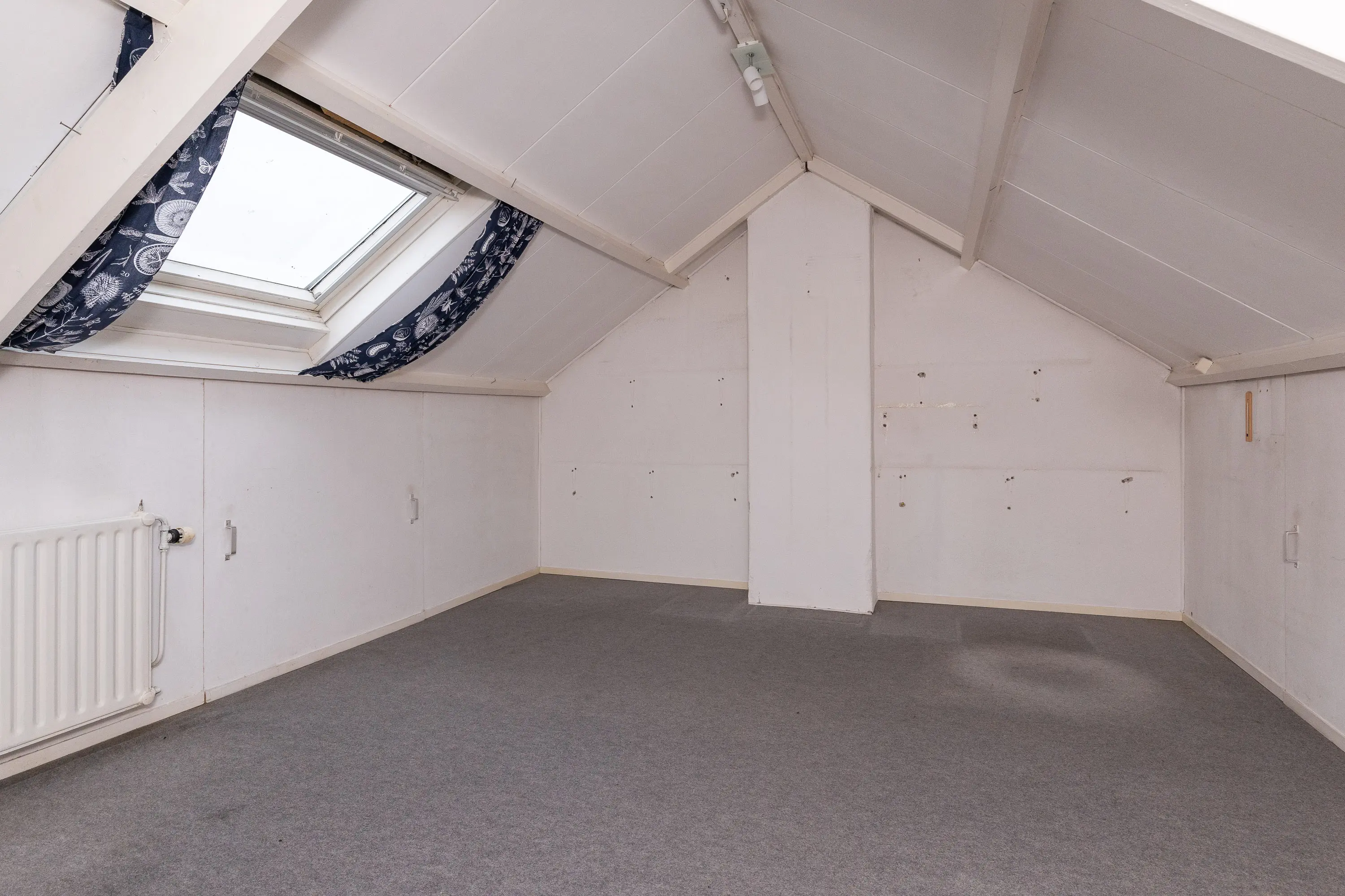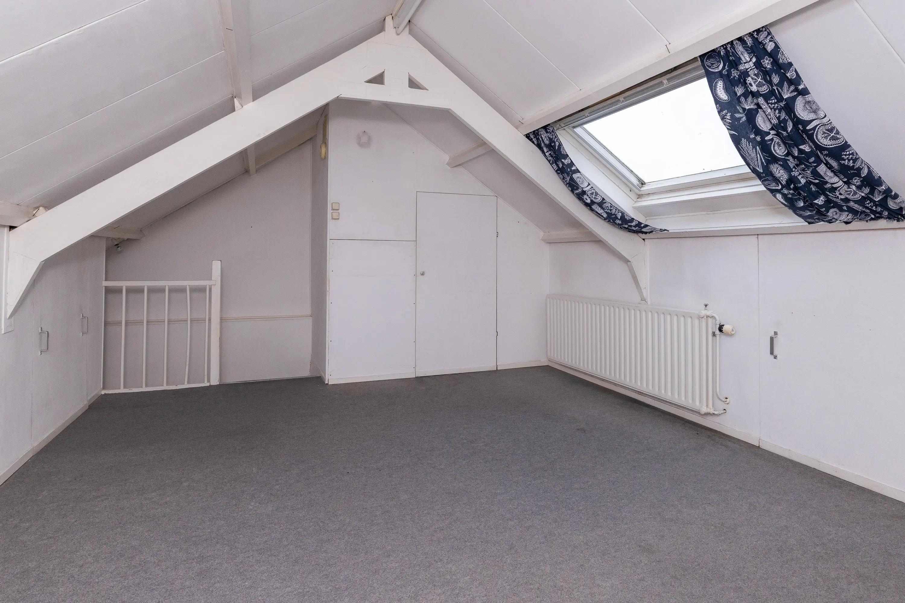 De vaste trap leidt naar de tweede verdieping met een groot dakraam, radiator en veel bergruimte. Hier is ook de cv-installatie (2024) keurig weggewerkt in een kast. Deze verdieping kan desgewenst ook worden ingericht als extra slaapkamer, hobbykamer of thuiswerkplek.