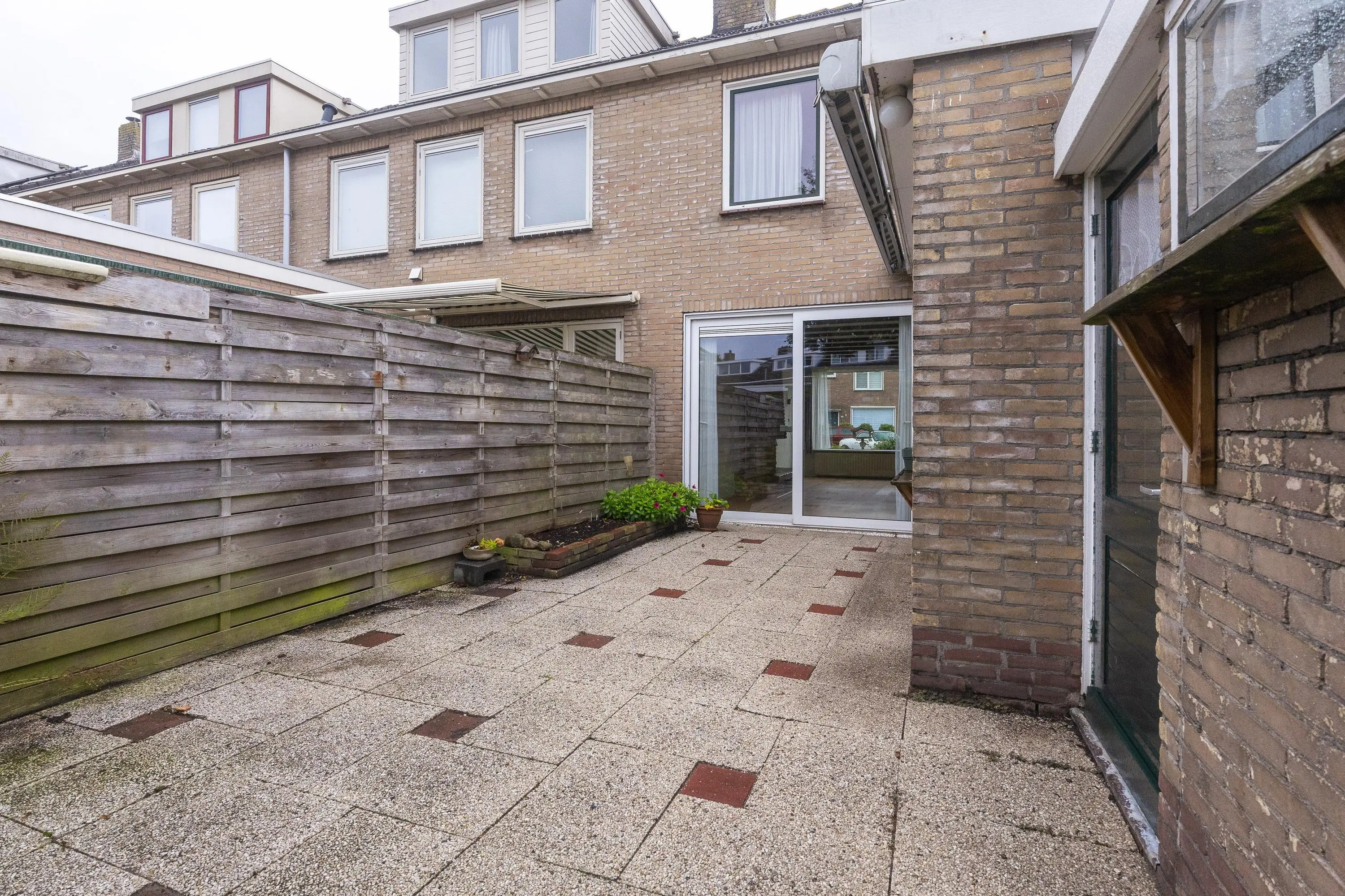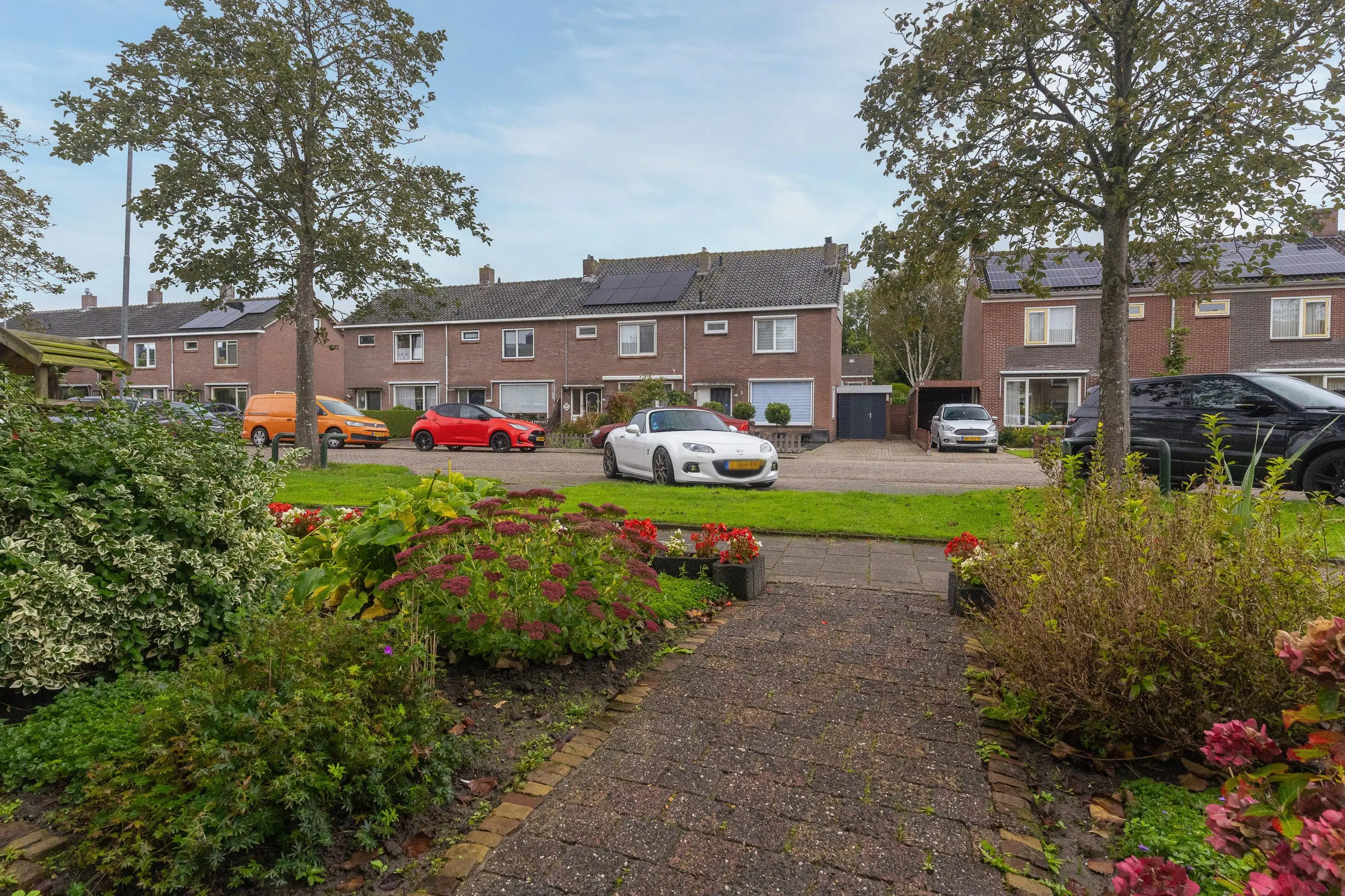 een zonnescherm, bestrating, borders met beplanting en een achterom.