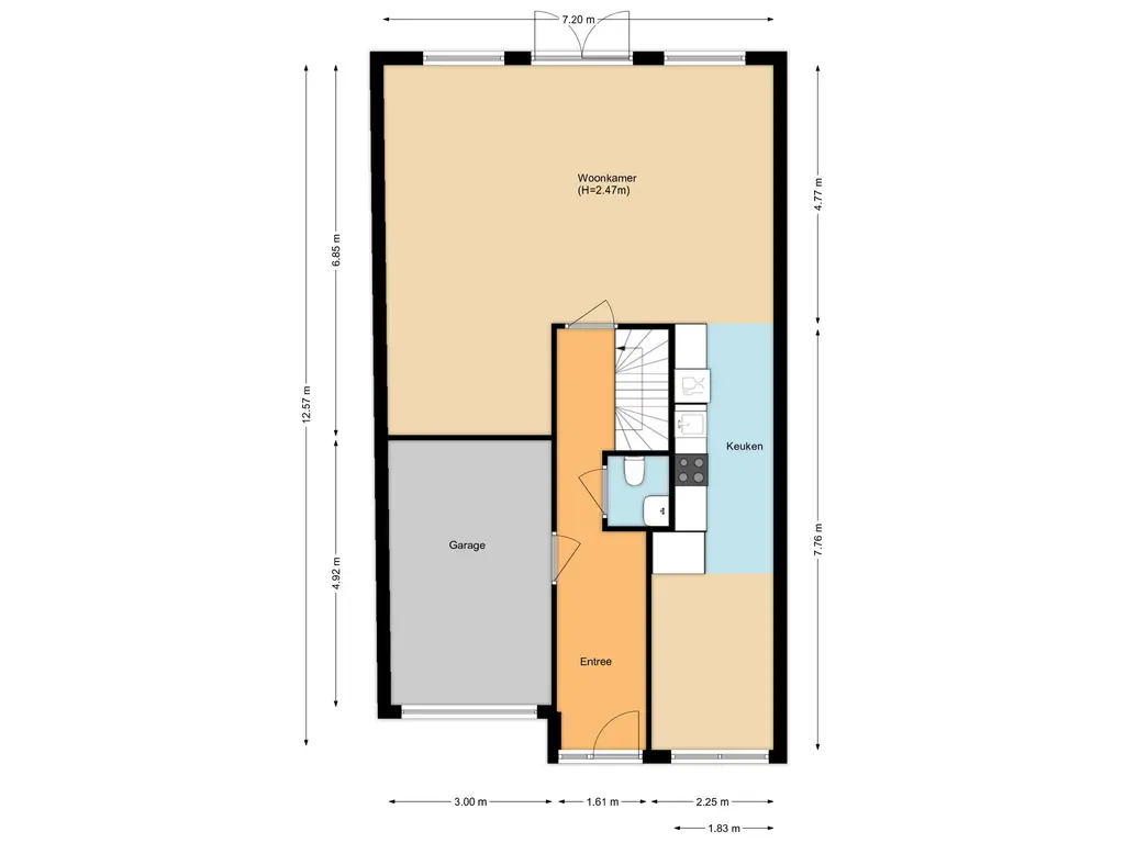 Via de ruime oprit bereik je de entree van de woning. In de hal bevinden zich de meterkast, het toilet en de trapopgang. Vanuit hier heb je toegang tot de inpandige garage en het woongedeelte. De woonkamer is royaal en licht, met grote raampartijen die zorgen voor een prettige lichtinval en een fijne verbinding met de tuin. Dankzij de vrije ligging aan de achterzijde geniet je hier van veel privacy en een rustig uitzicht.
