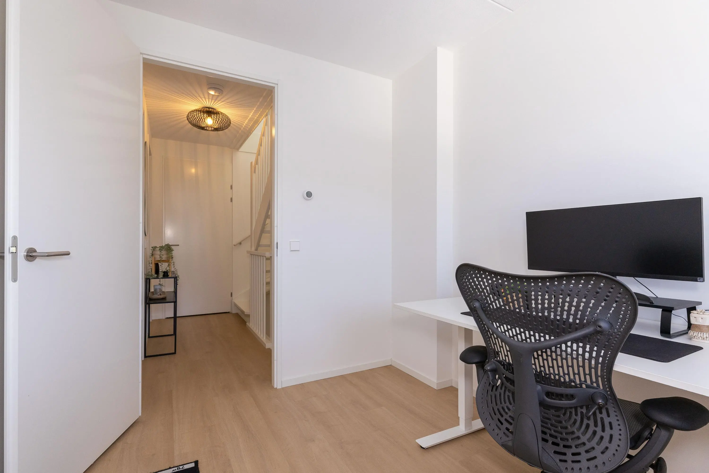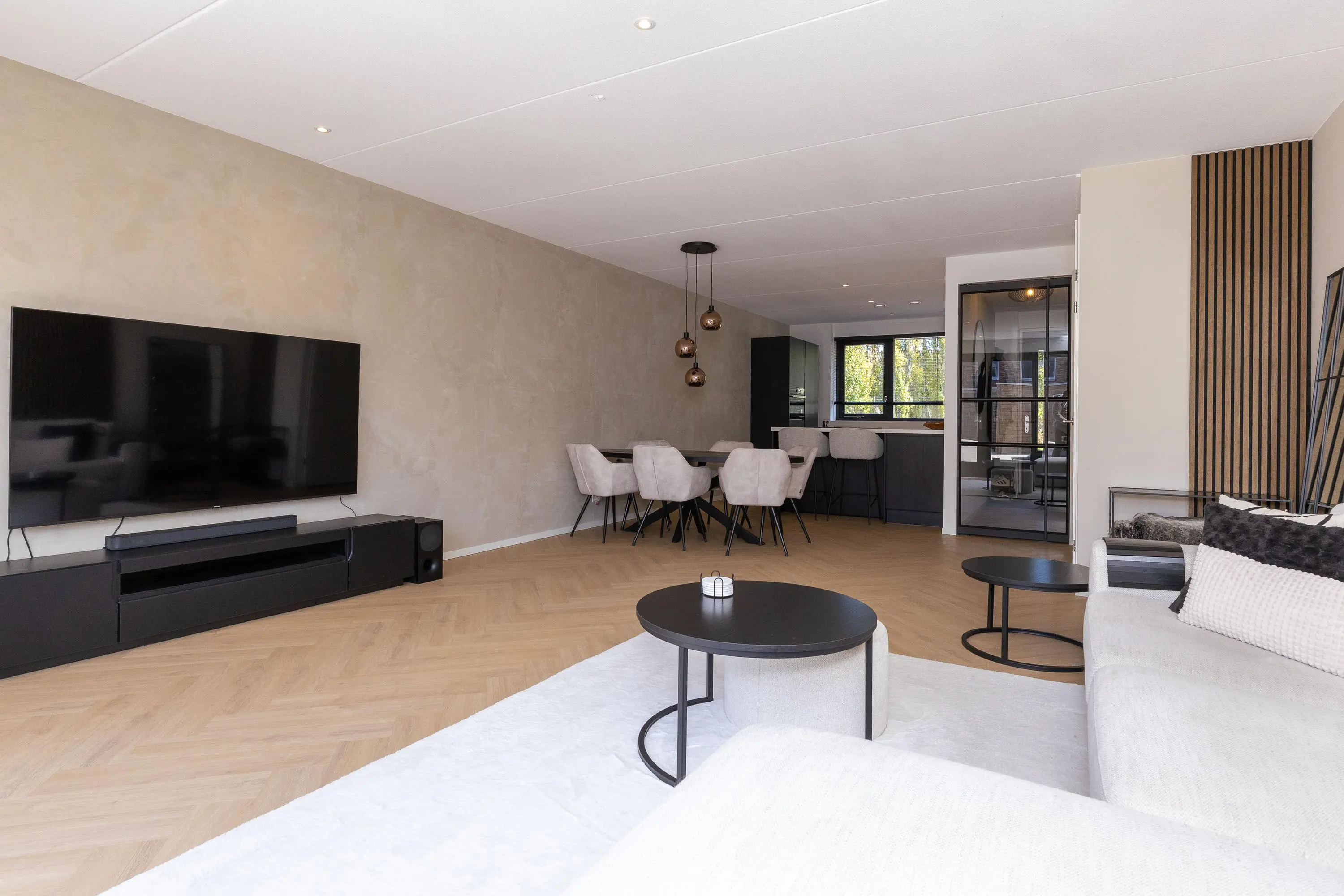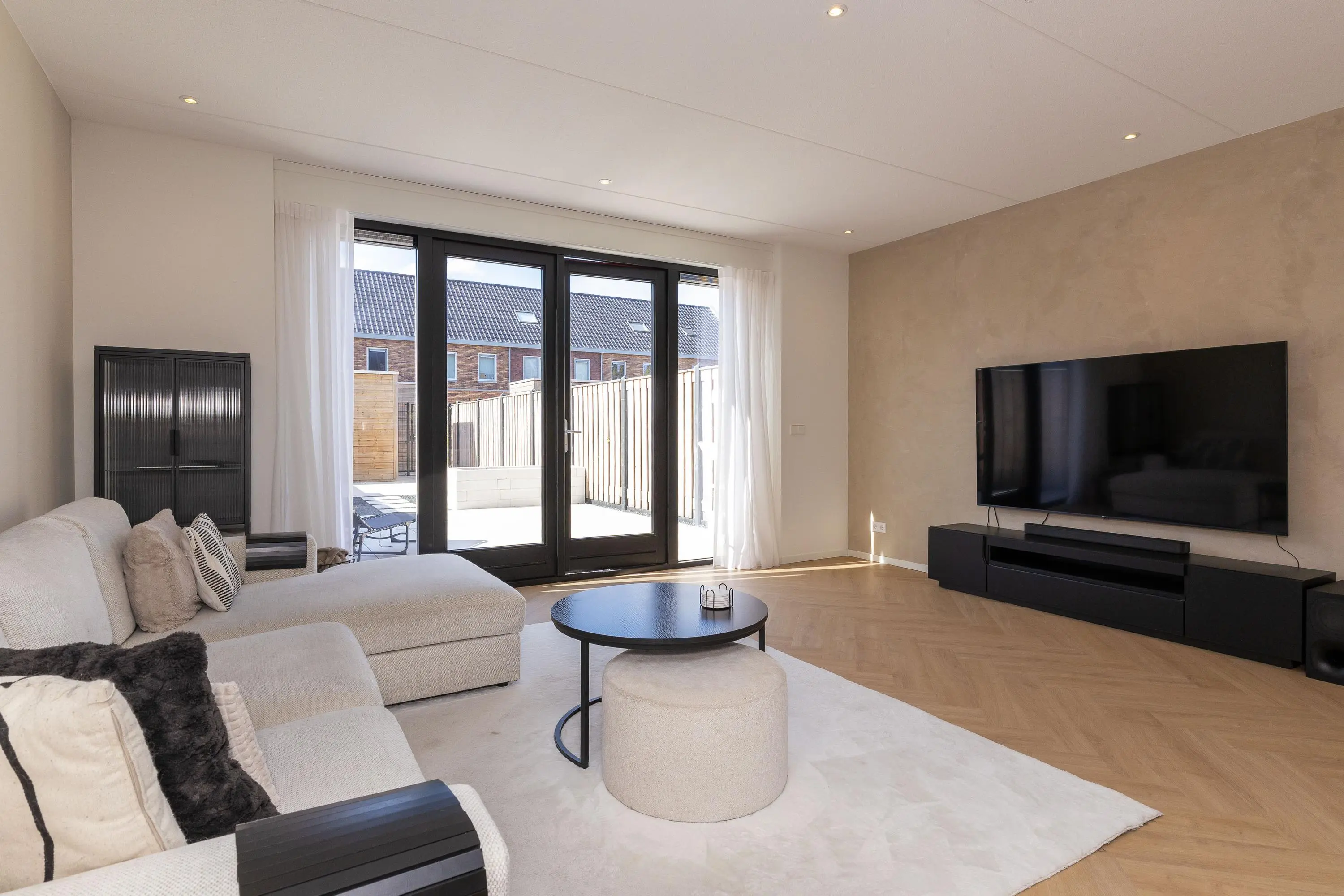 De woonkamer is heerlijk licht en ruim, mede dankzij de uitbouw aan de achterzijde. De lichte visgraatvloer en de zachte tinten op de wanden zorgen voor een rustige, moderne uitstraling. De grote raampartijen met openslaande deuren geven een mooie verbinding met de tuin en de ruime trapkast zorgt voor de nodige bergruimte.