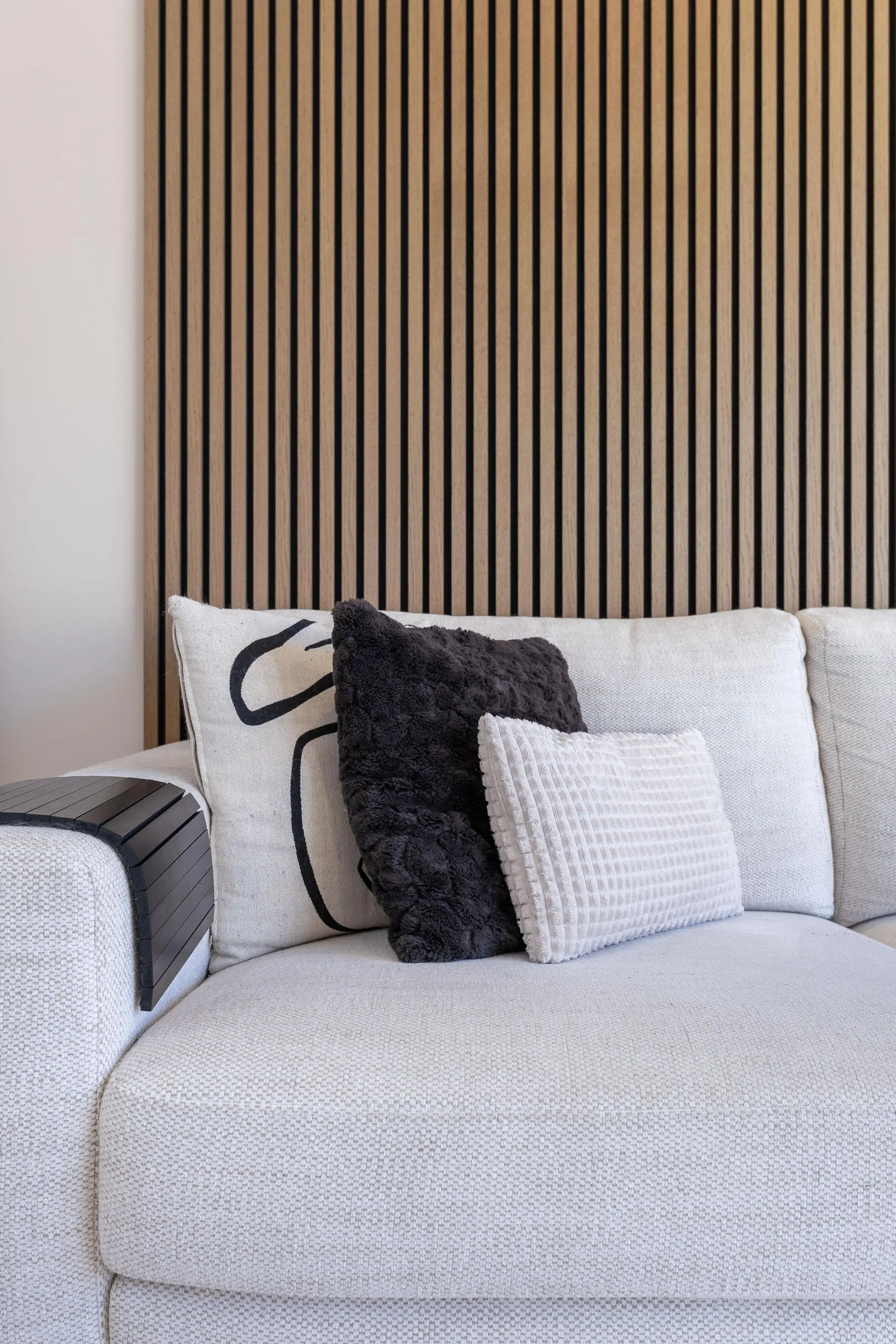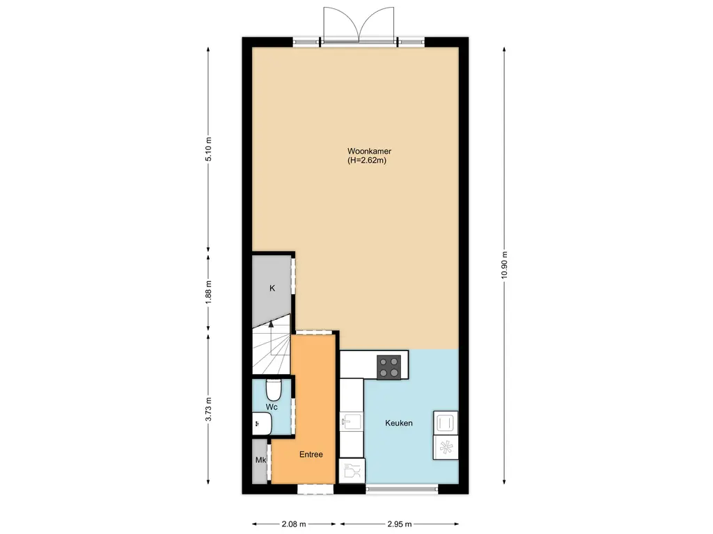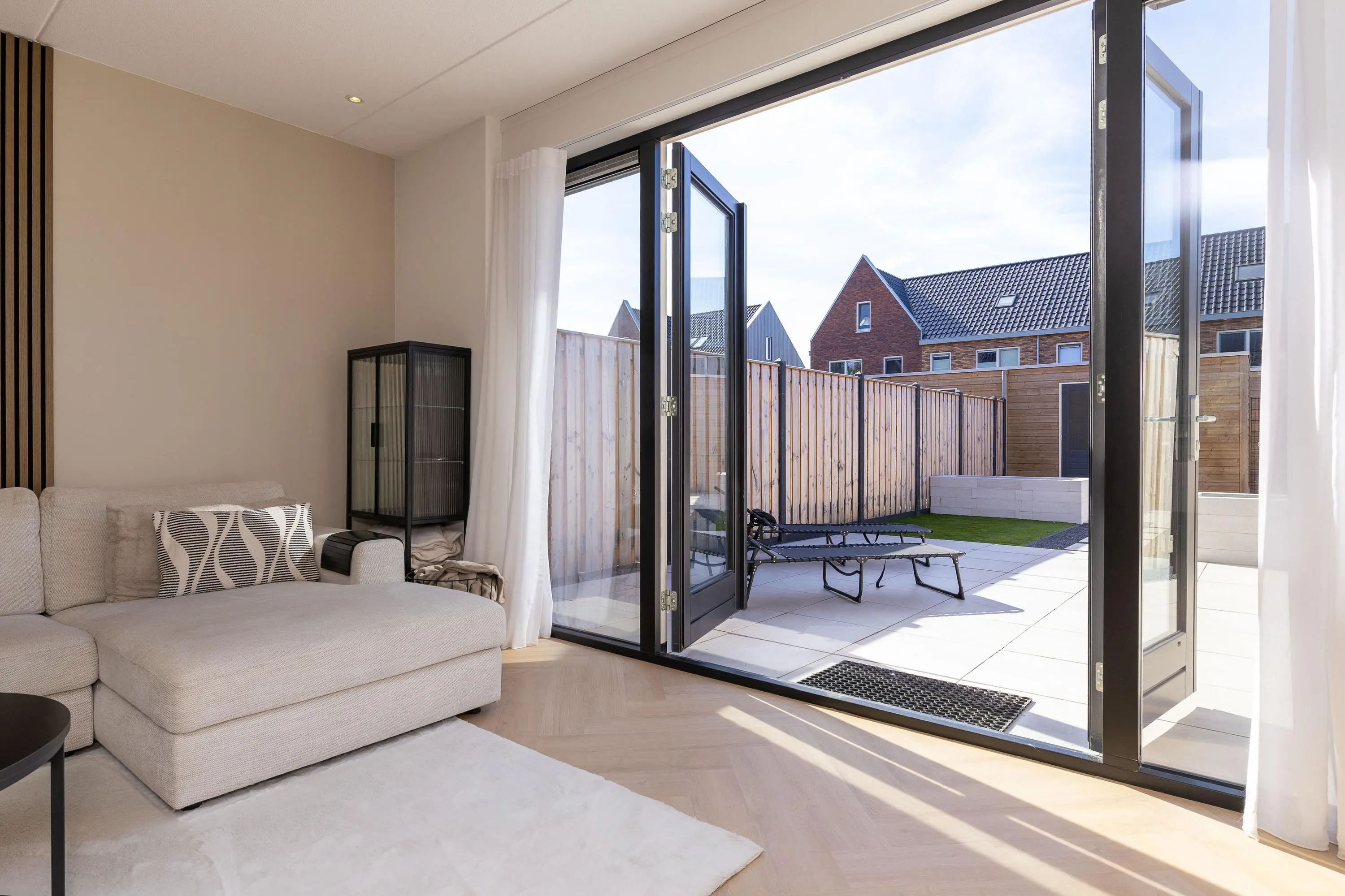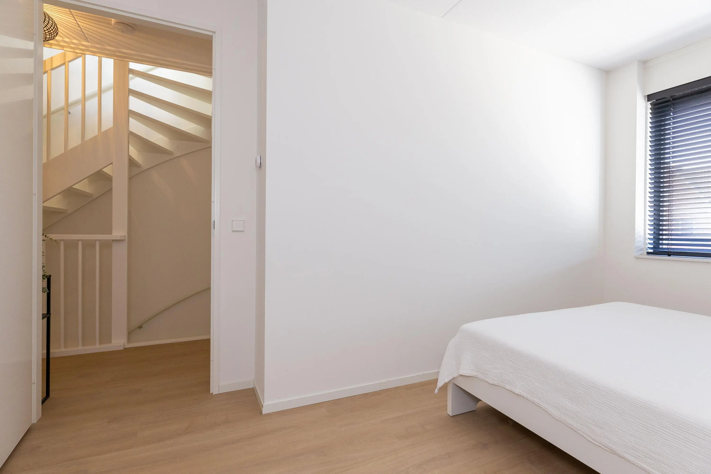 De woonkamer is heerlijk licht en ruim, mede dankzij de uitbouw aan de achterzijde. De lichte visgraatvloer en de zachte tinten op de wanden zorgen voor een rustige, moderne uitstraling. De grote raampartijen met openslaande deuren geven een mooie verbinding met de tuin en de ruime trapkast zorgt voor de nodige bergruimte.