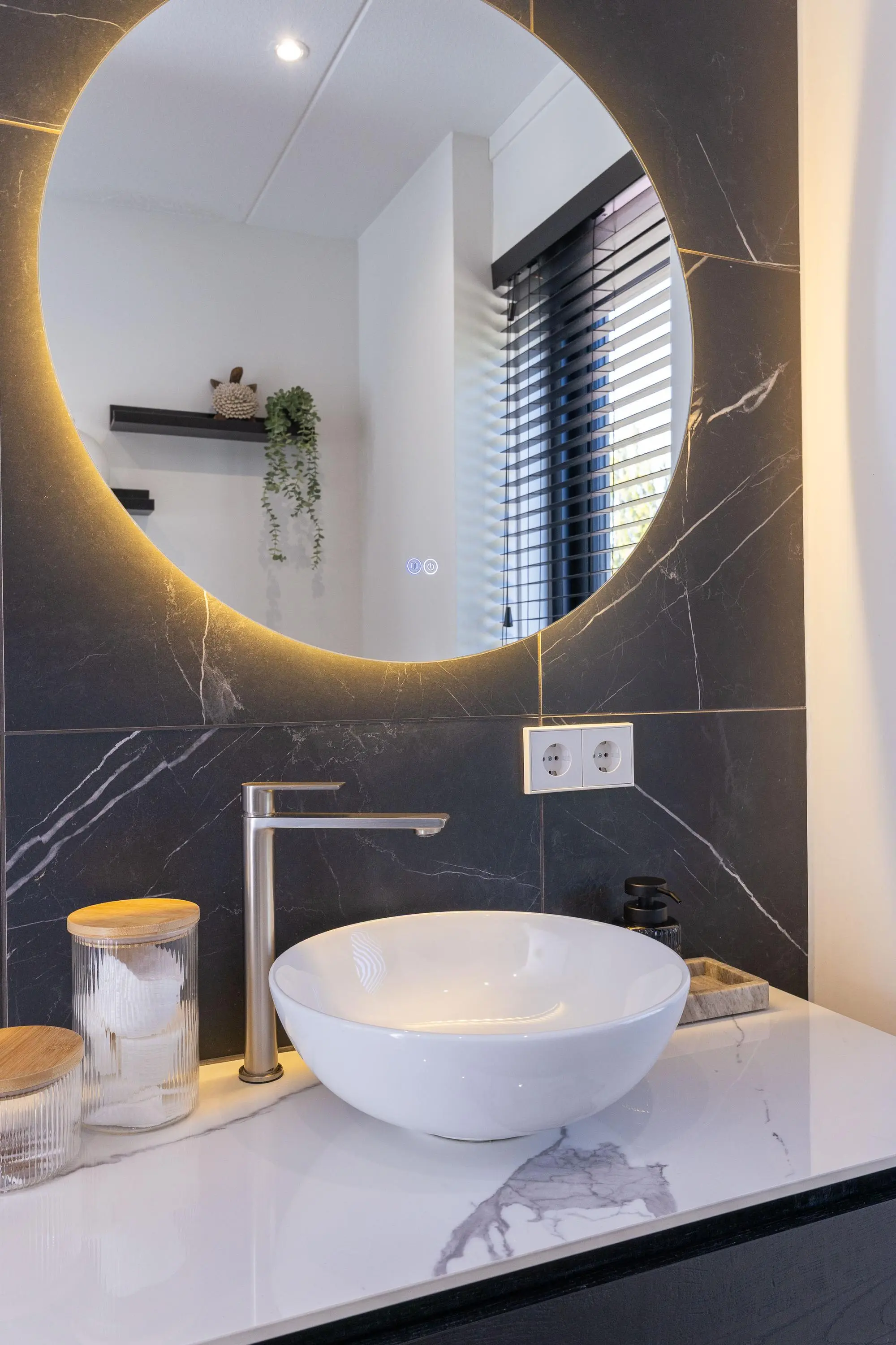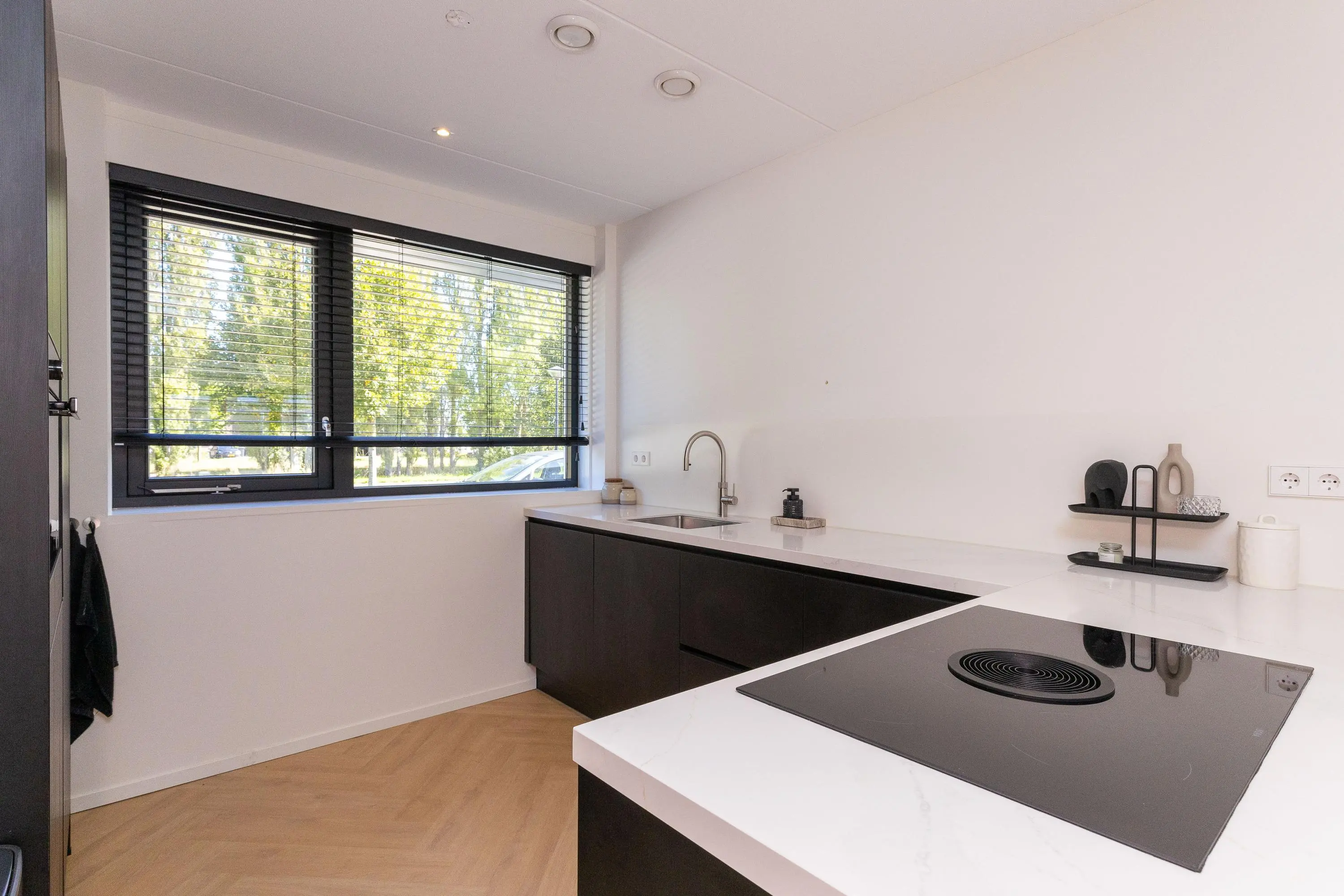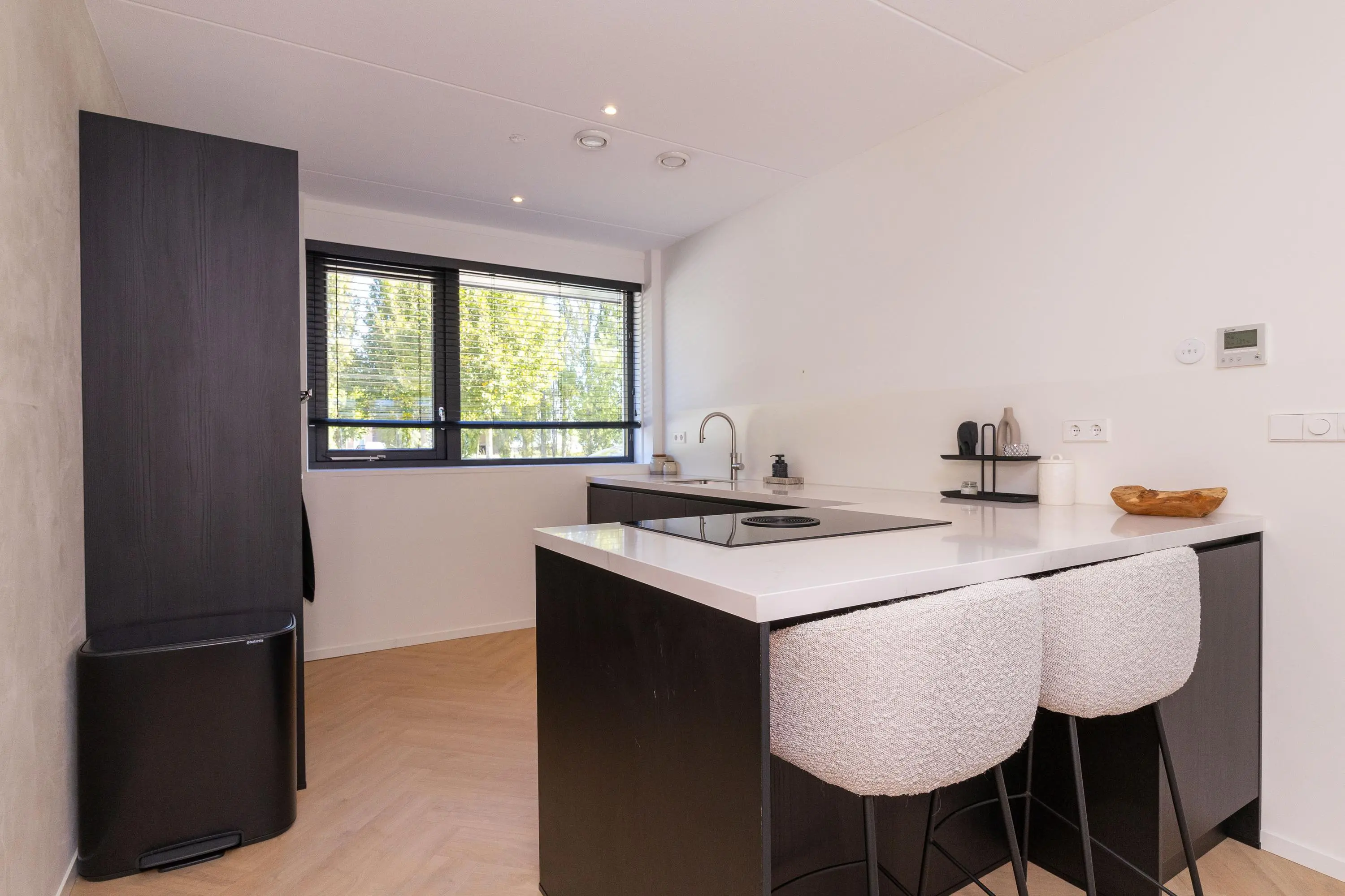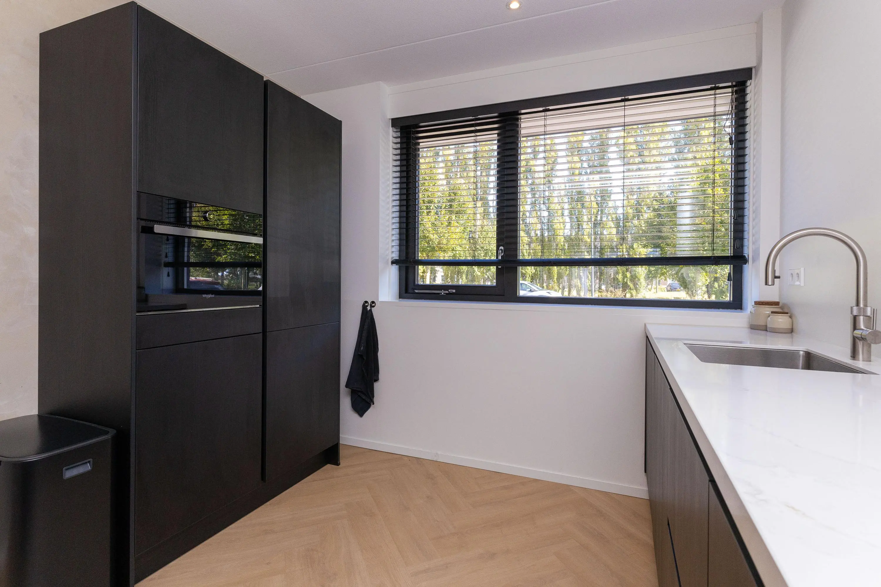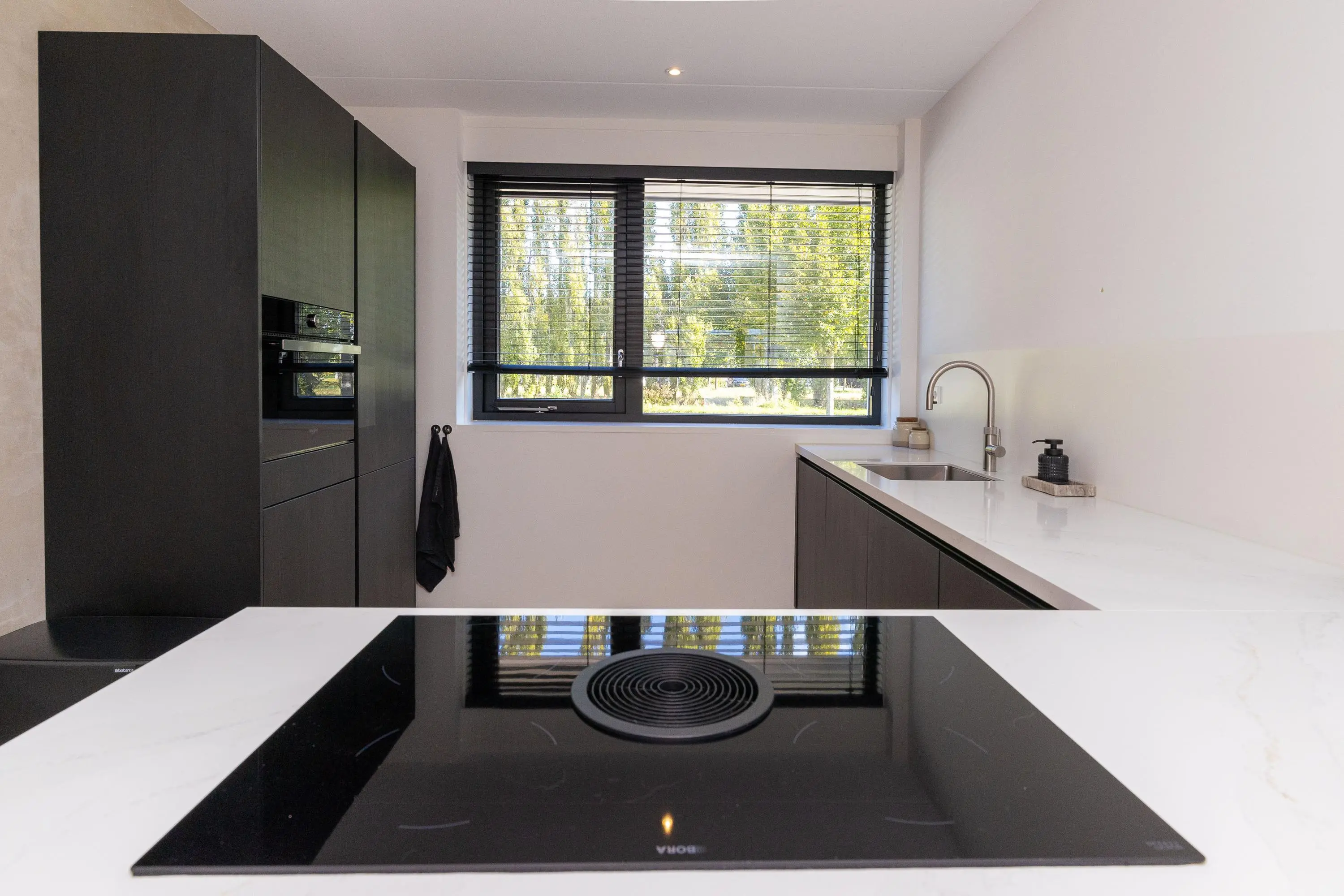 De luxe open keuken is een absolute eyecatcher. In een praktische L-opstelling met schiereiland en voorzien van moderne inbouwapparatuur zoals een inductiekookplaat met geïntegreerde afzuiging, combi-oven, vaatwasser, koelkast, vriezer, en natuurlijk een Quooker-kraan. Het geheel wordt afgewerkt met een prachtig natuurstenen werkblad.