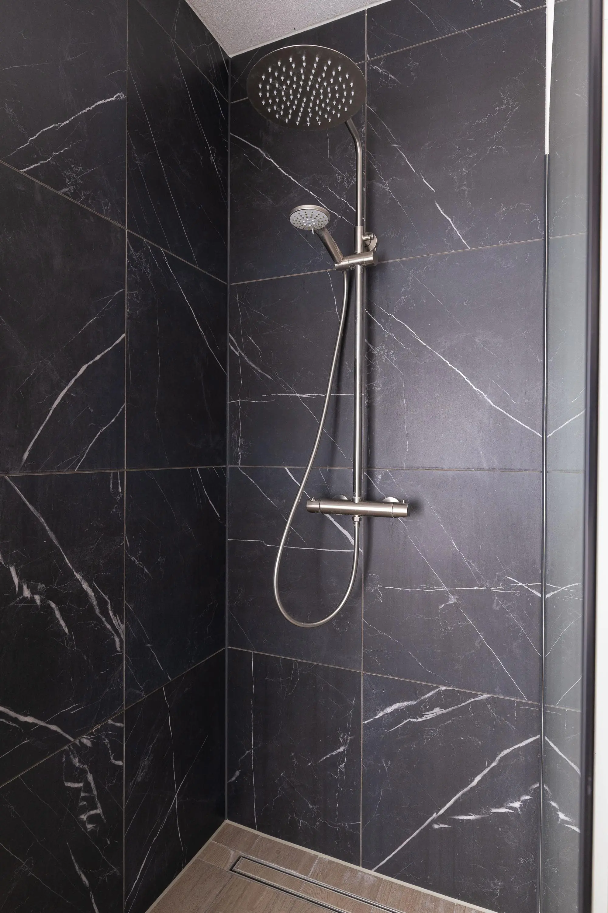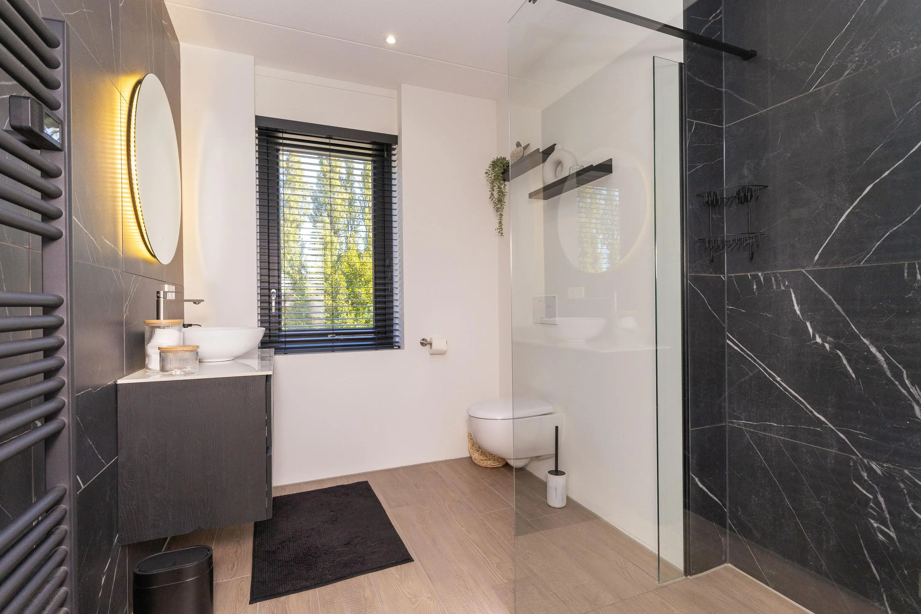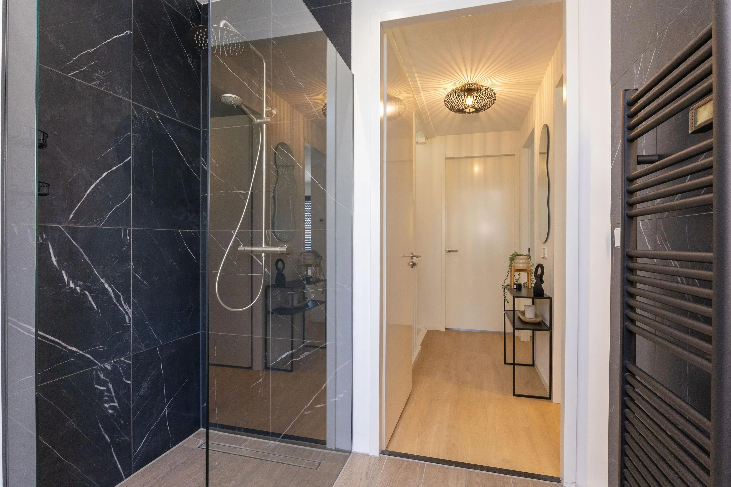 De badkamer biedt wederom een keurige afwerking. Voorzien van een ruime inloopdouche met rainshower, tweede toilet, modern wastafelmeubel, spiegel, mechanische en natuurlijke ventilatie, chique wandtegels en een stijlvolle handdoekradiator.