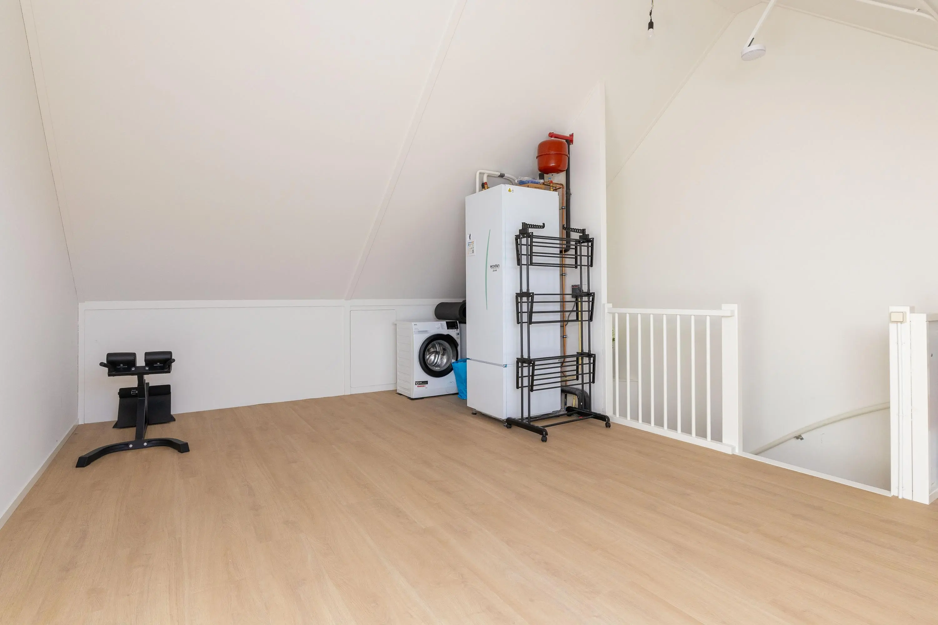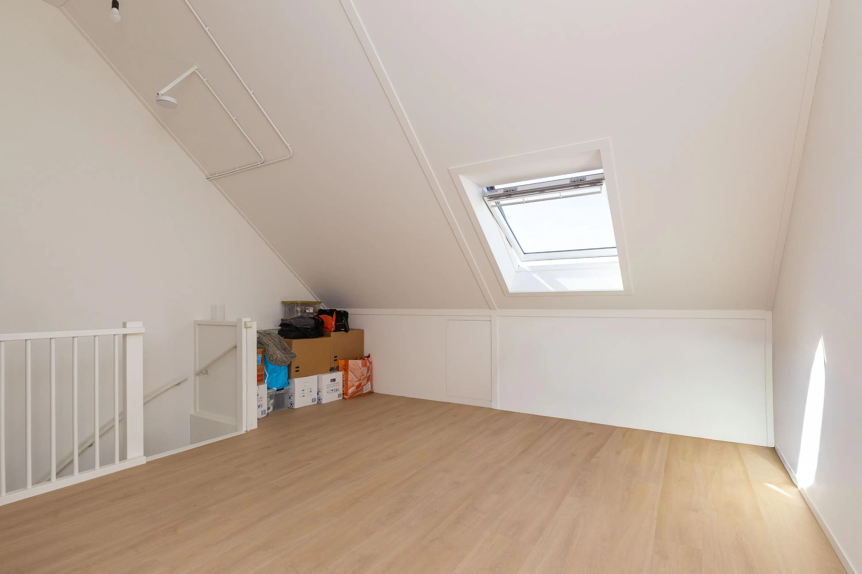 Net als de rest van de woning is ook deze verdieping voorzien van vloerverwarming en verkoeling. Een grote, open ruimte met dakraam die zich uitstekend leent als extra slaapkamer, werkkamer of hobbyruimte. Hier bevindt zich tevens de technische ruimte met de warmtepomp, WTW-unit en de aansluitingen voor wasmachine en droger.