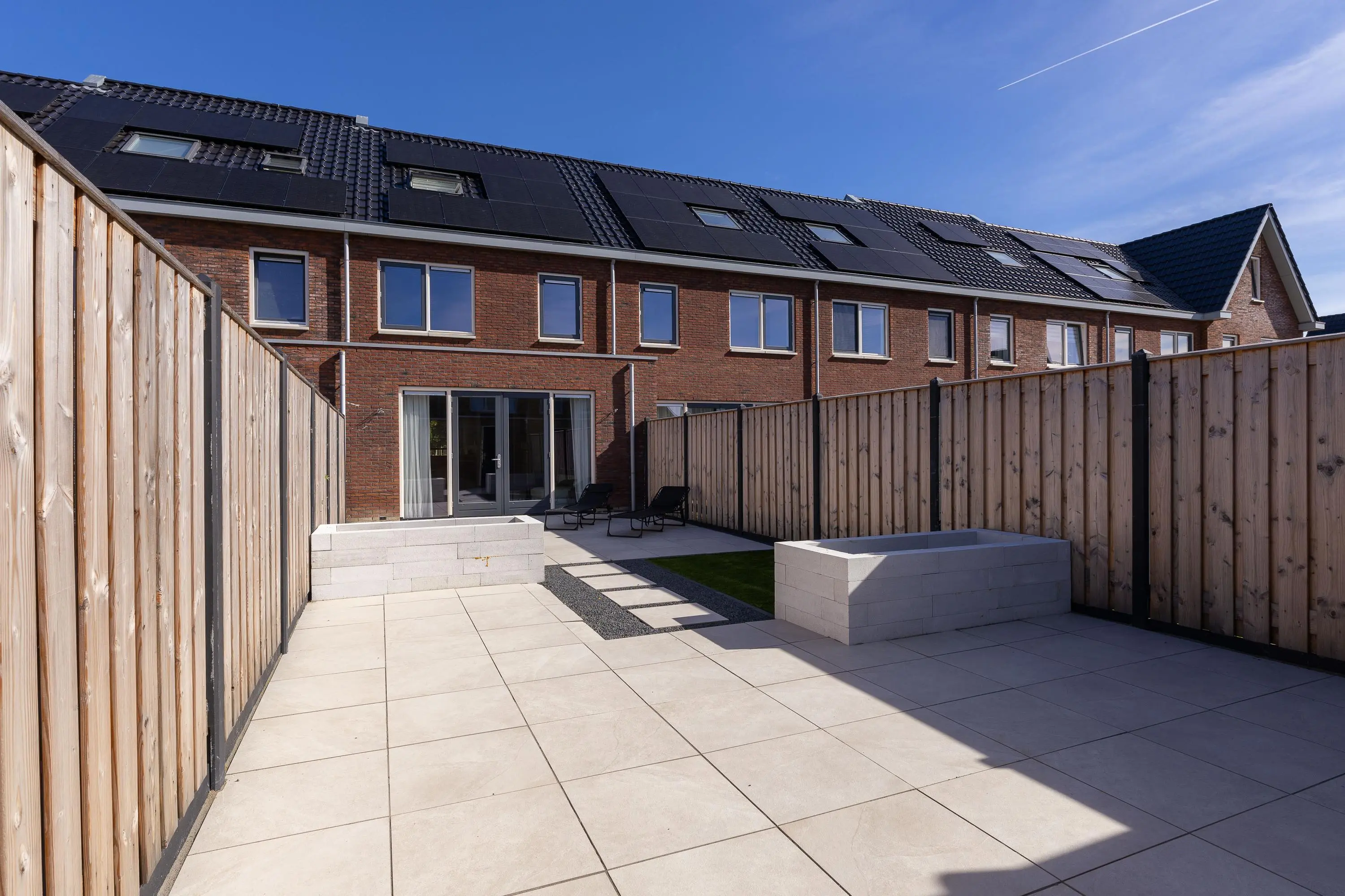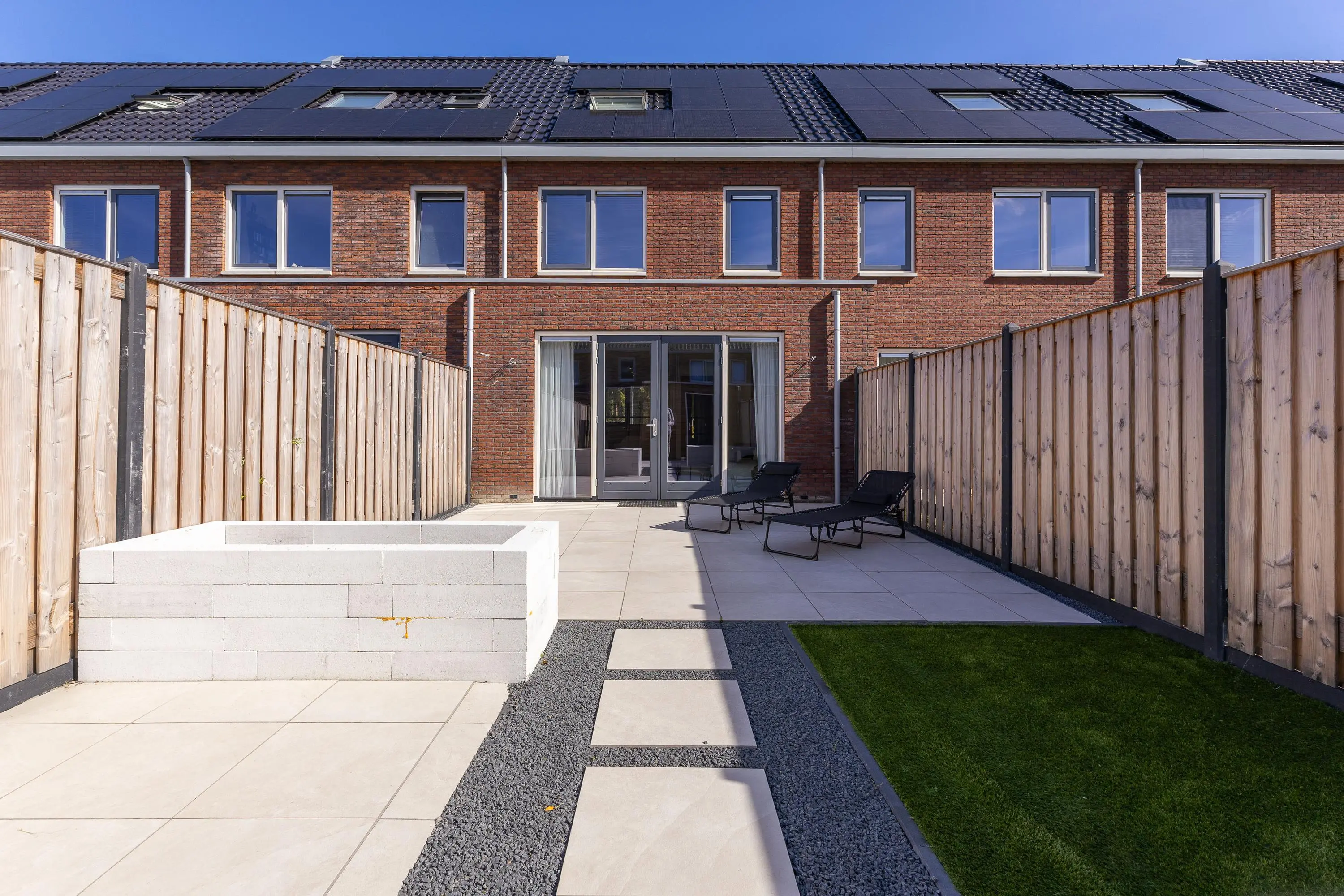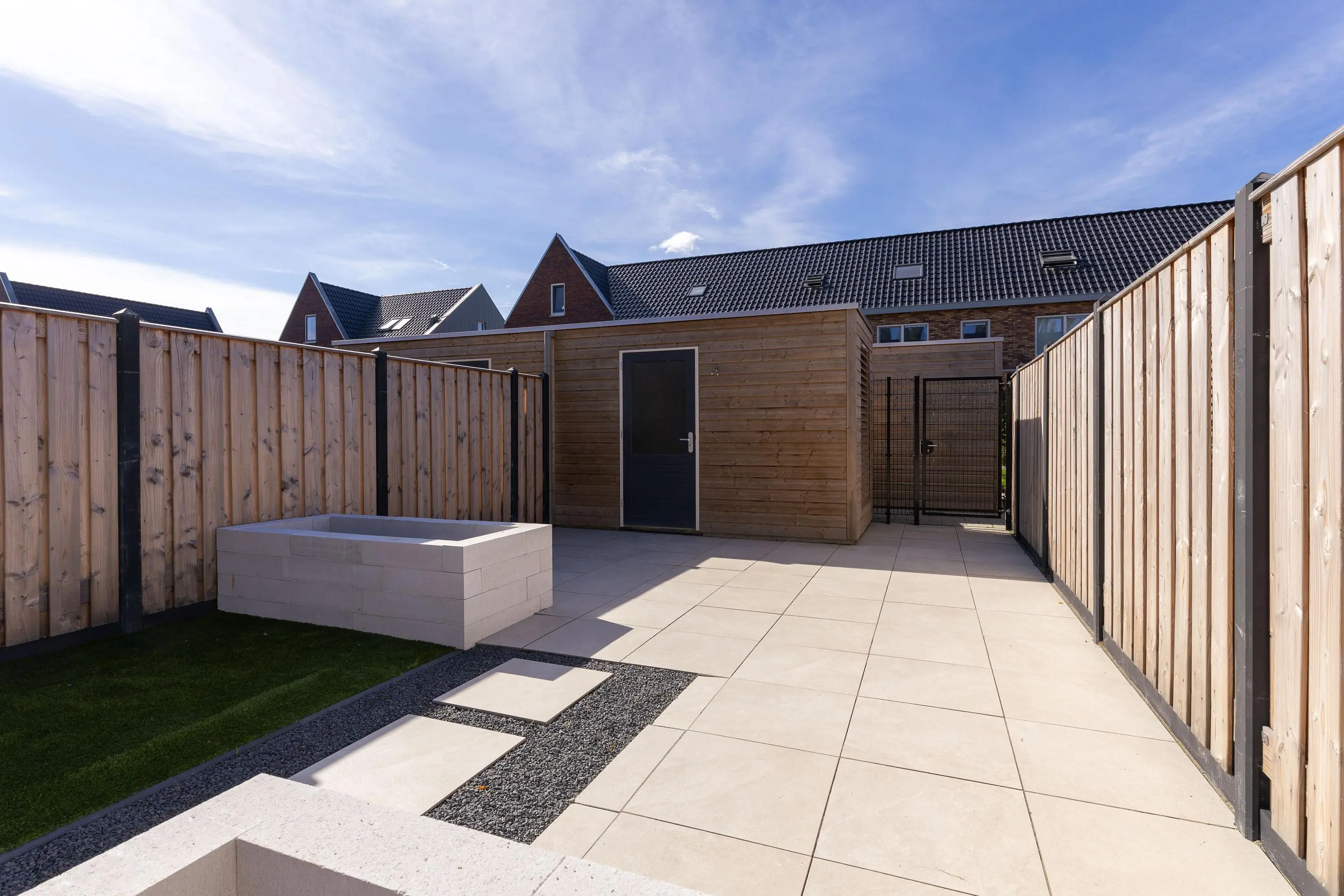 De moderne tuin is volledig aangelegd, gelegen op het zonnige zuidwesten en voorzien van een achterom en een vrijstaande houten berging. Hier geniet je van de middag- en avondzon, privacy en comfort.
