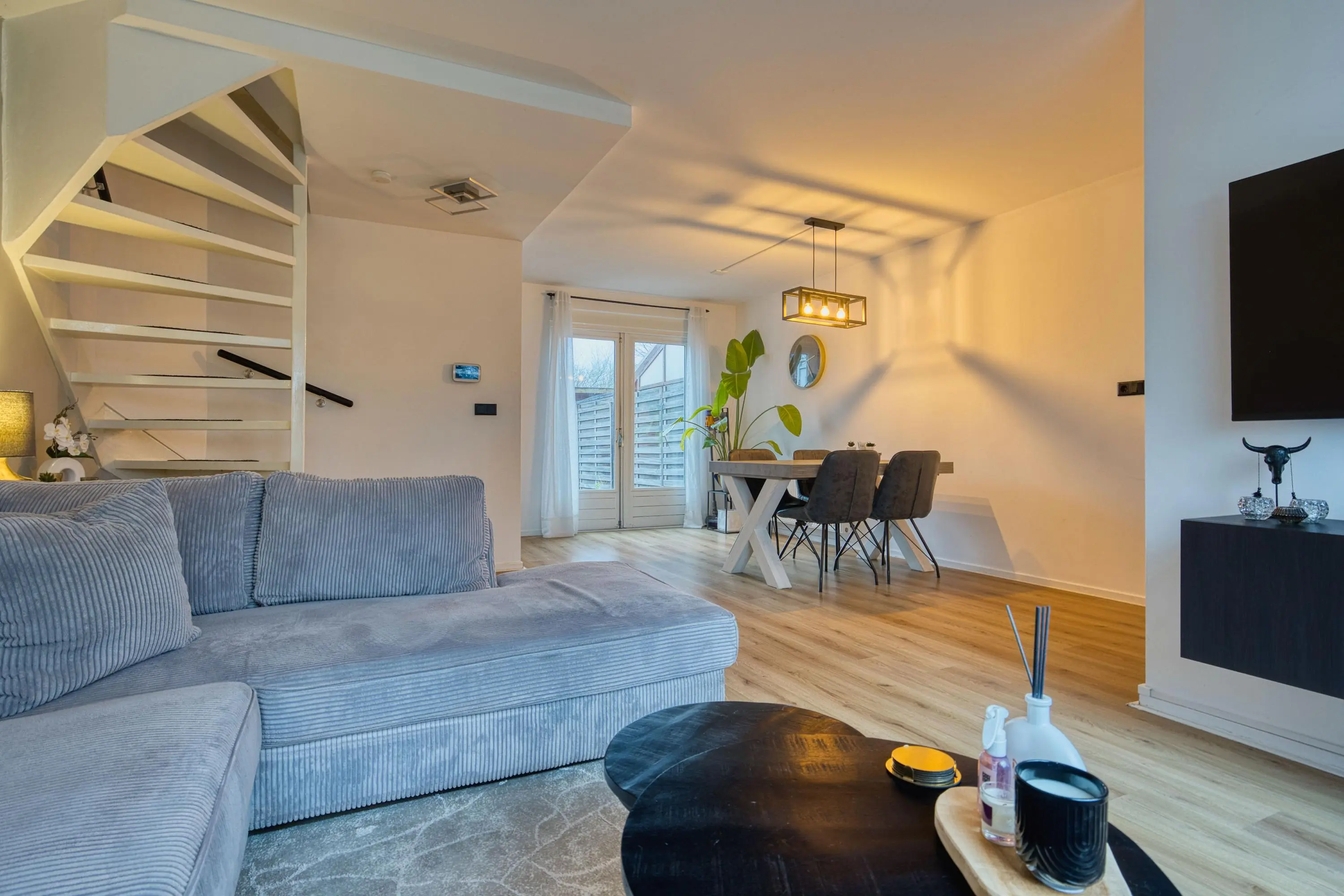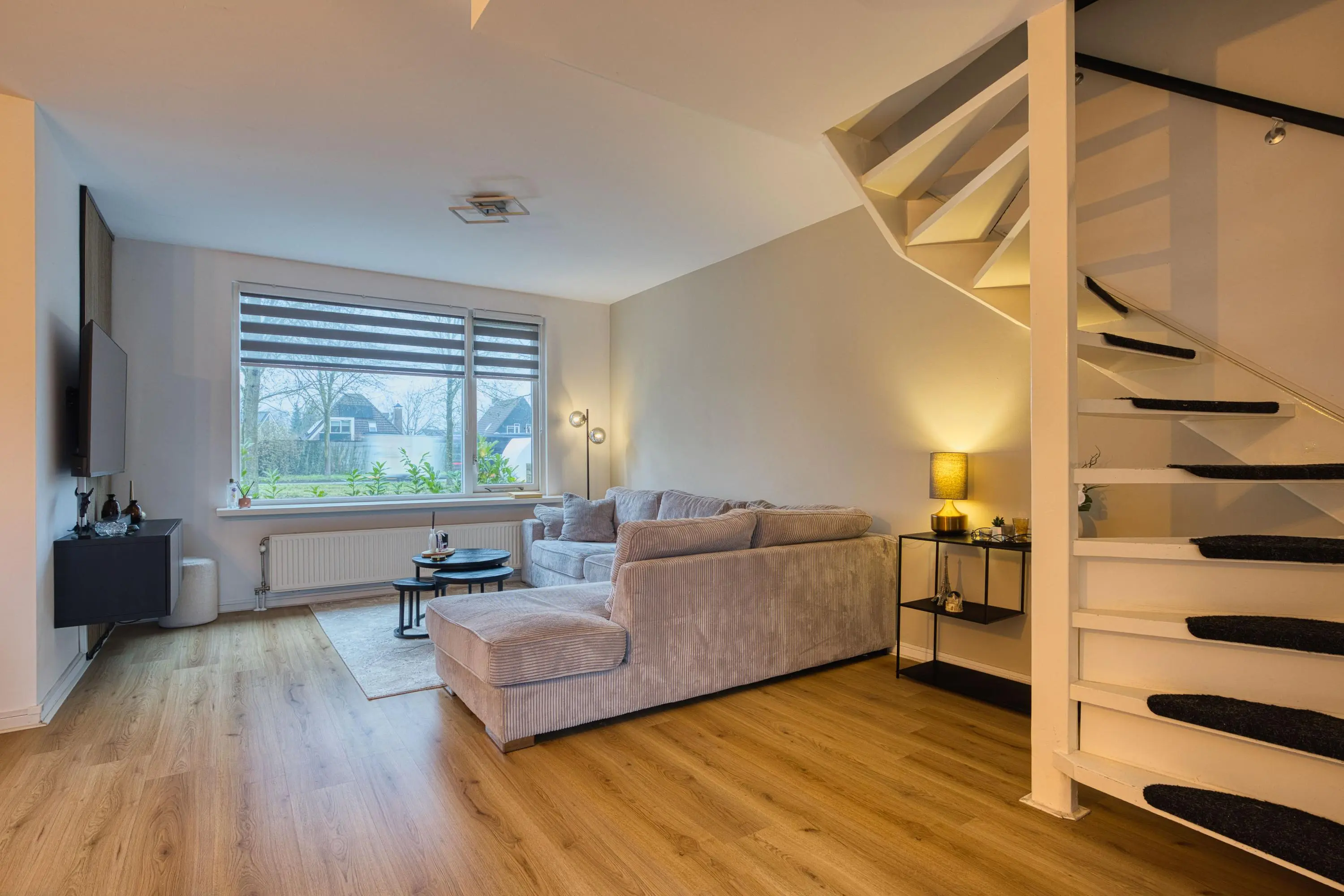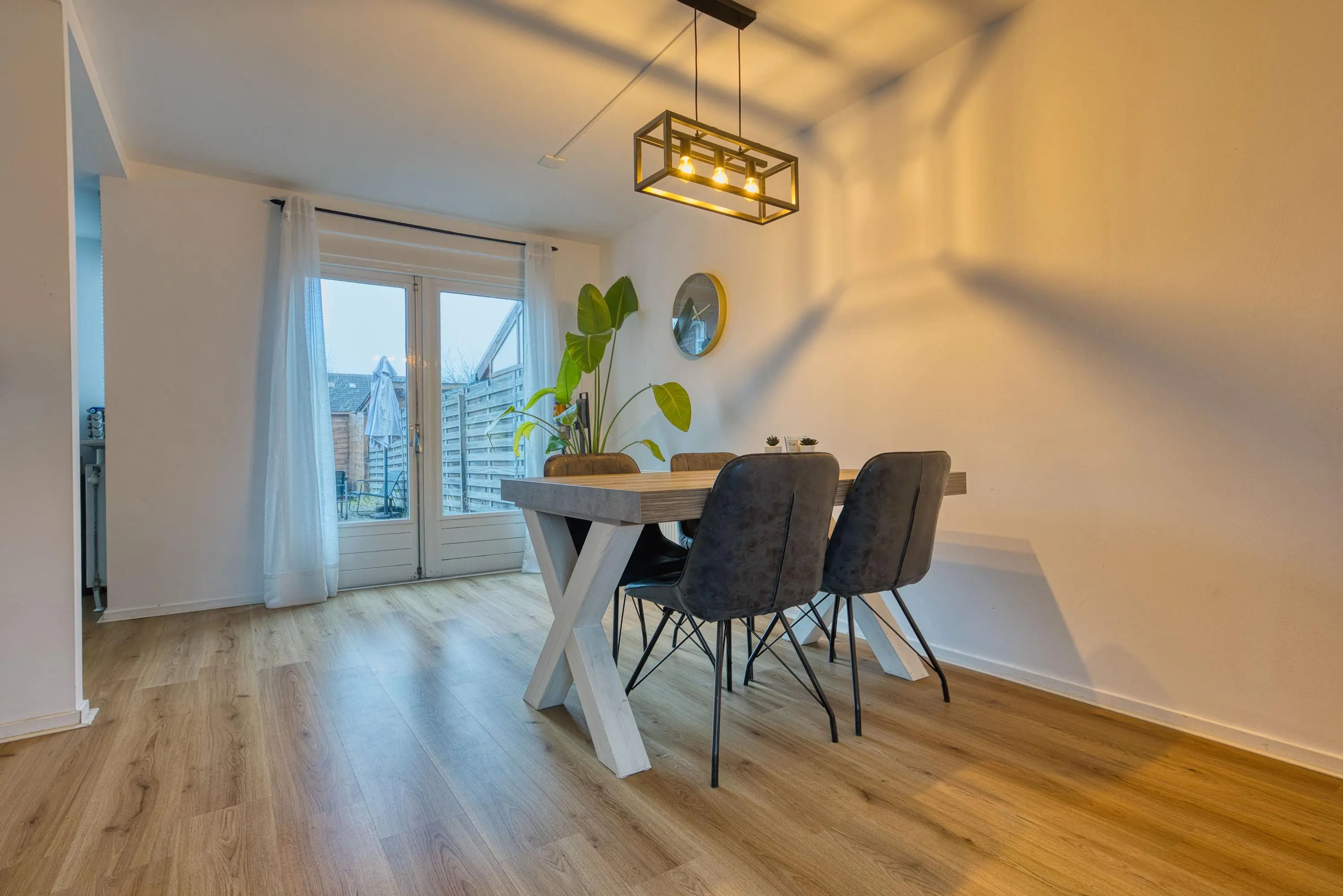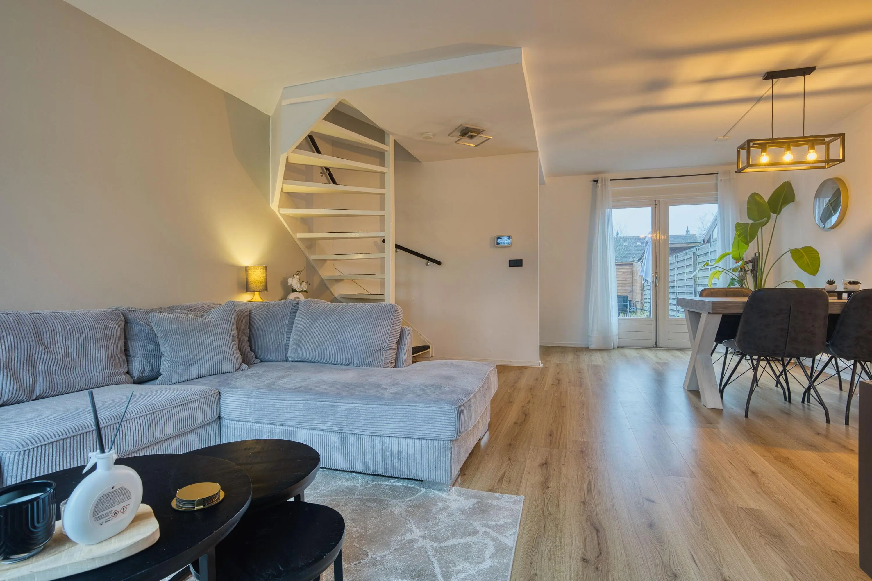 Bij binnenkomst in de hal met meterkast valt meteen de lichte en verzorgde uitstraling op. De ruime woonkamer is voorzien van een nette laminaatvloer en strak gestuukte wanden, waardoor een moderne en frisse basis is ontstaan. Aan de achterzijde bevindt zich de open keuken in hoekopstelling, uitgevoerd in een eigentijdse stijl en uitgerust met diverse inbouwapparatuur. Vanuit de keuken loop je door naar de praktische bijkeuken met toilet en aansluiting voor de wasmachine. Via openslaande deuren bereik je de zonnige achtertuin – volledig bestraat, onderhoudsarm en voorzien van een achterom.