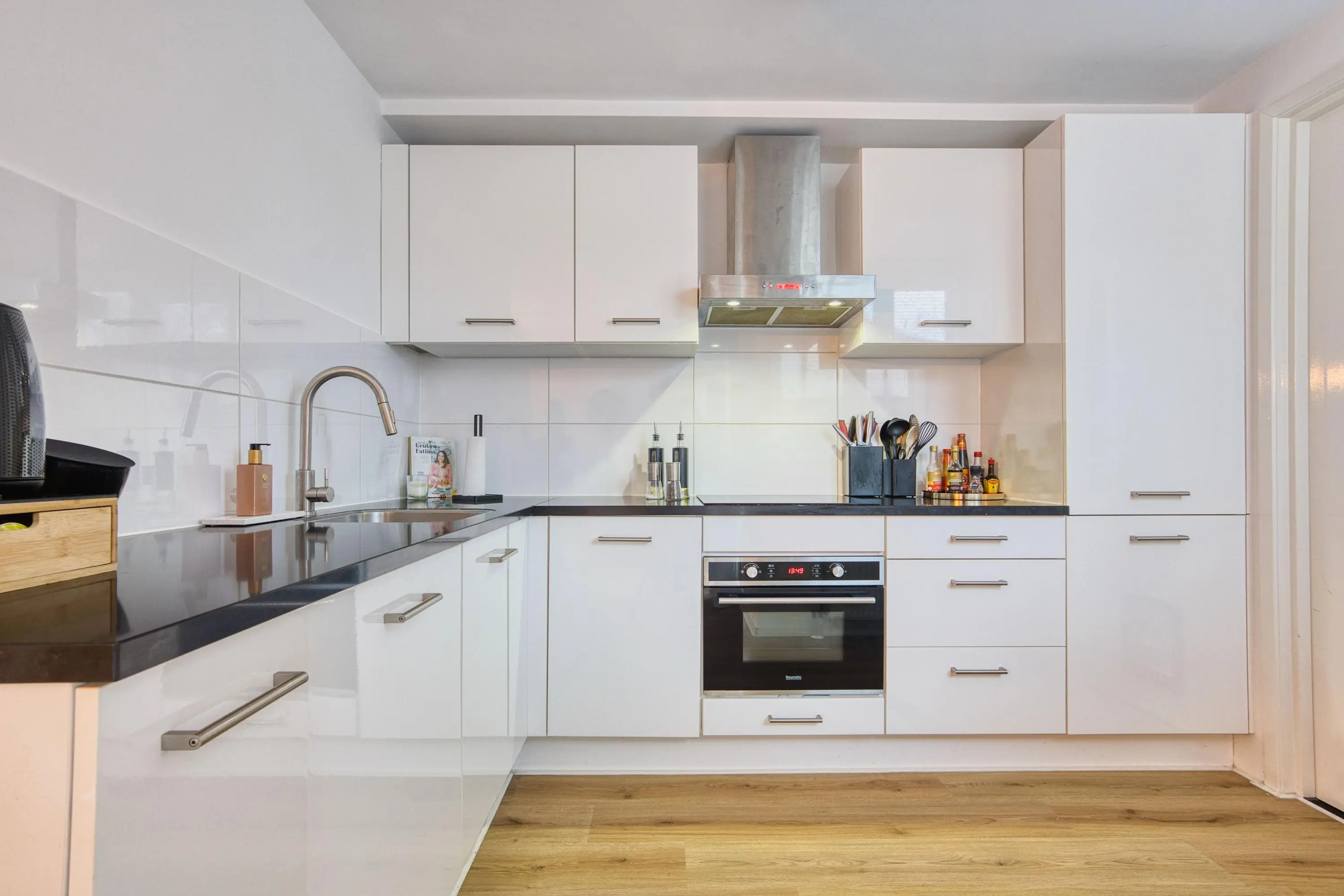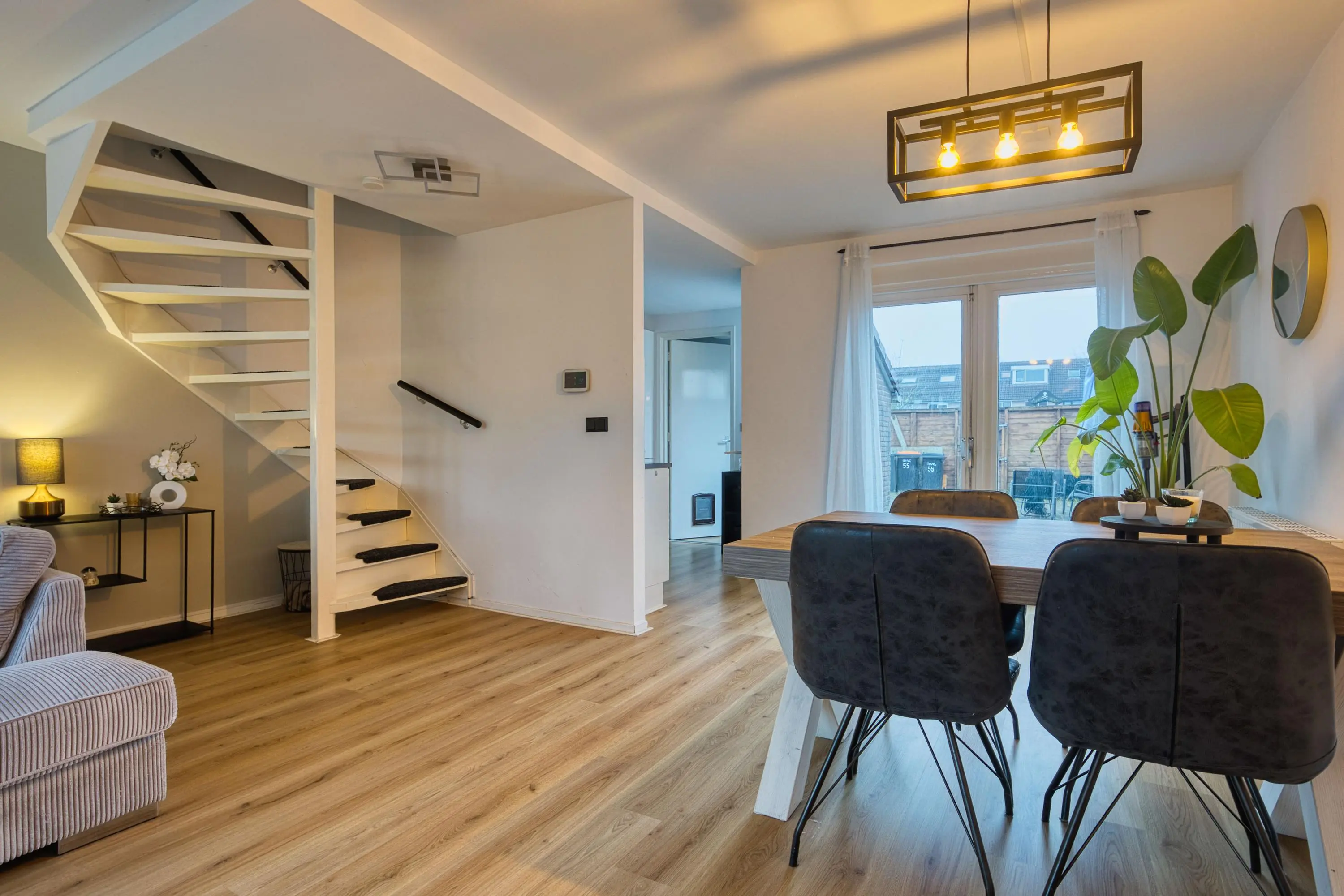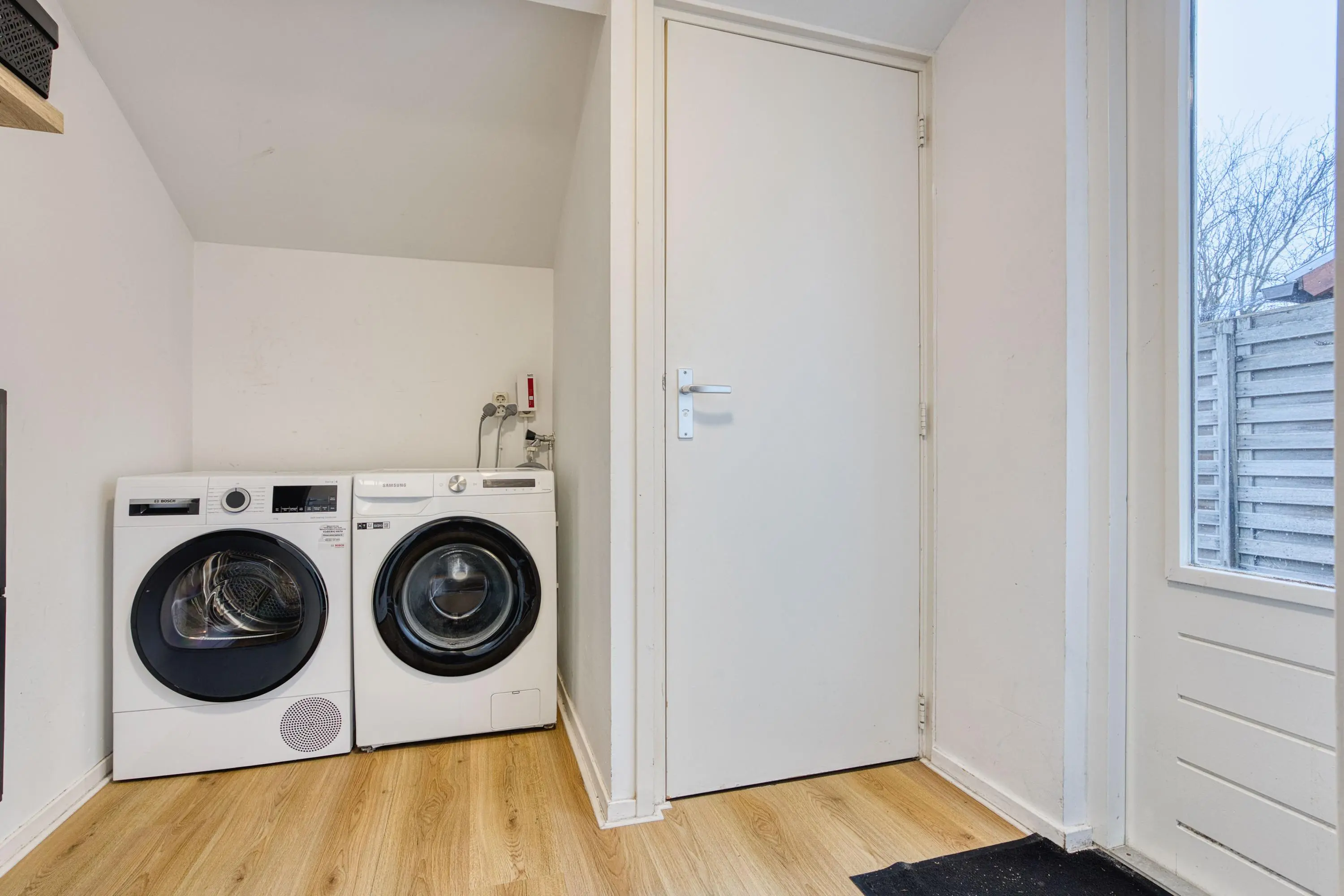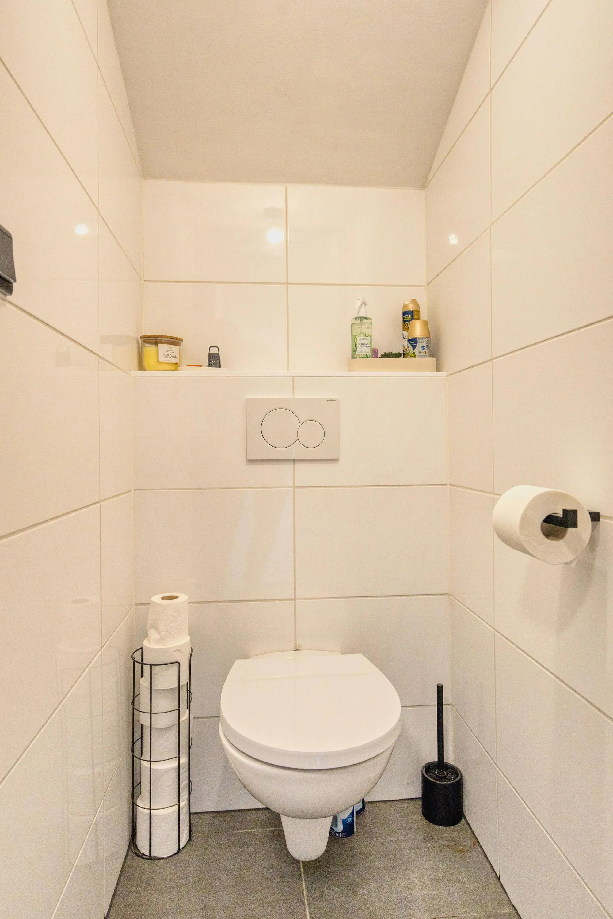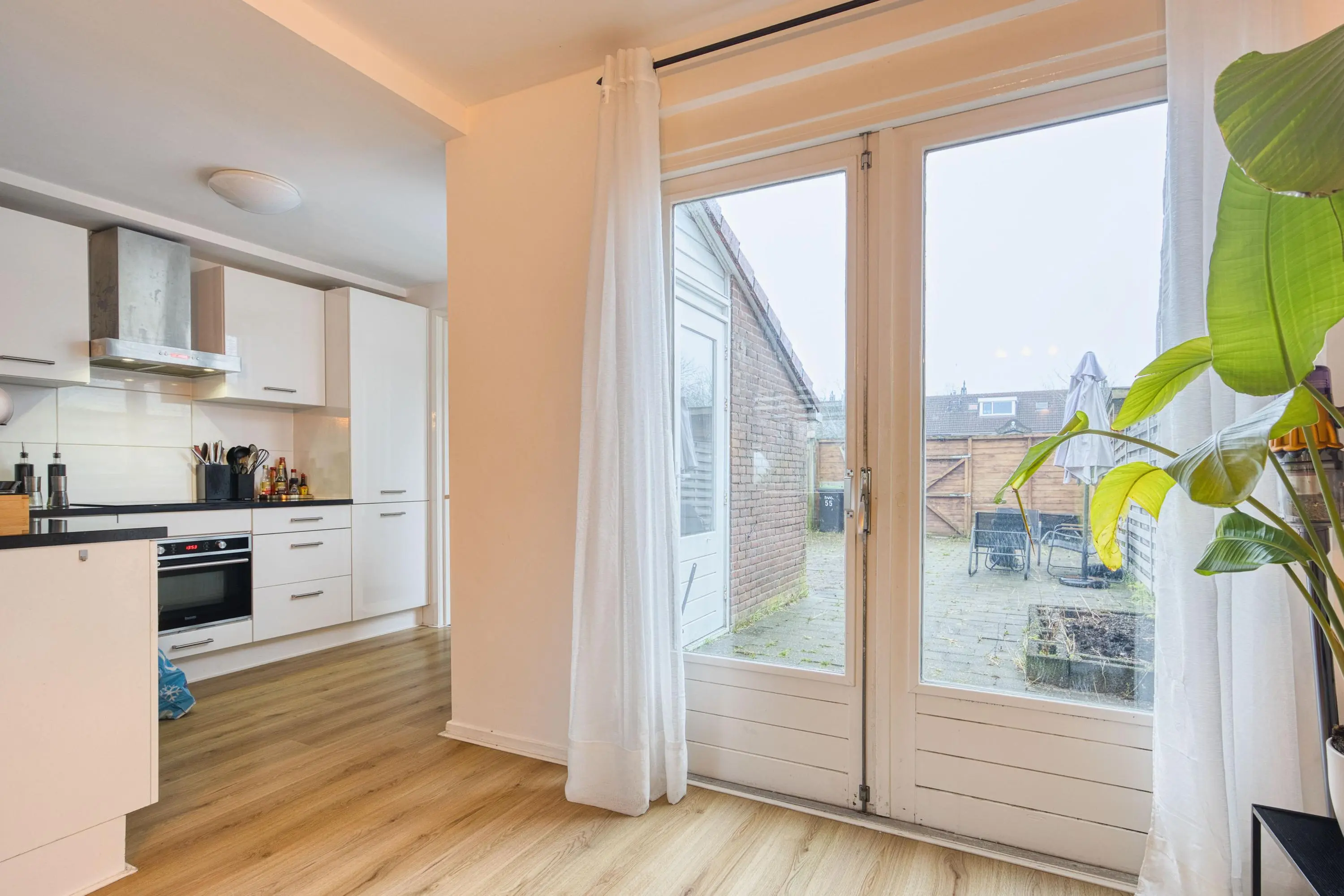 Bij binnenkomst in de hal met meterkast valt meteen de lichte en verzorgde uitstraling op. De ruime woonkamer is voorzien van een nette laminaatvloer en strak gestuukte wanden, waardoor een moderne en frisse basis is ontstaan. Aan de achterzijde bevindt zich de open keuken in hoekopstelling, uitgevoerd in een eigentijdse stijl en uitgerust met diverse inbouwapparatuur. Vanuit de keuken loop je door naar de praktische bijkeuken met toilet en aansluiting voor de wasmachine. Via openslaande deuren bereik je de zonnige achtertuin – volledig bestraat, onderhoudsarm en voorzien van een achterom.