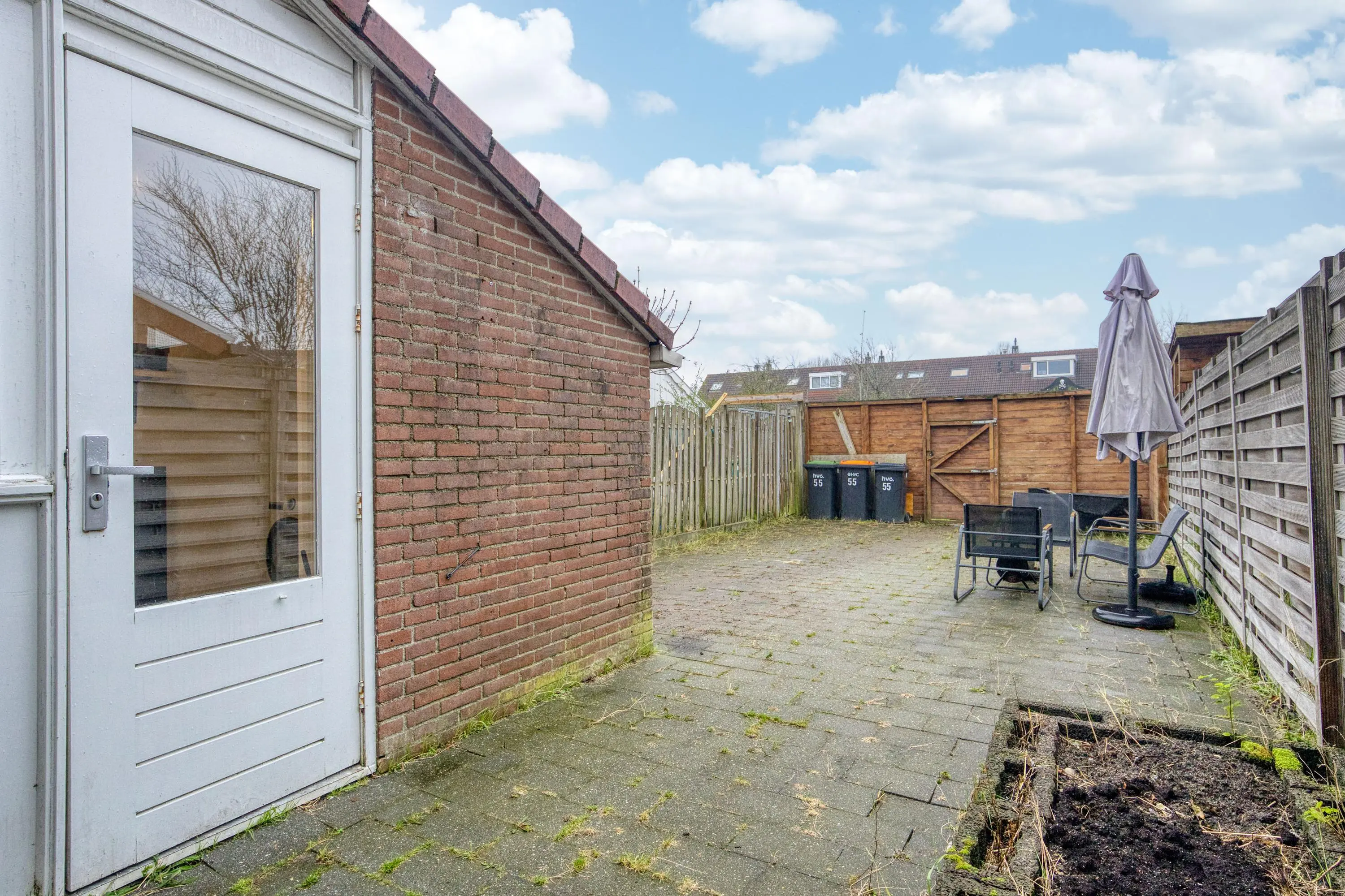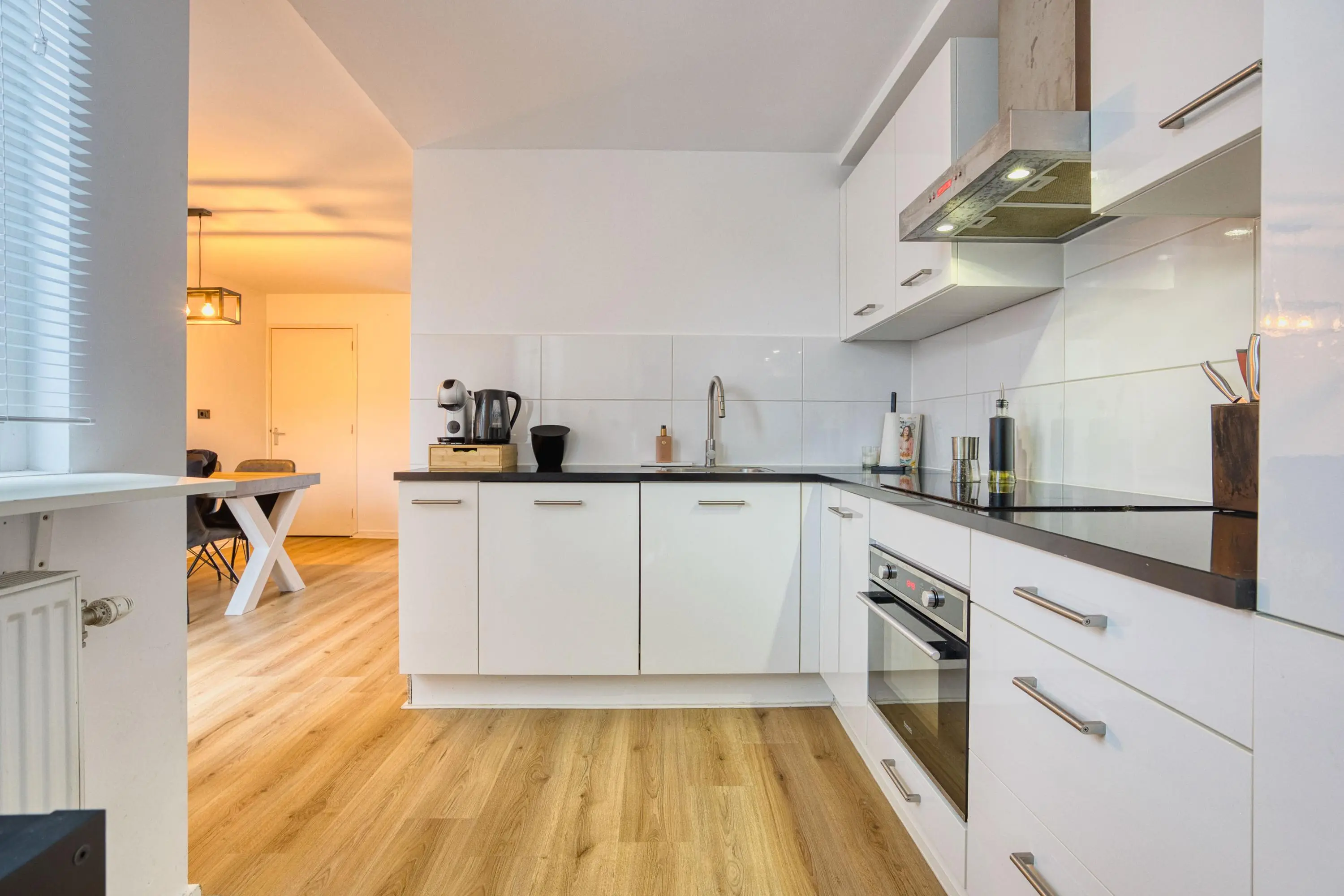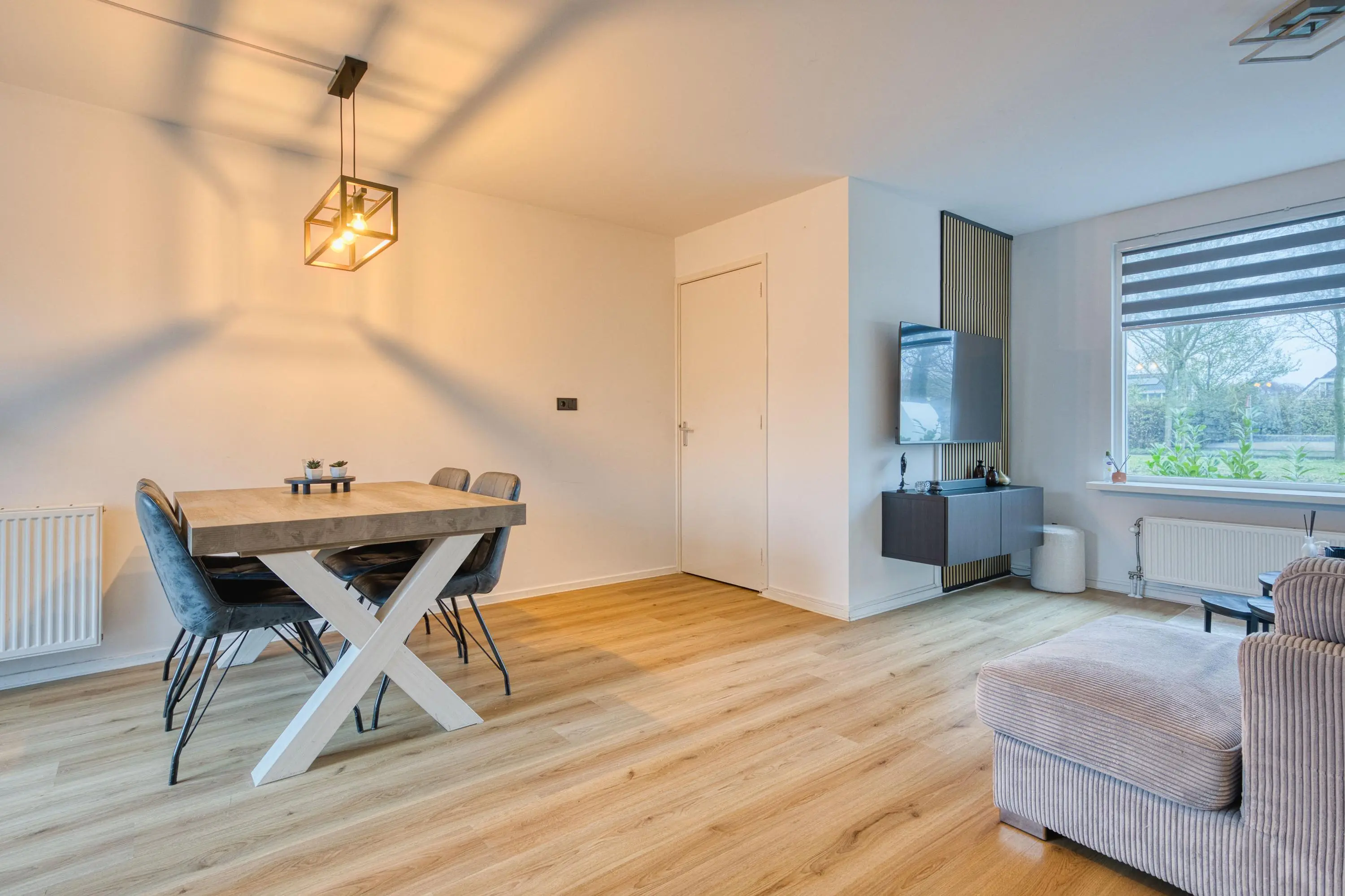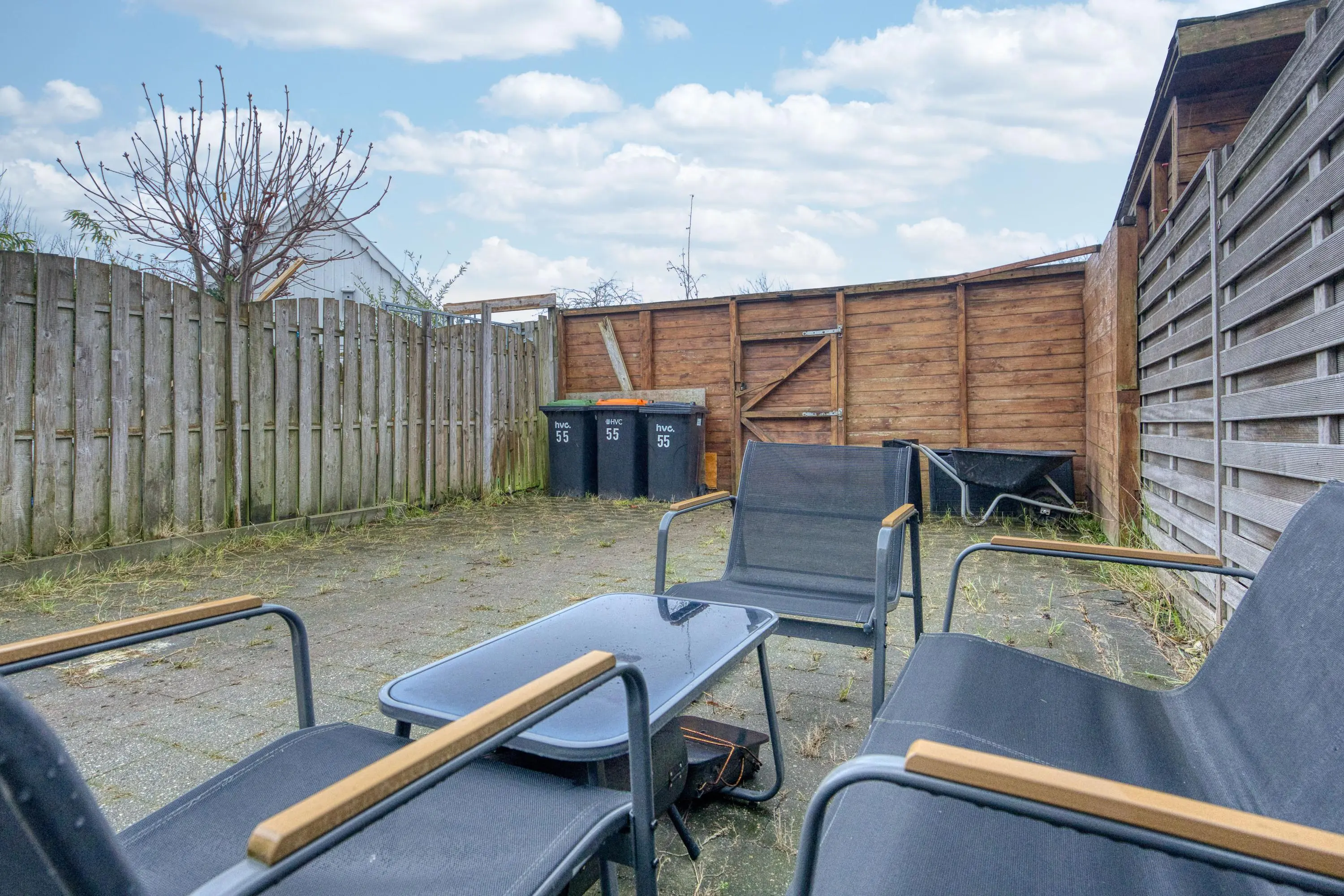 Bij binnenkomst in de hal met meterkast valt meteen de lichte en verzorgde uitstraling op. De ruime woonkamer is voorzien van een nette laminaatvloer en strak gestuukte wanden, waardoor een moderne en frisse basis is ontstaan. Aan de achterzijde bevindt zich de open keuken in hoekopstelling, uitgevoerd in een eigentijdse stijl en uitgerust met diverse inbouwapparatuur. Vanuit de keuken loop je door naar de praktische bijkeuken met toilet en aansluiting voor de wasmachine. Via openslaande deuren bereik je de zonnige achtertuin – volledig bestraat, onderhoudsarm en voorzien van een achterom.