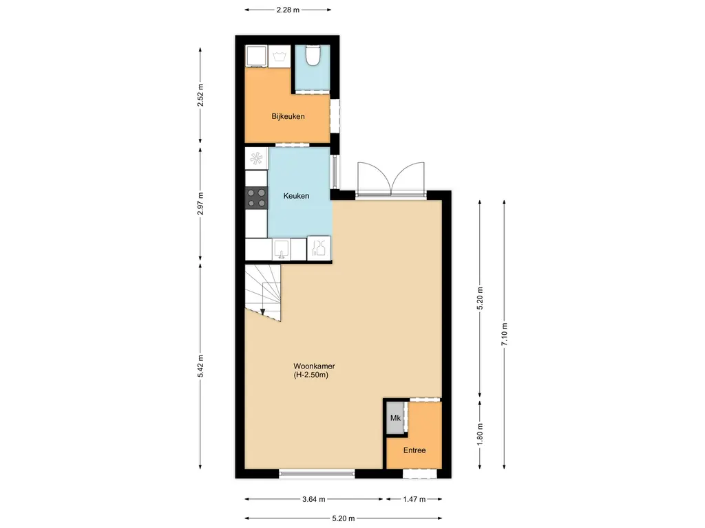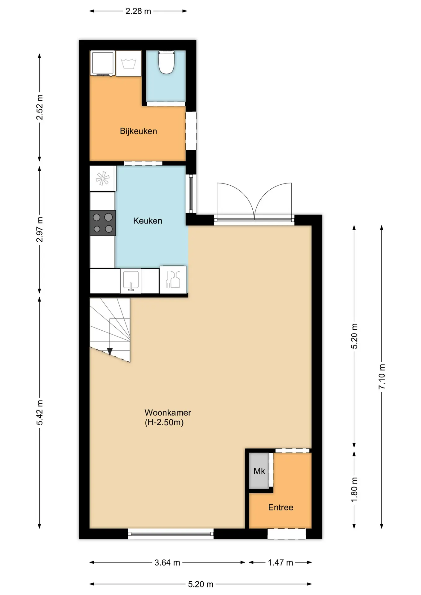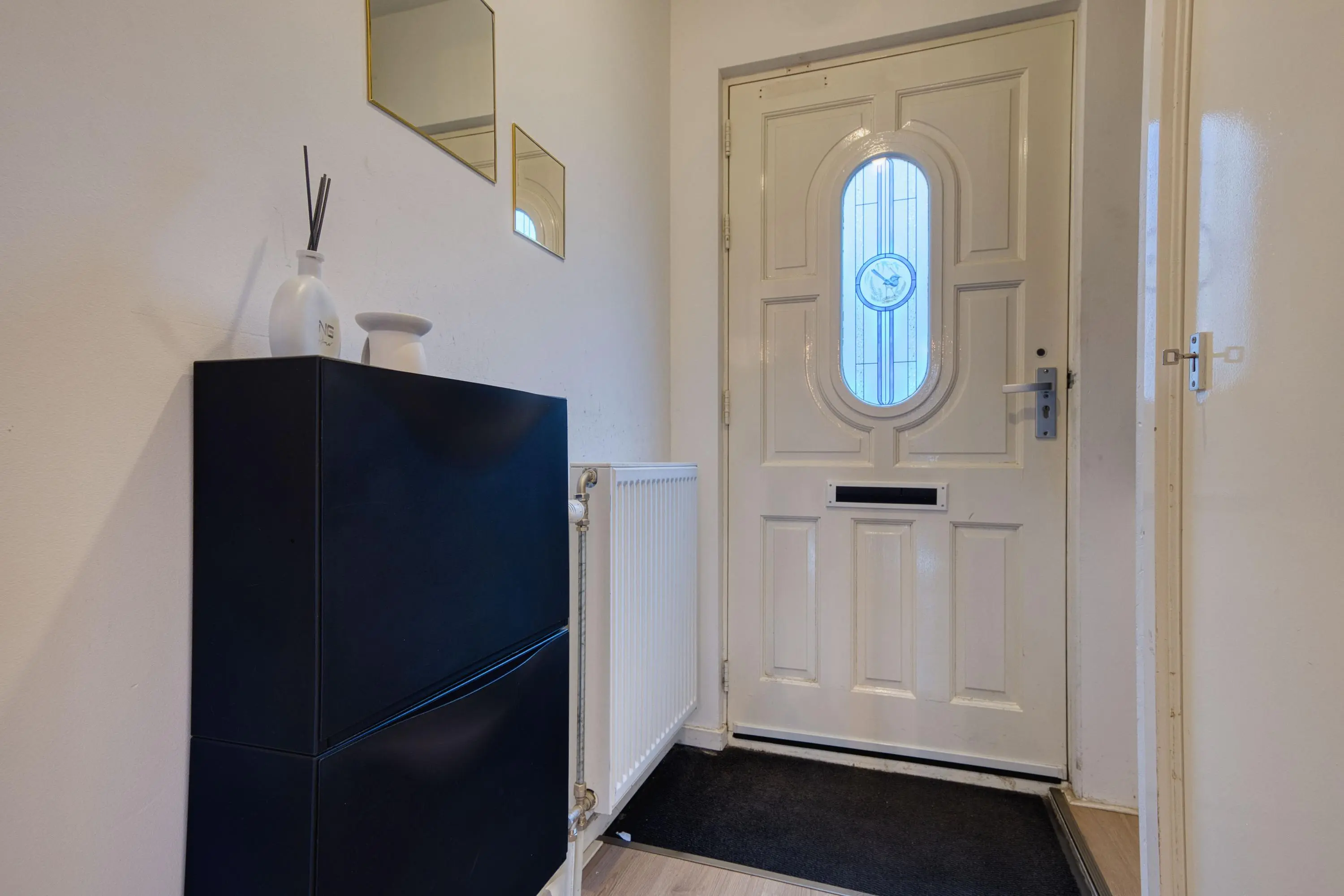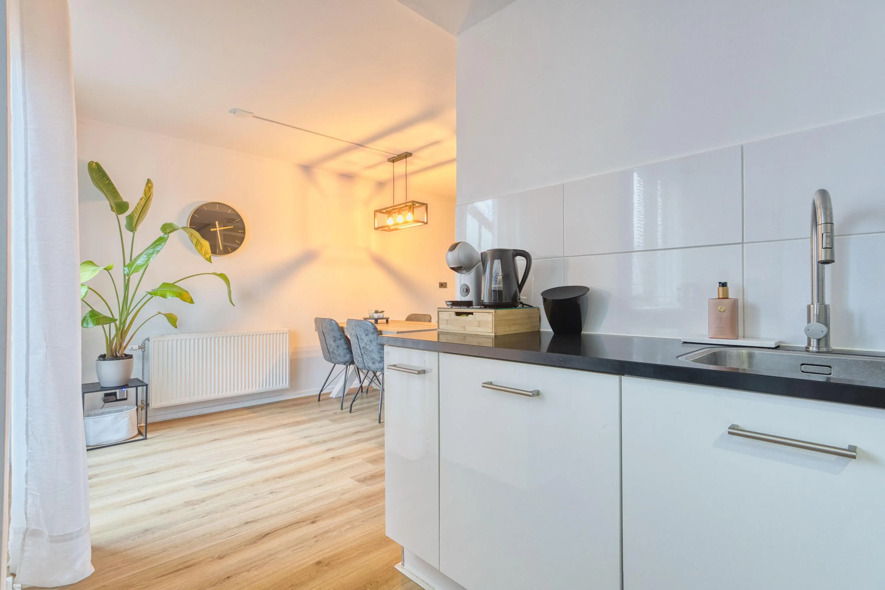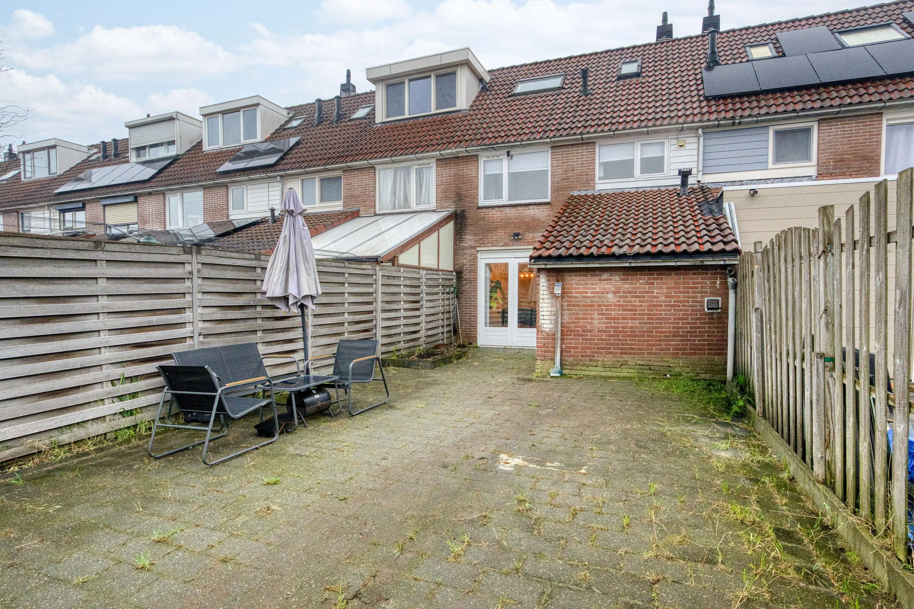 Bij binnenkomst in de hal met meterkast valt meteen de lichte en verzorgde uitstraling op. De ruime woonkamer is voorzien van een nette laminaatvloer en strak gestuukte wanden, waardoor een moderne en frisse basis is ontstaan. Aan de achterzijde bevindt zich de open keuken in hoekopstelling, uitgevoerd in een eigentijdse stijl en uitgerust met diverse inbouwapparatuur. Vanuit de keuken loop je door naar de praktische bijkeuken met toilet en aansluiting voor de wasmachine. Via openslaande deuren bereik je de zonnige achtertuin – volledig bestraat, onderhoudsarm en voorzien van een achterom.
