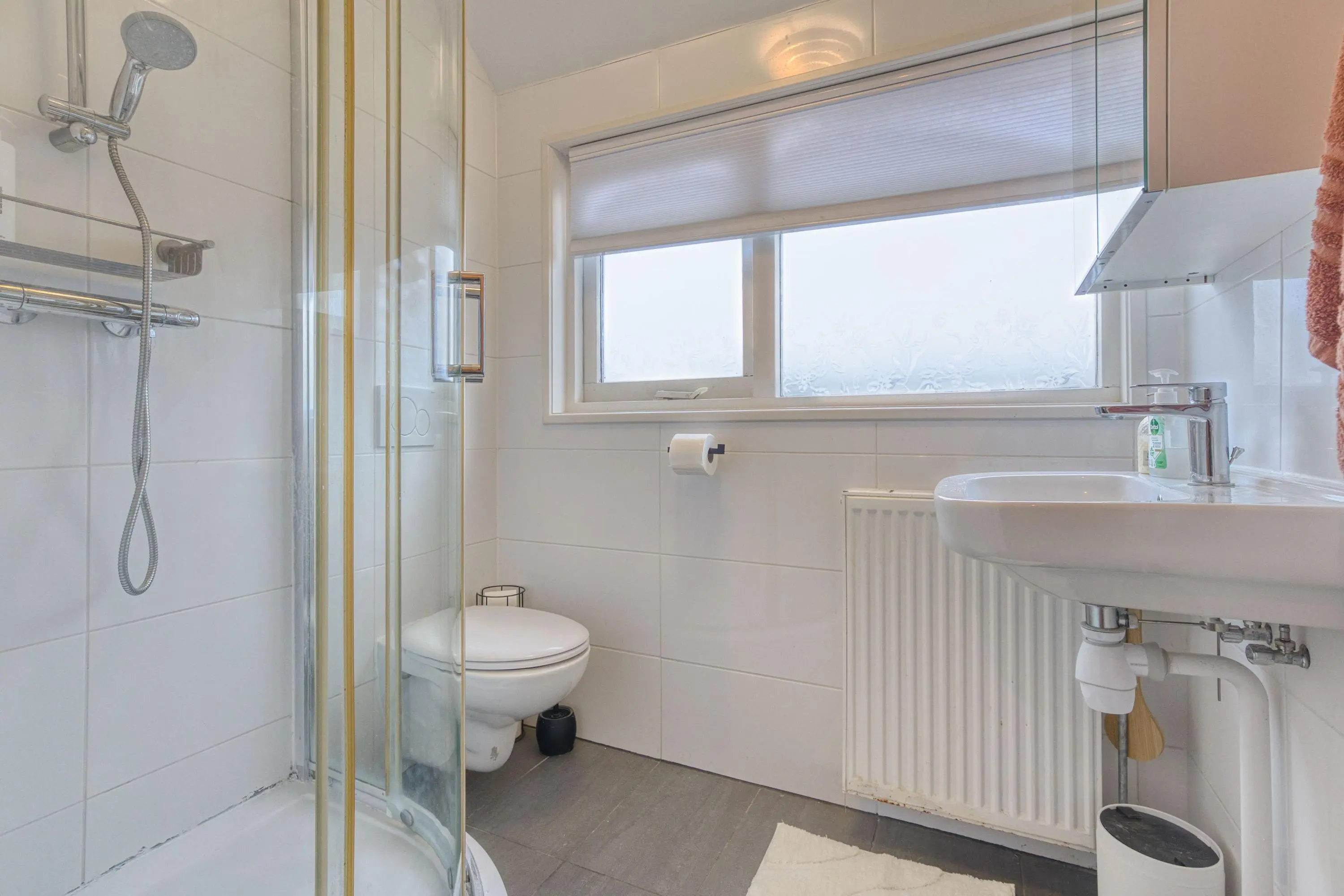 Op de eerste verdieping vind je drie goed bemeten slaapkamers dankzij de rechte gevels. De badkamer is volledig betegeld in een lichte kleurstelling en uitgerust met een douche, wastafel en tweede toilet.