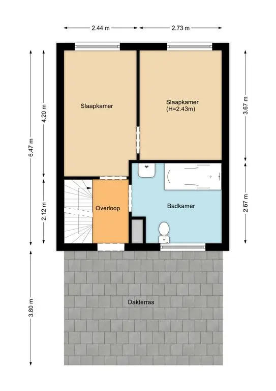 Overloop met toegang tot een royale badkamer (ca. 8 m²) met tweede toilet, ligbad en aparte douche. De master bedroom (ca. 20 m²) is bereikbaar via een tweede slaapkamer en beschikt over een heerlijk dakterras (ca. 15 m²) waar je van de zon kunt genieten.