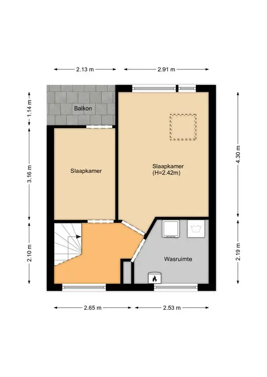 Overloop, twee slaapkamers waarvan één met balkon, en een praktische wasruimte met aansluitingen voor wasmachine en droger. Hier bevindt zich ook de CV-ketel.