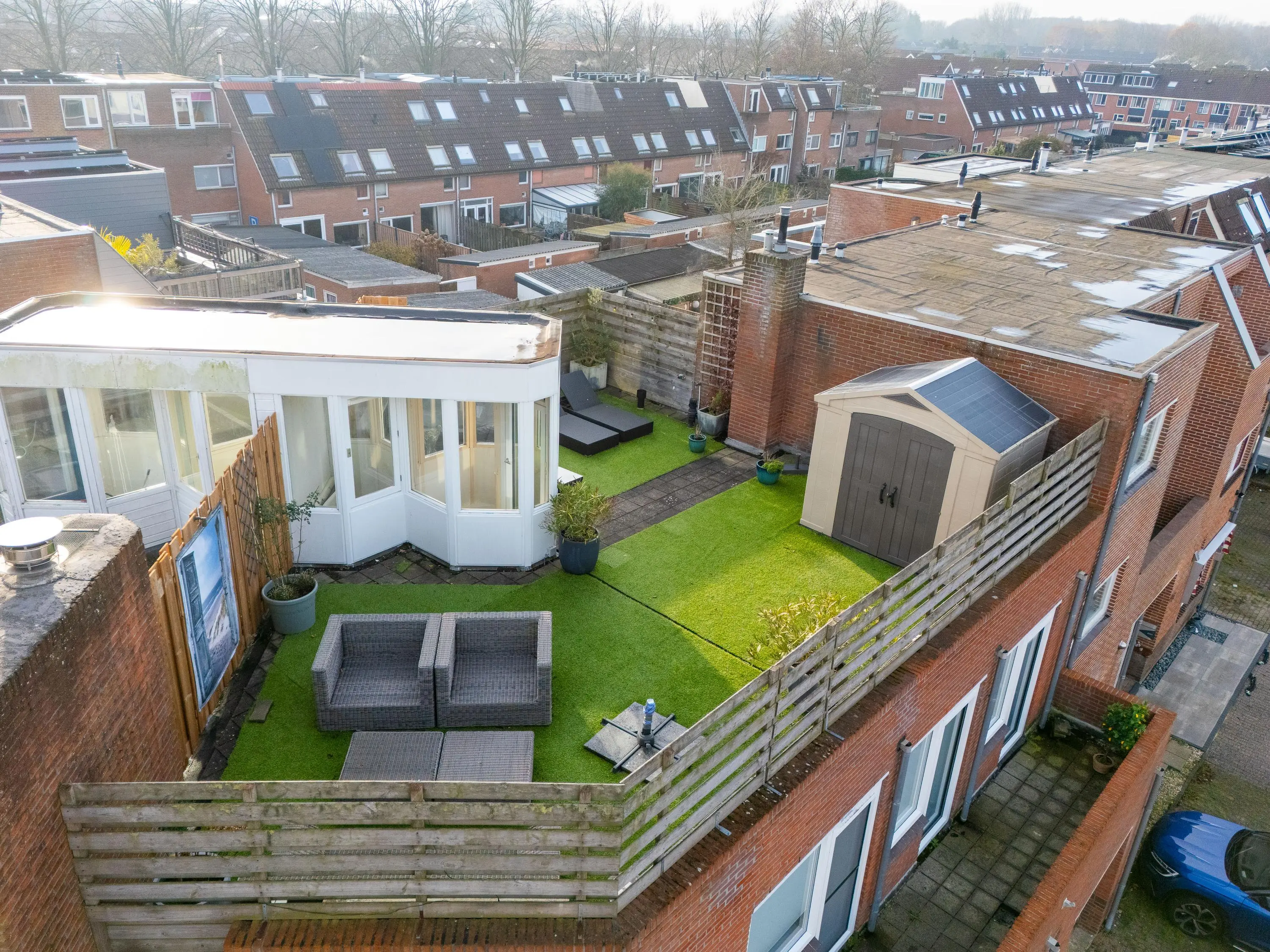 Via een vaste trap bereik je het grote dakterras – een absolute blikvanger! Dankzij de vrije ligging is hier altijd wel een plekje in de zon te vinden: ideaal voor loungen, barbecueën of het creëren van een groene stadsoase.