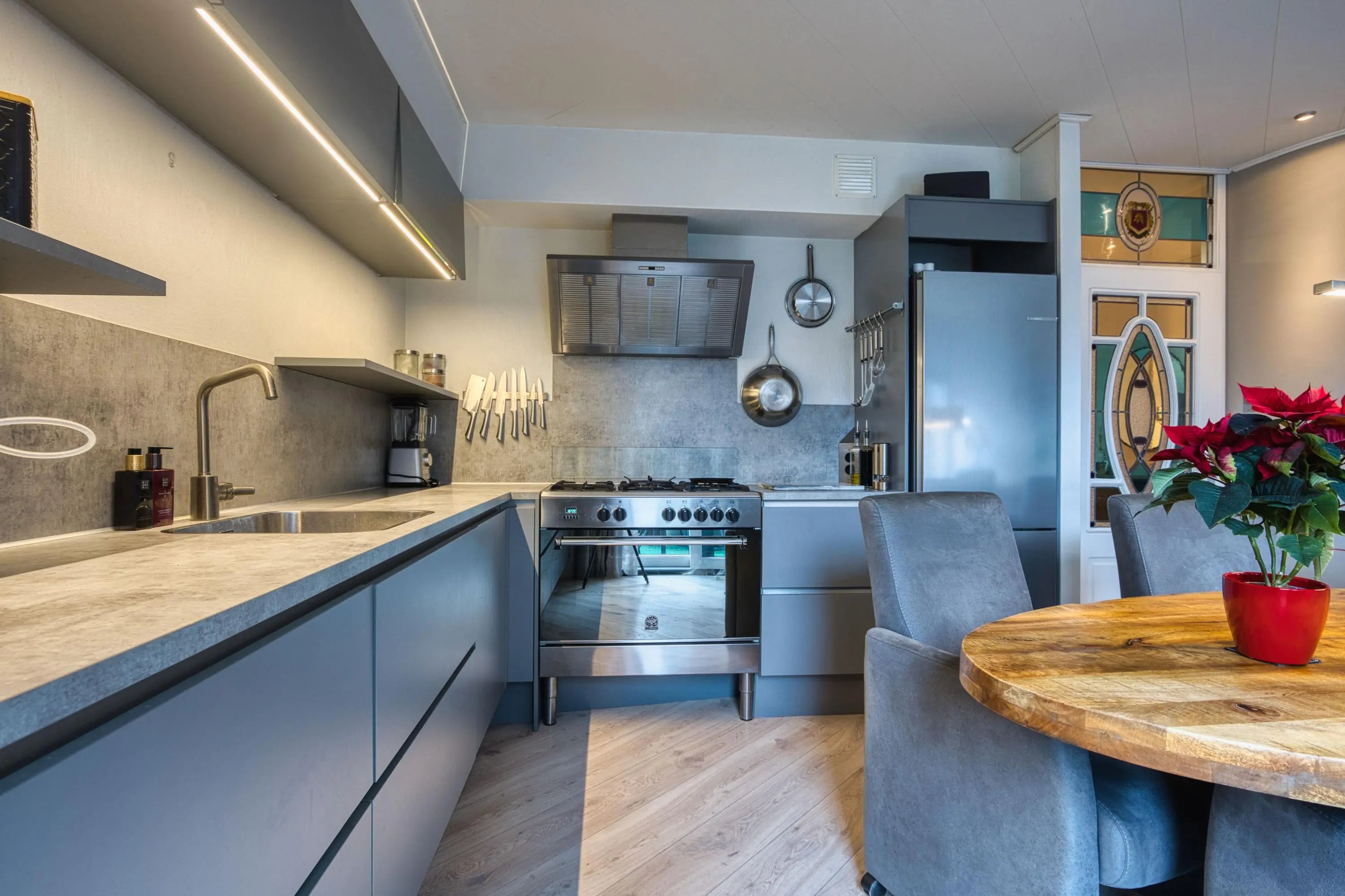 Welkom in de royale hal met toiletruimte, trapopgang en binnendoor naar de praktische inpandige garage. De lichte, straatgerichte woonkamer heeft een gezellige haardkachel en een speelse indeling. Aan de tuinzijde bevindt zich de ruime woonkeuken met schuifpui naar de achtertuin. De keuken is opgesteld in L-vorm en voorzien van o.a. een ingebouwd gasfornuis, combi magnetron, vaatwasser en afzuigkap.