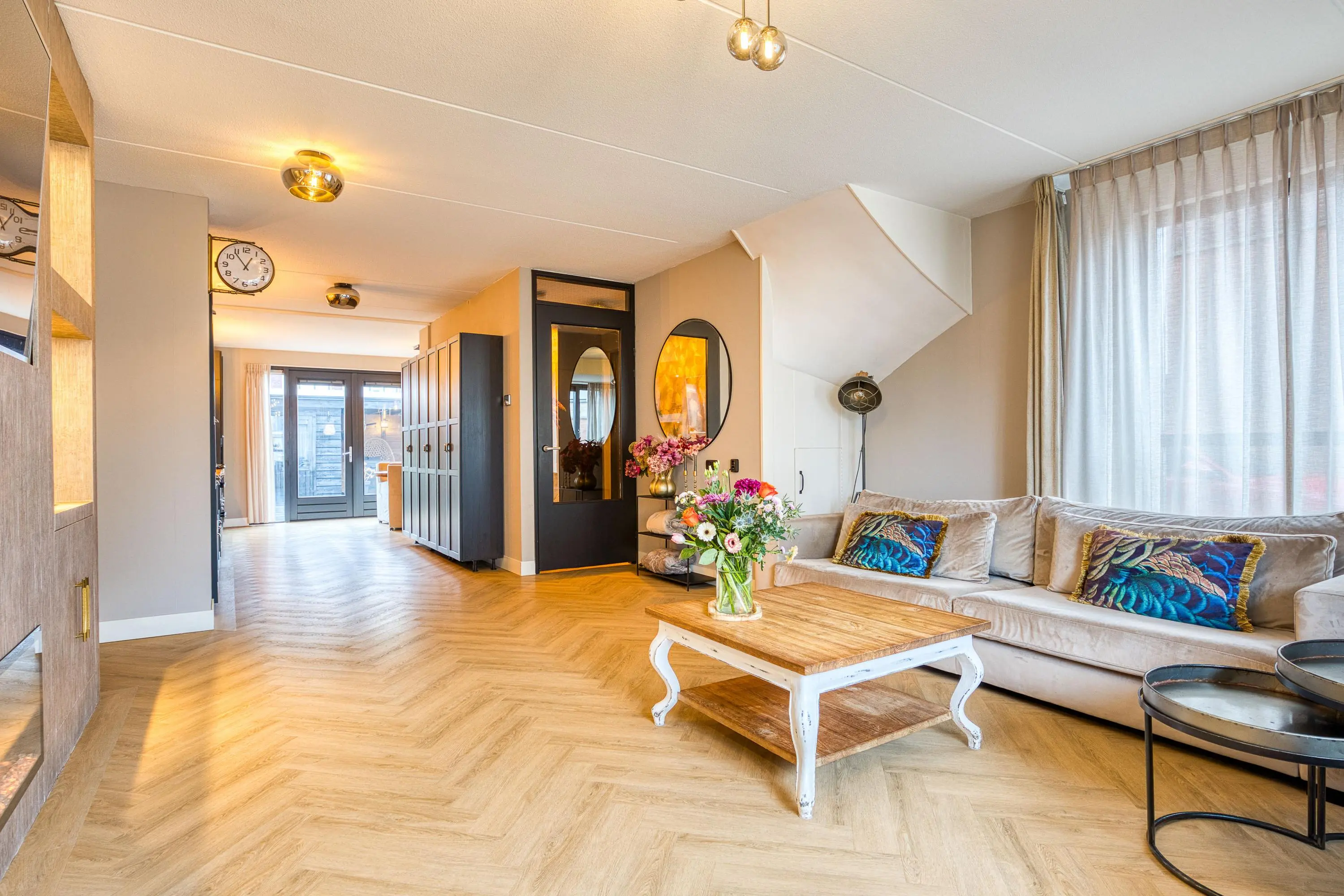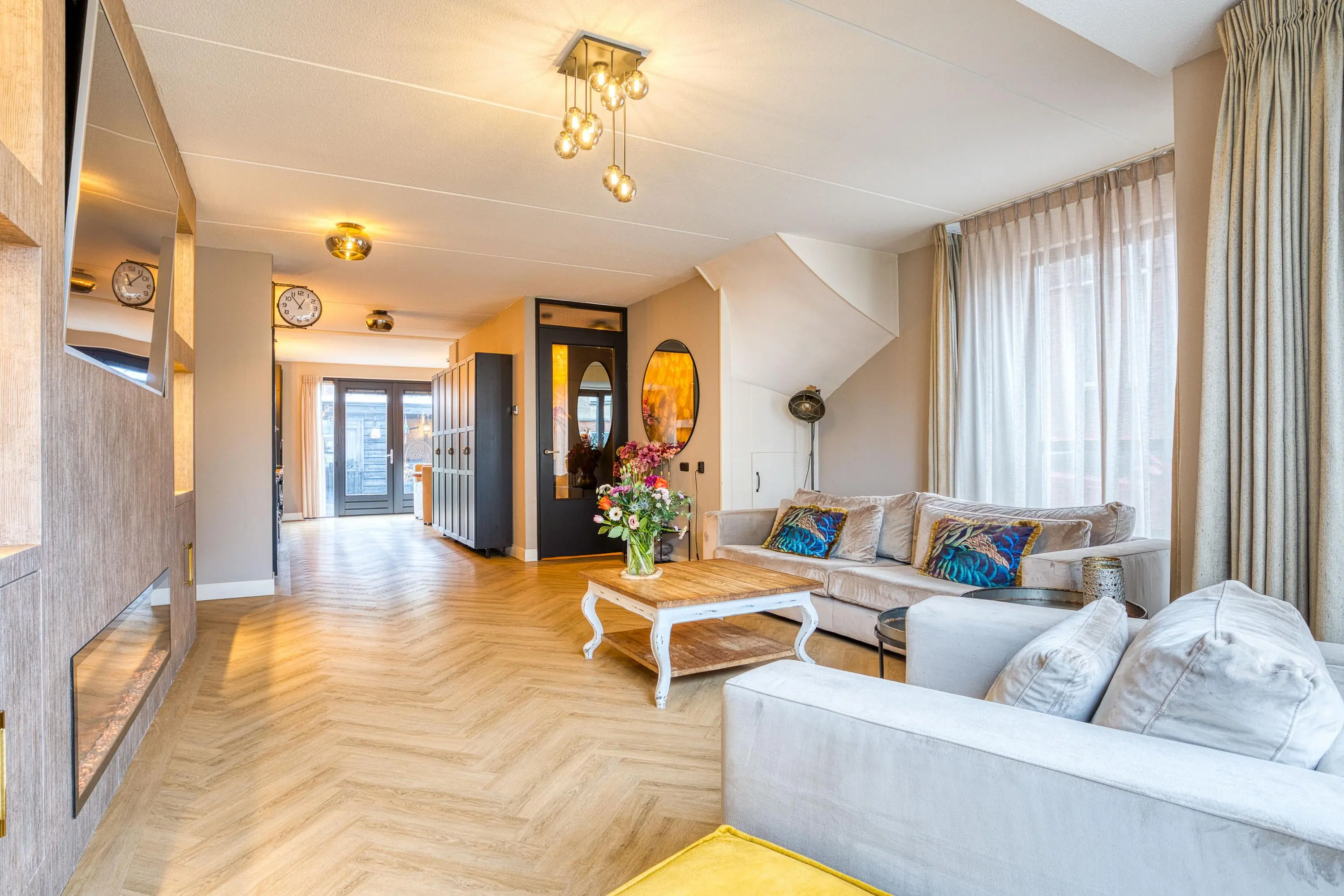 Via de entree bereikt u de royale, uitgebouwde woonkamer met fraaie erker, veel lichtinval en openslaande tuindeuren die zorgen voor een prachtige verbinding met de extra brede tuin. De nagelnieuwe visgraatvloer, de sfeervolle haard en de indrukwekkende cinema wall maken dit een heerlijke plek om te ontspannen.