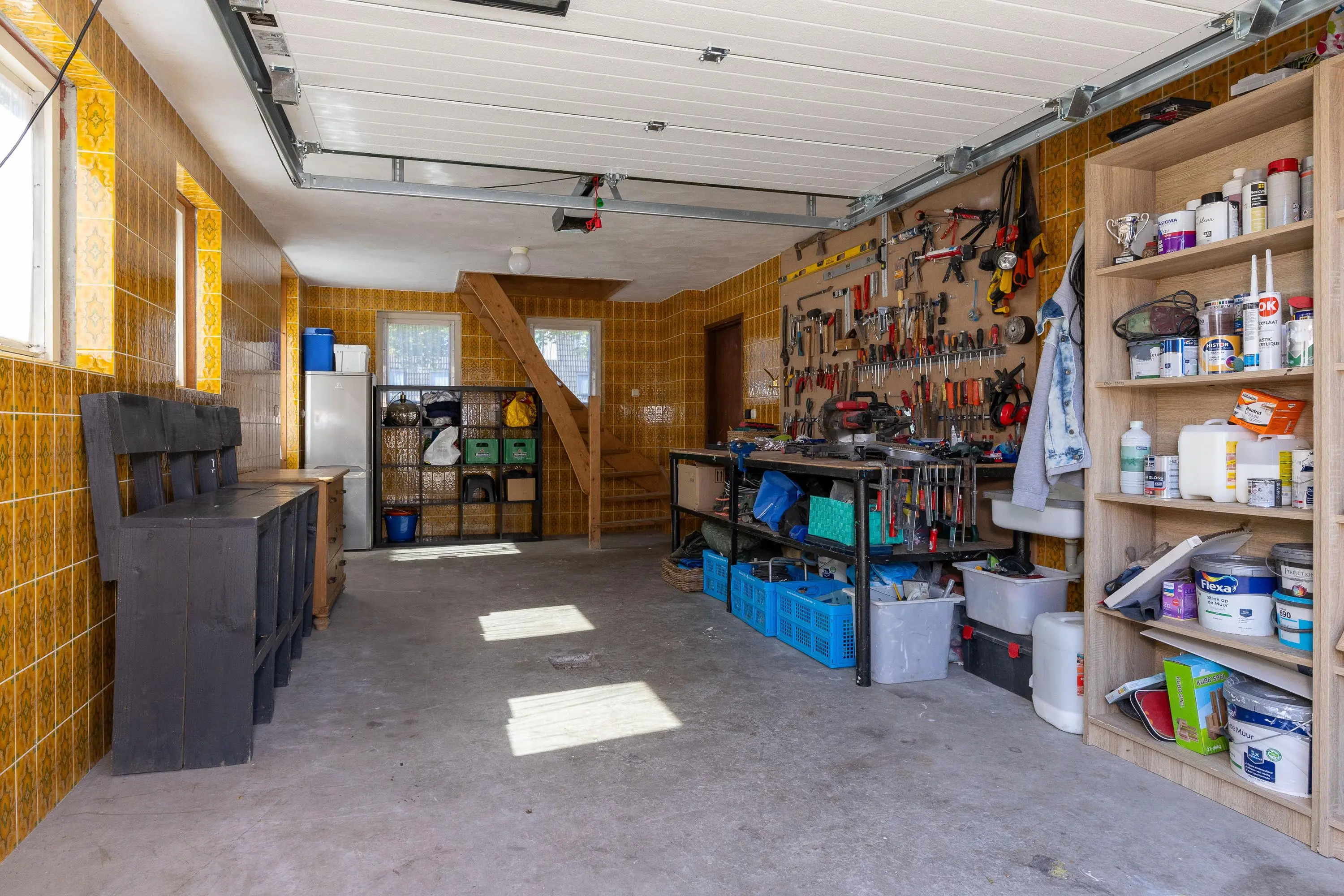 De garage is voorzien van een kap en recent uitgerust met een nieuwe elektrisch bedienbare garagedeur. De verdieping boven de garage is uitstekend in te richten als slaapkamer of hobbyruimte. De begane grond is grotendeels voorzien van een plavuizenvloer met vloerverwarming.