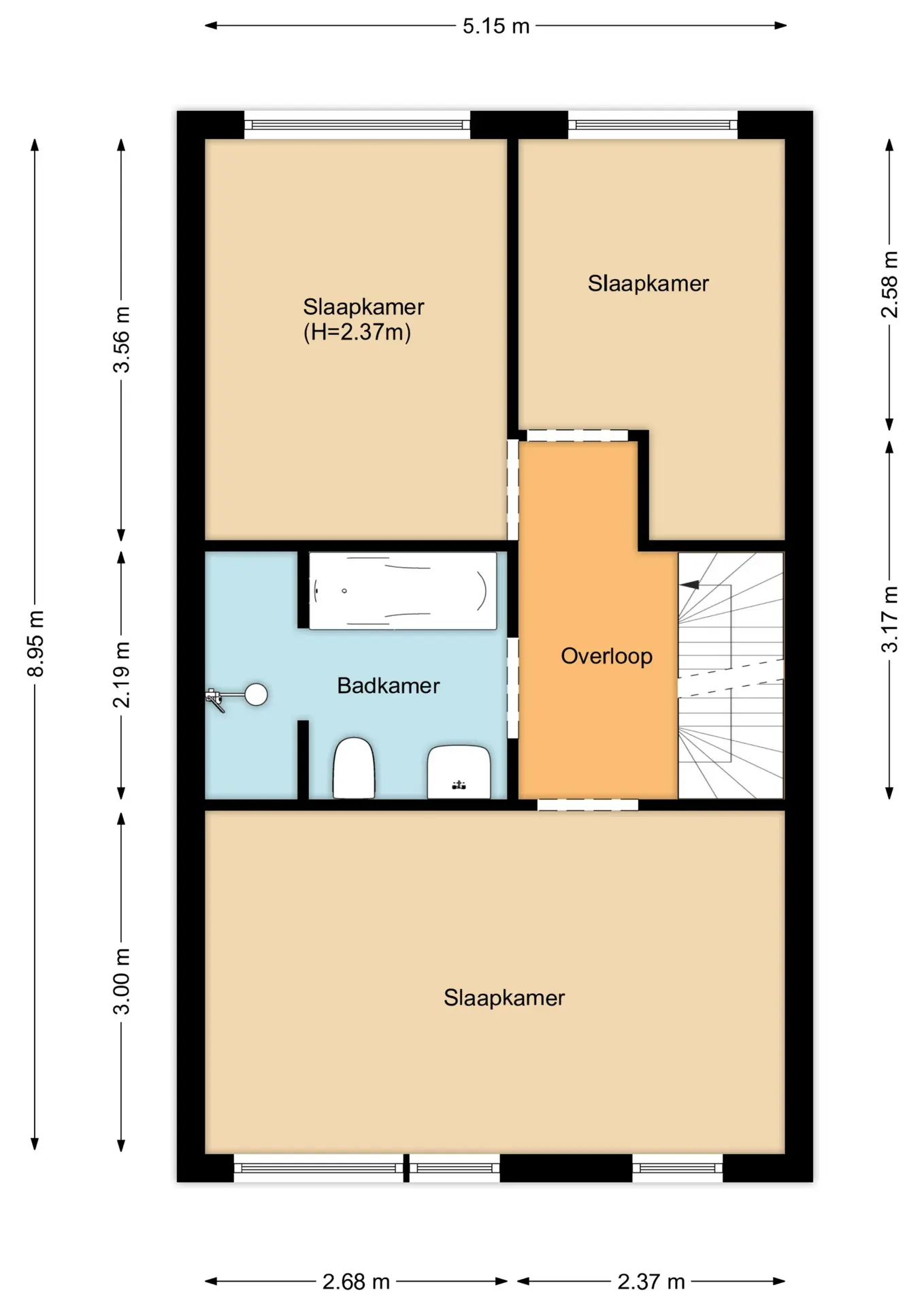Overloop, 2 slaapkamers aan de achterzijde, ruime slaapkamer aan de voorzijde over de breedte van de woning. De vloer op de 1ste verdieping is afgewerkt met een laminaatvloer. De luxe badkamer is voorzien van een inloopdouche, ligbad, wastafelmeubel, een 2e wandcloset en vloerverwarming.