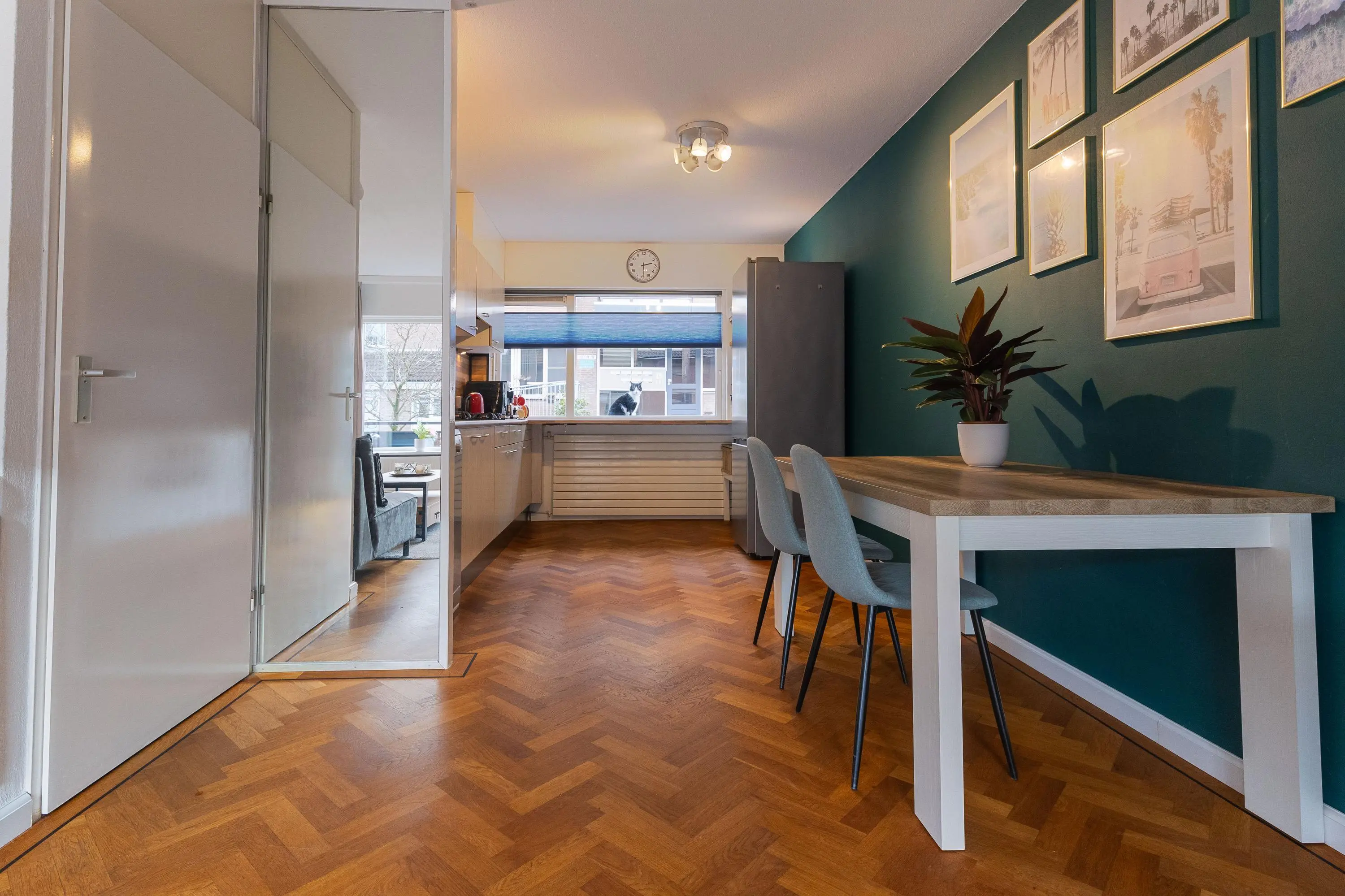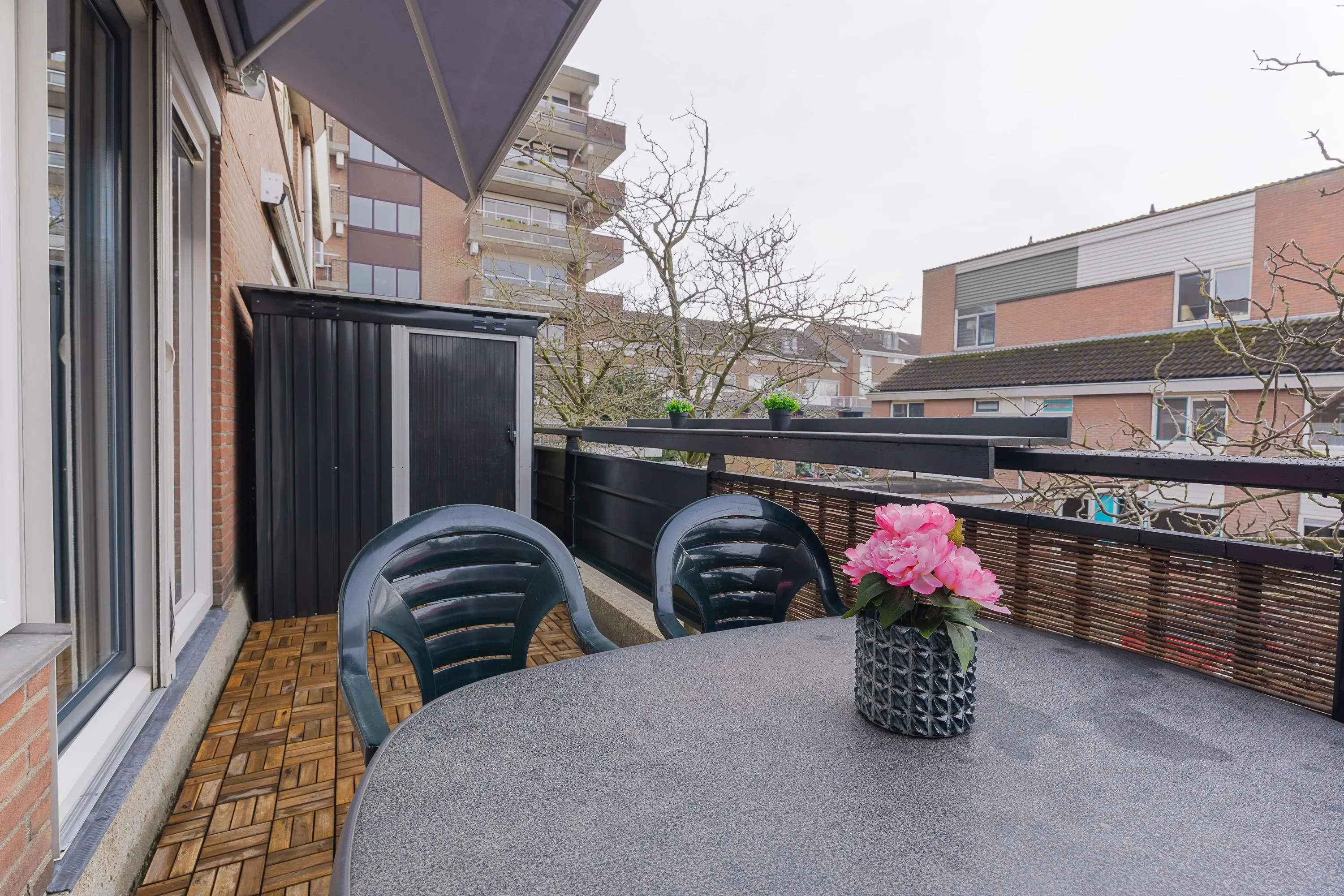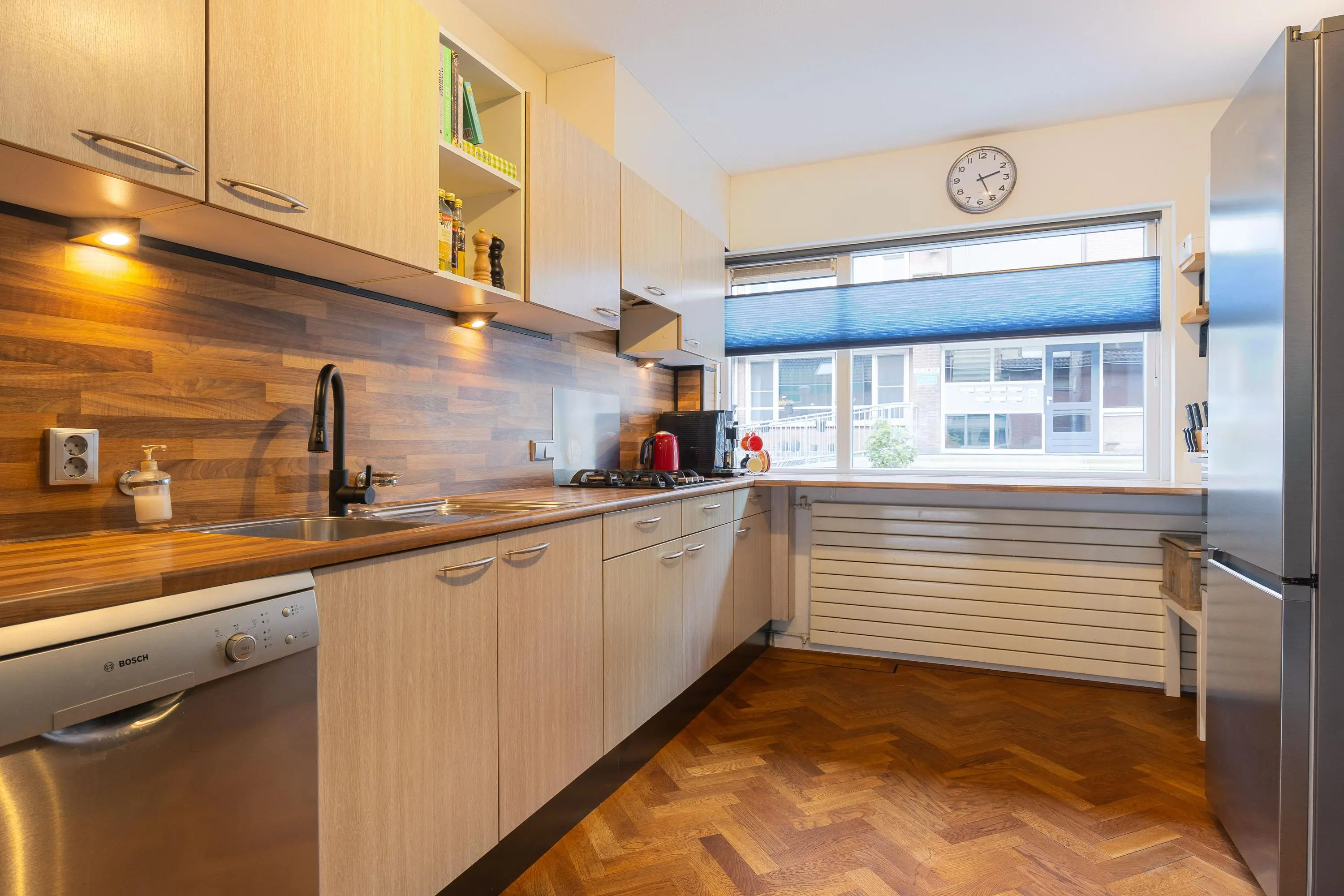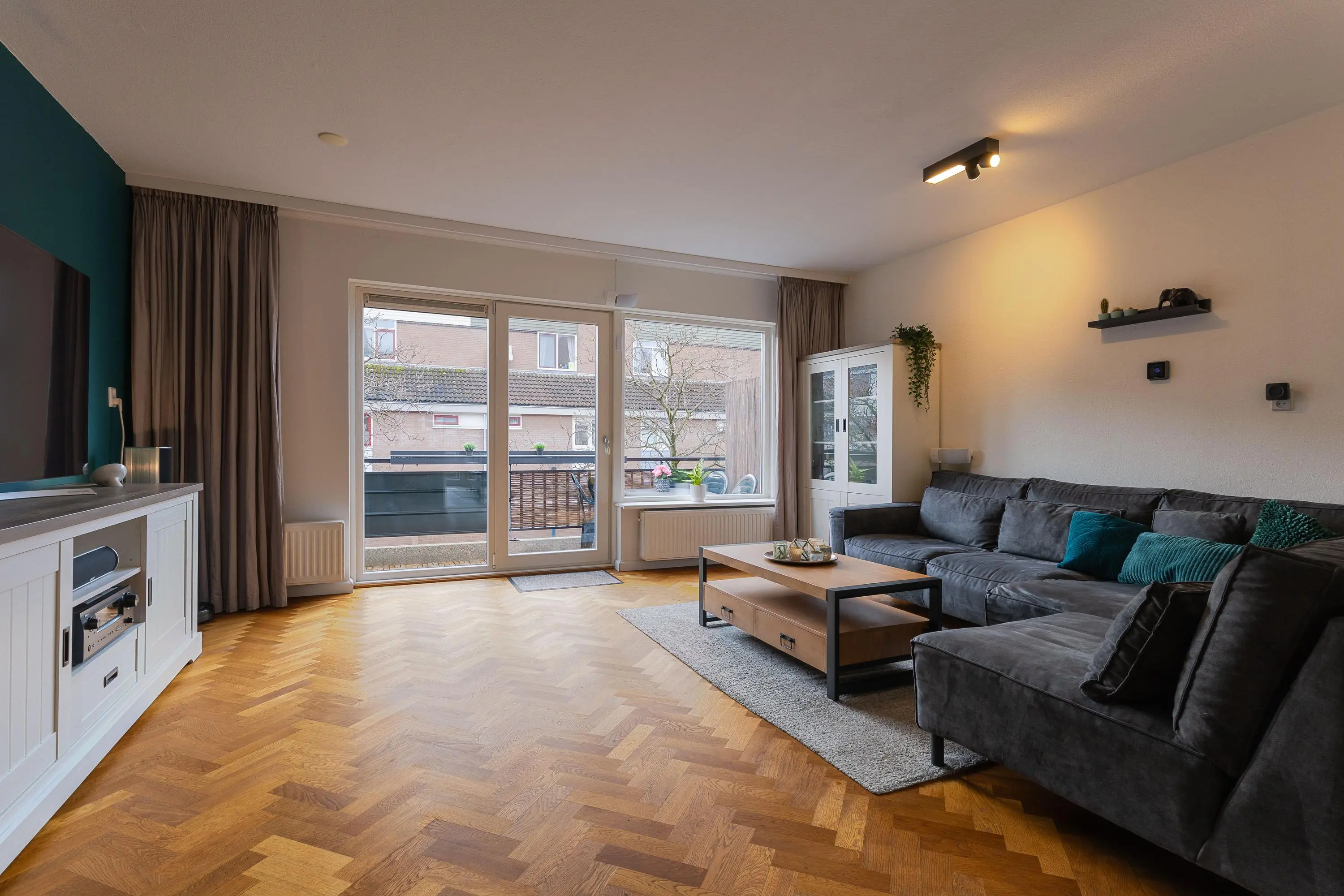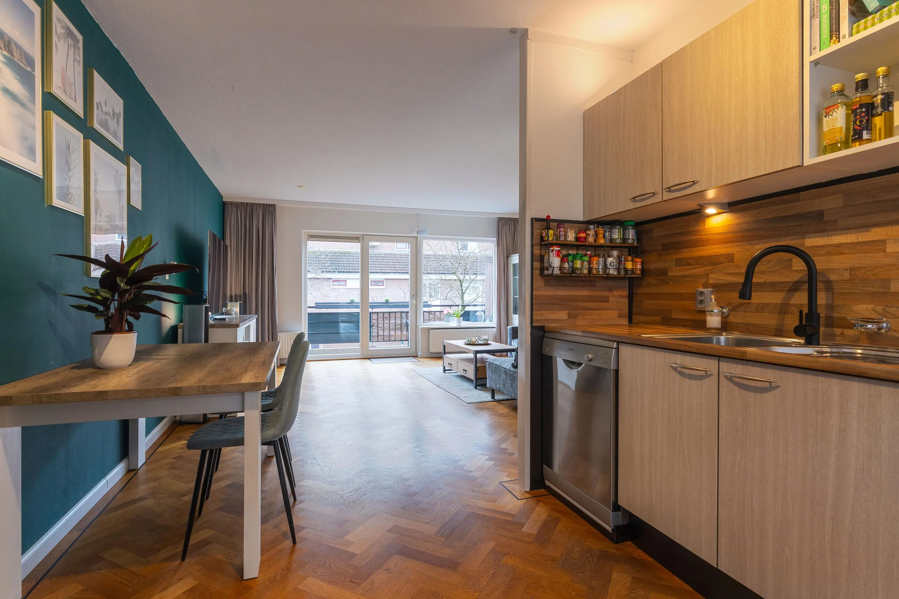 De lichte living met fraaie vissengraat parketvloer sluit aan op het balkon op het zuidwesten, voorzien van zonnescherm. Een comfortabele plek om tot in de avond van de zon te genieten. De halfopen keuken is verzorgd en functioneel, passend bij het geheel.