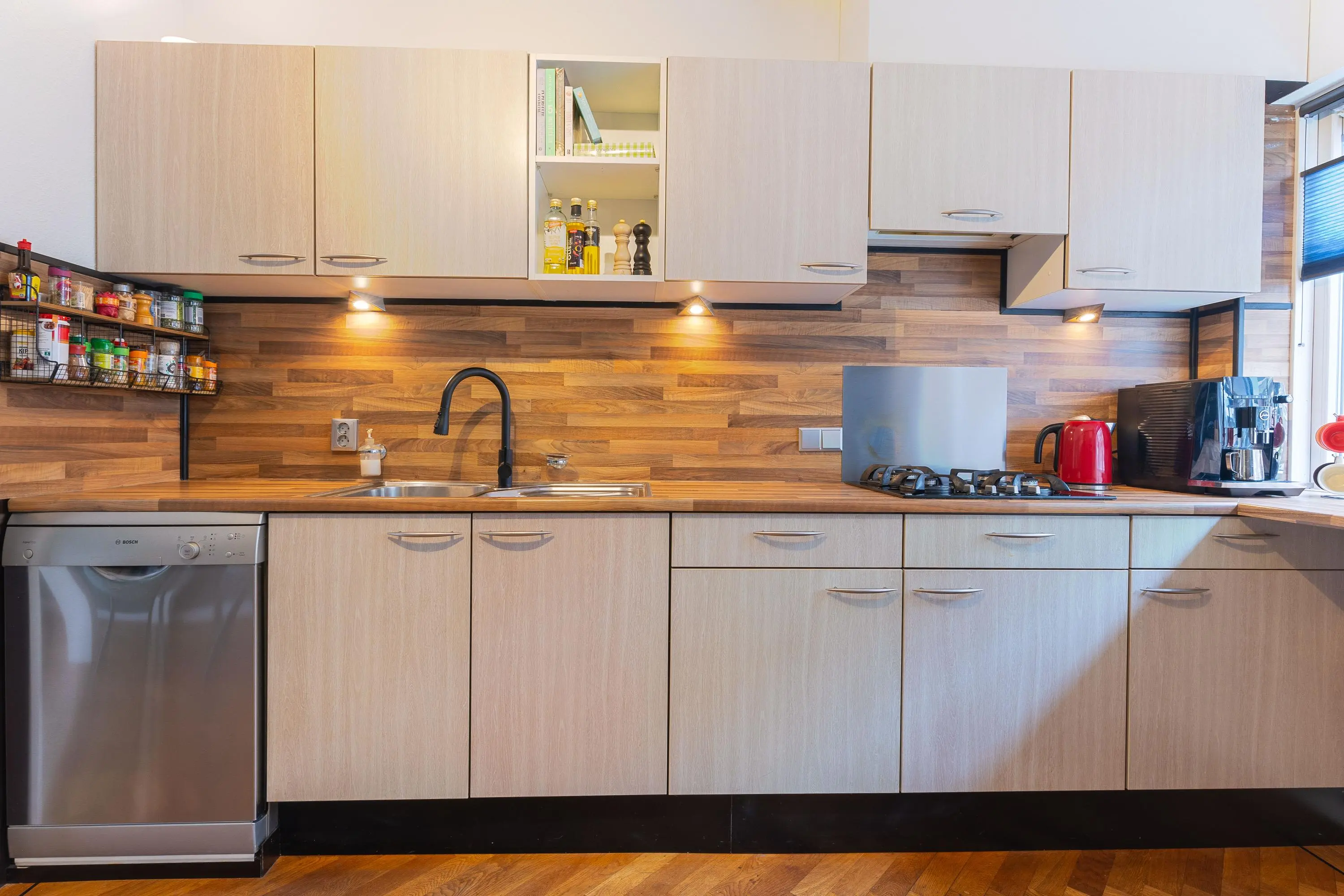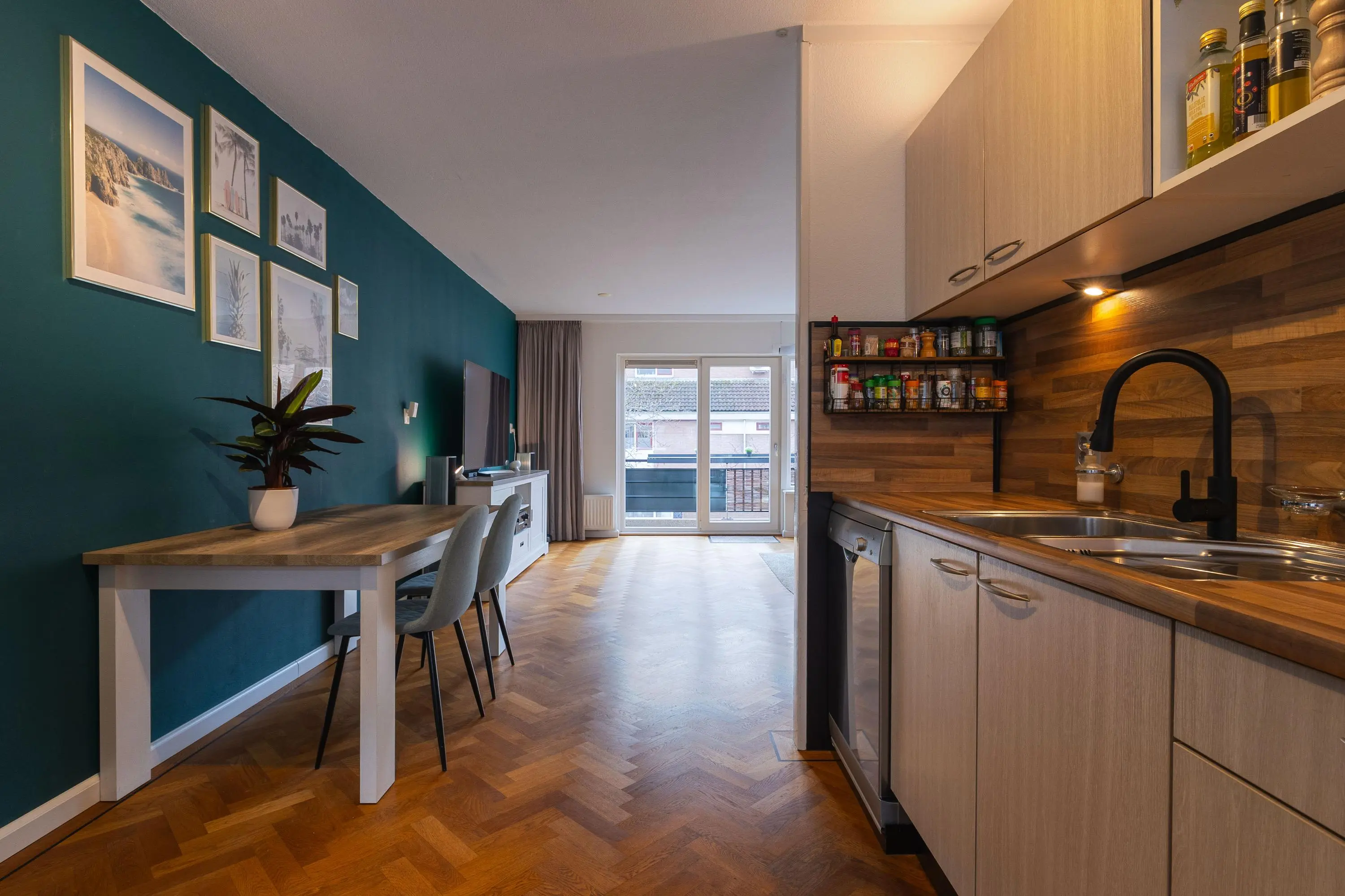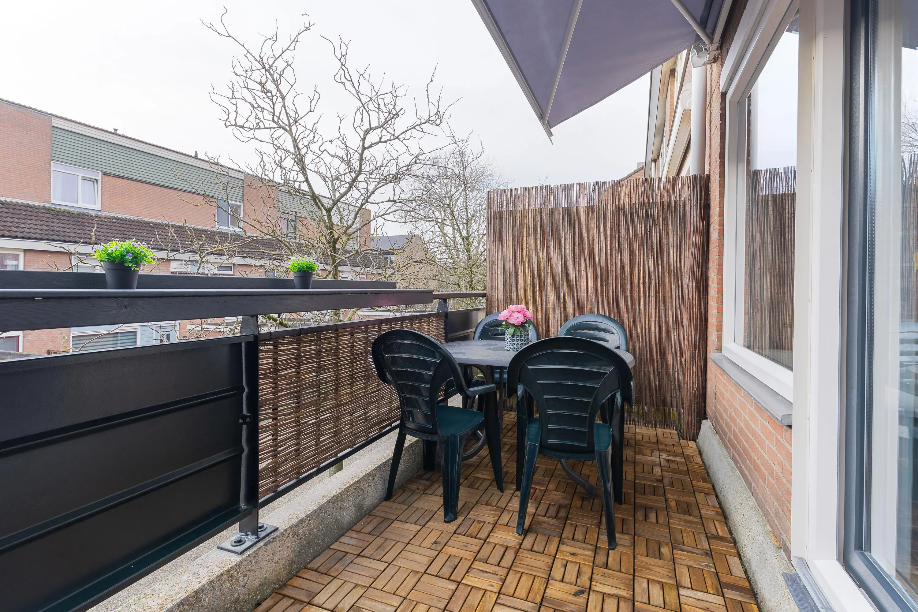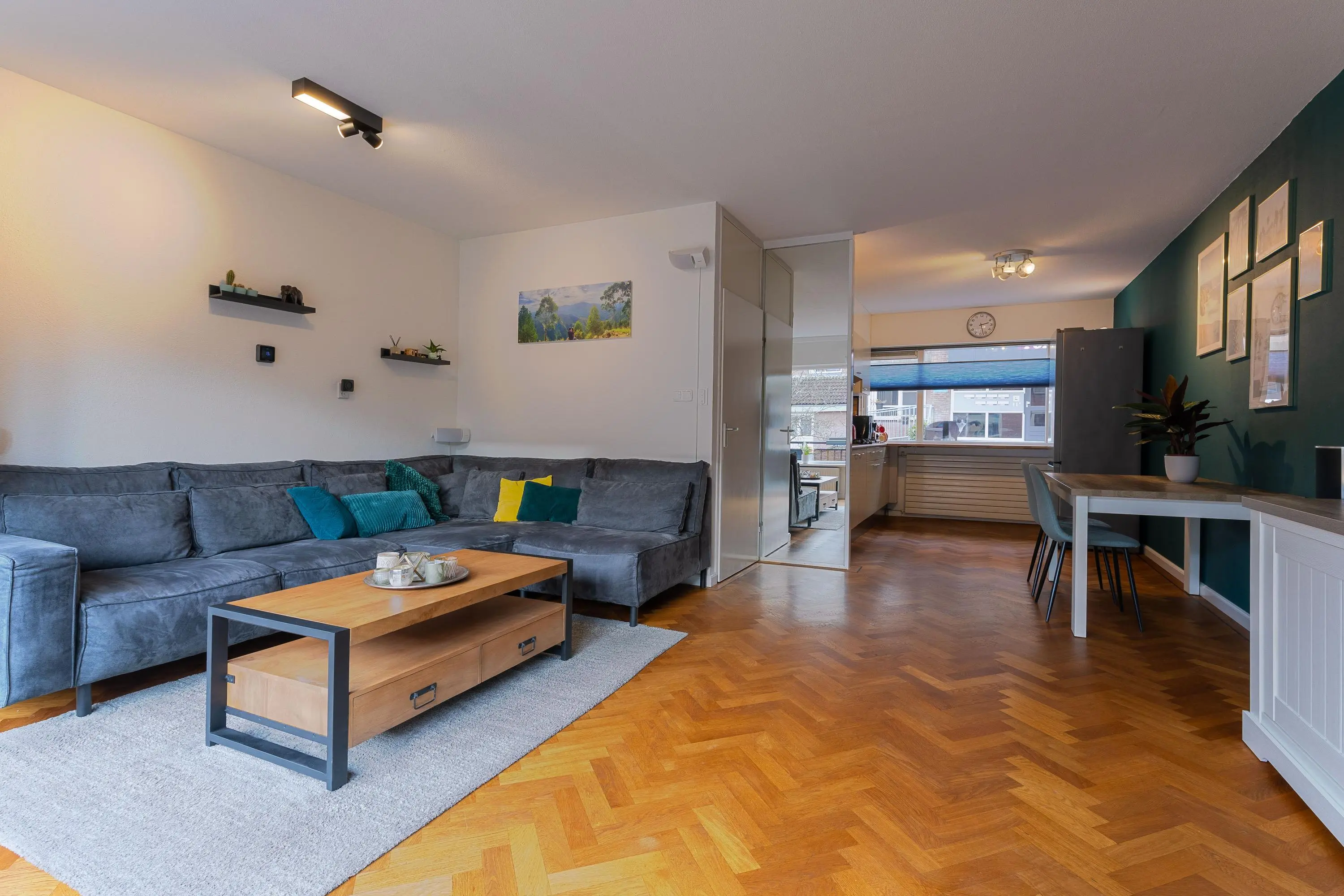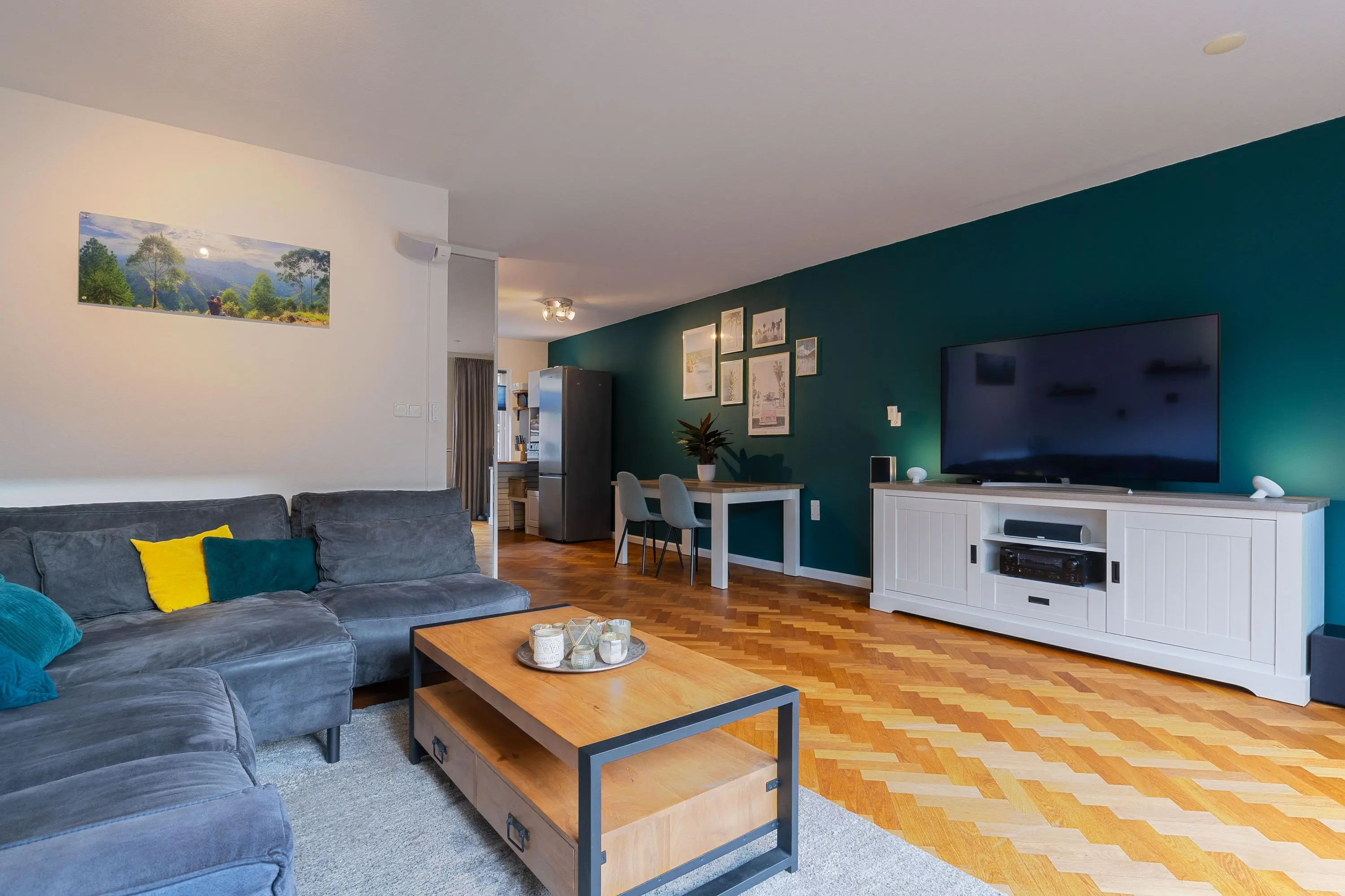 De lichte living met fraaie vissengraat parketvloer sluit aan op het balkon op het zuidwesten, voorzien van zonnescherm. Een comfortabele plek om tot in de avond van de zon te genieten. De halfopen keuken is verzorgd en functioneel, passend bij het geheel.