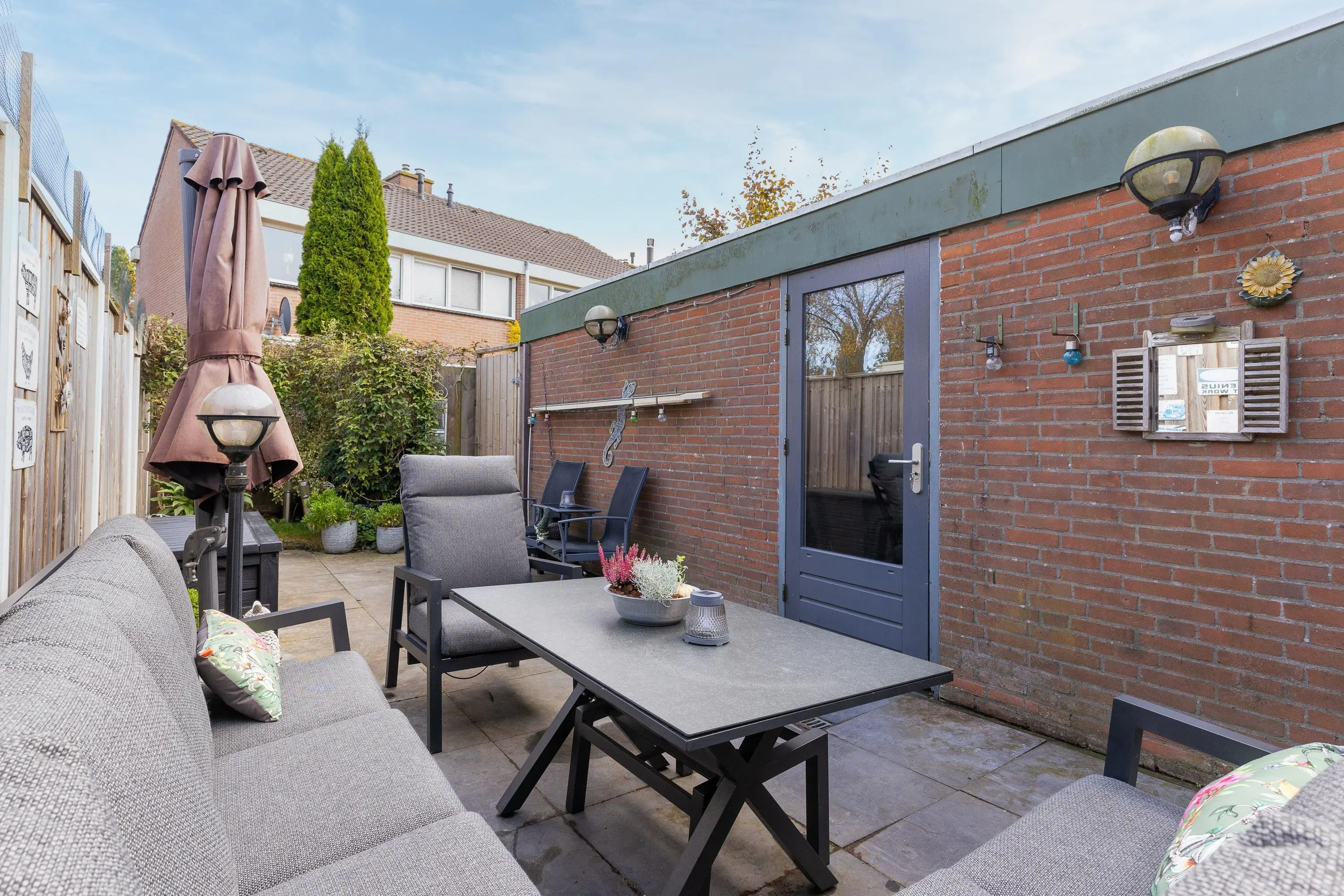 De tuin beschikt over een achterom en een vrijstaande stenen berging – praktisch voor fietsen, gereedschap of hobby’s.