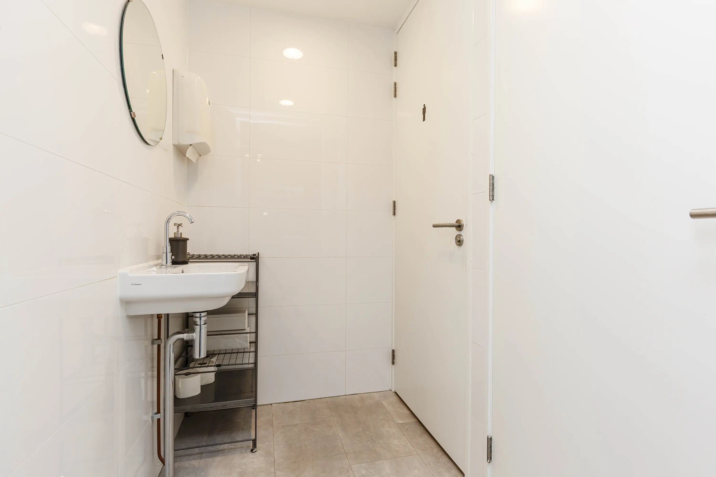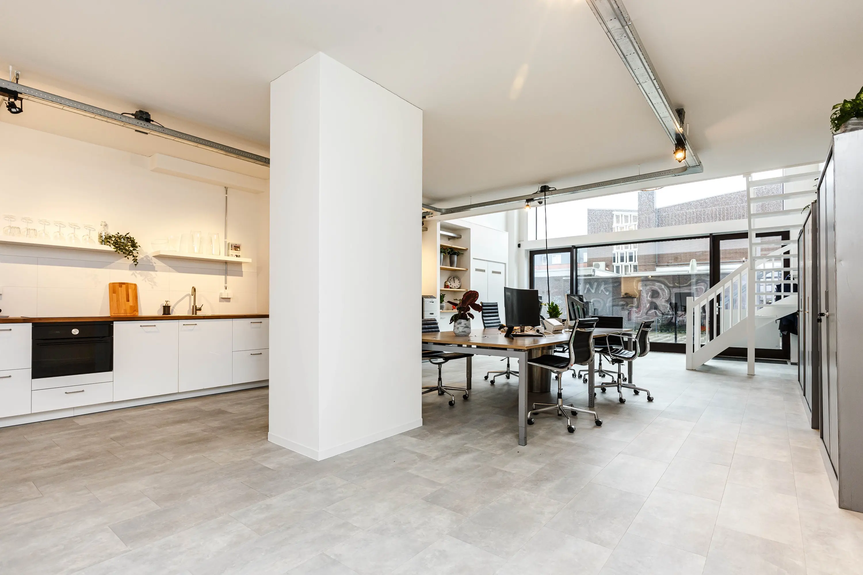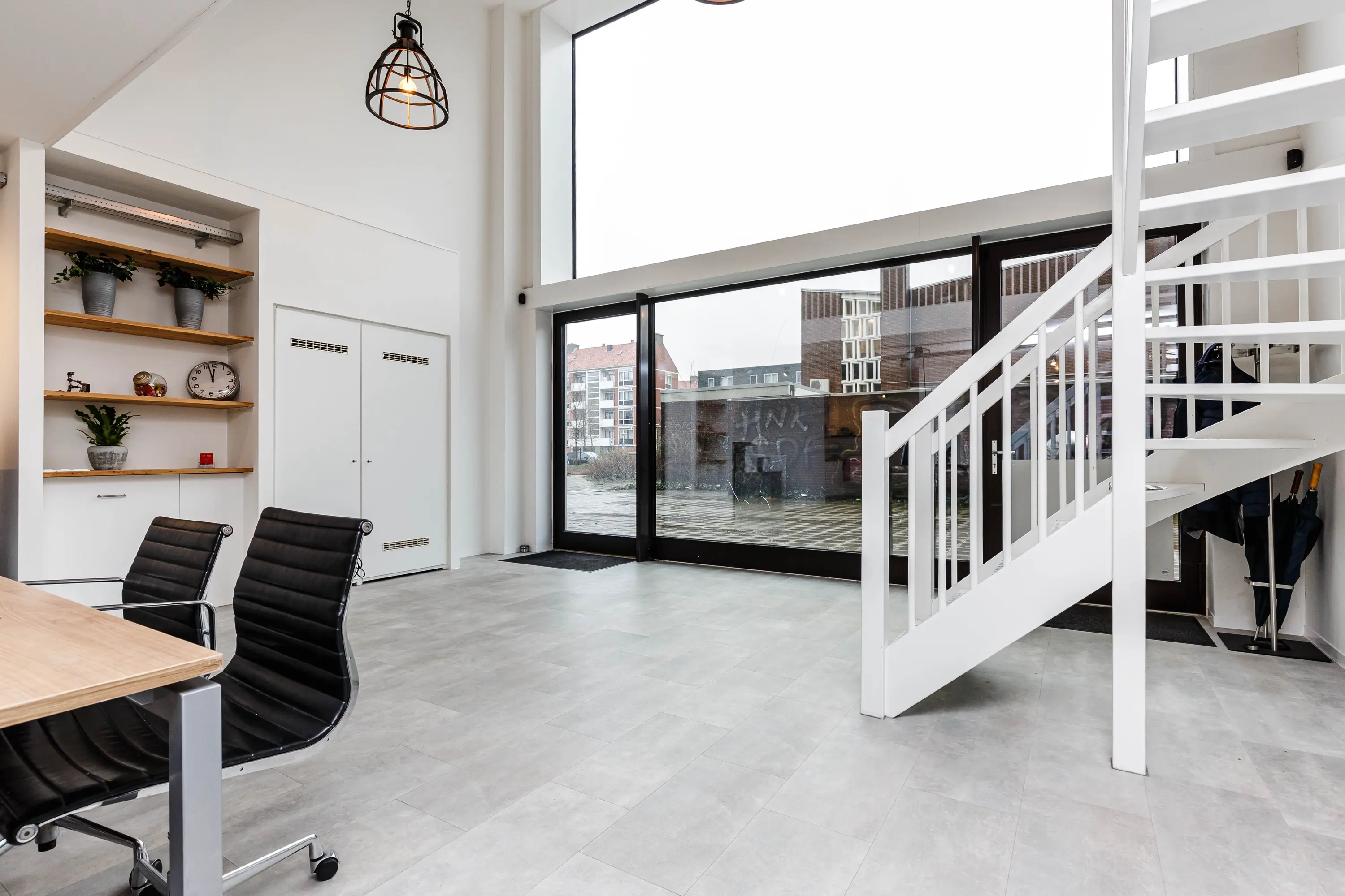 Bij binnenkomst valt direct de fantastische plafondhoogte op en krijgt de ruimte door de glazen voorzijde een zee van licht. Op de begane grond van ongeveer 78 m2 bevindt zich in de huidige situatie het kantoor met achterin de keuken. Via de trap bereikt u de mezzanine met o.a. een overlegruimte en twee separate toiletten.