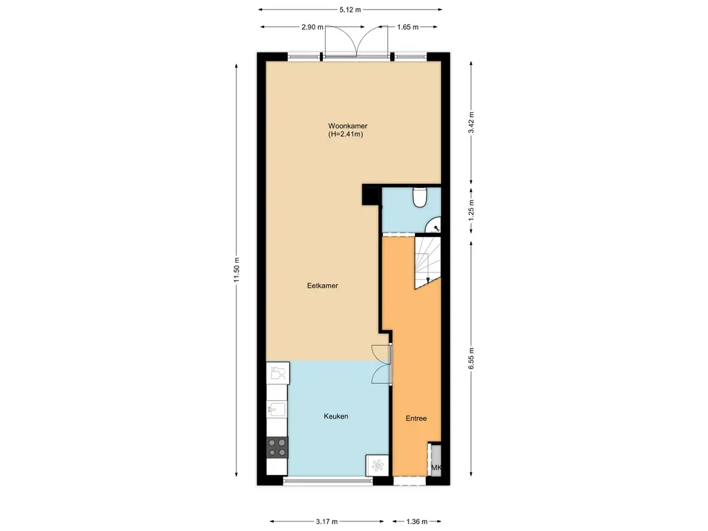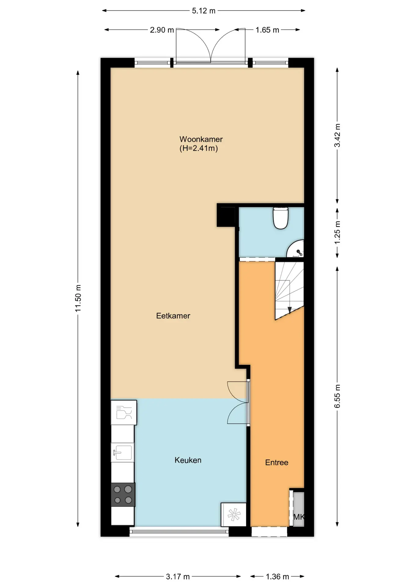 Via de voordeur stap je de hal met toilet en trap naar boven binnen. Wat gelijk opvalt zijn de ruimte makende openslaande glazen deuren naar de woonkamer met open keuken aan de voorzijde. De ruime zitkamer vindt je aan de achterzijde van de woning. Via de openslaande deuren is de zonnig gelegen achtertuin te betreden.