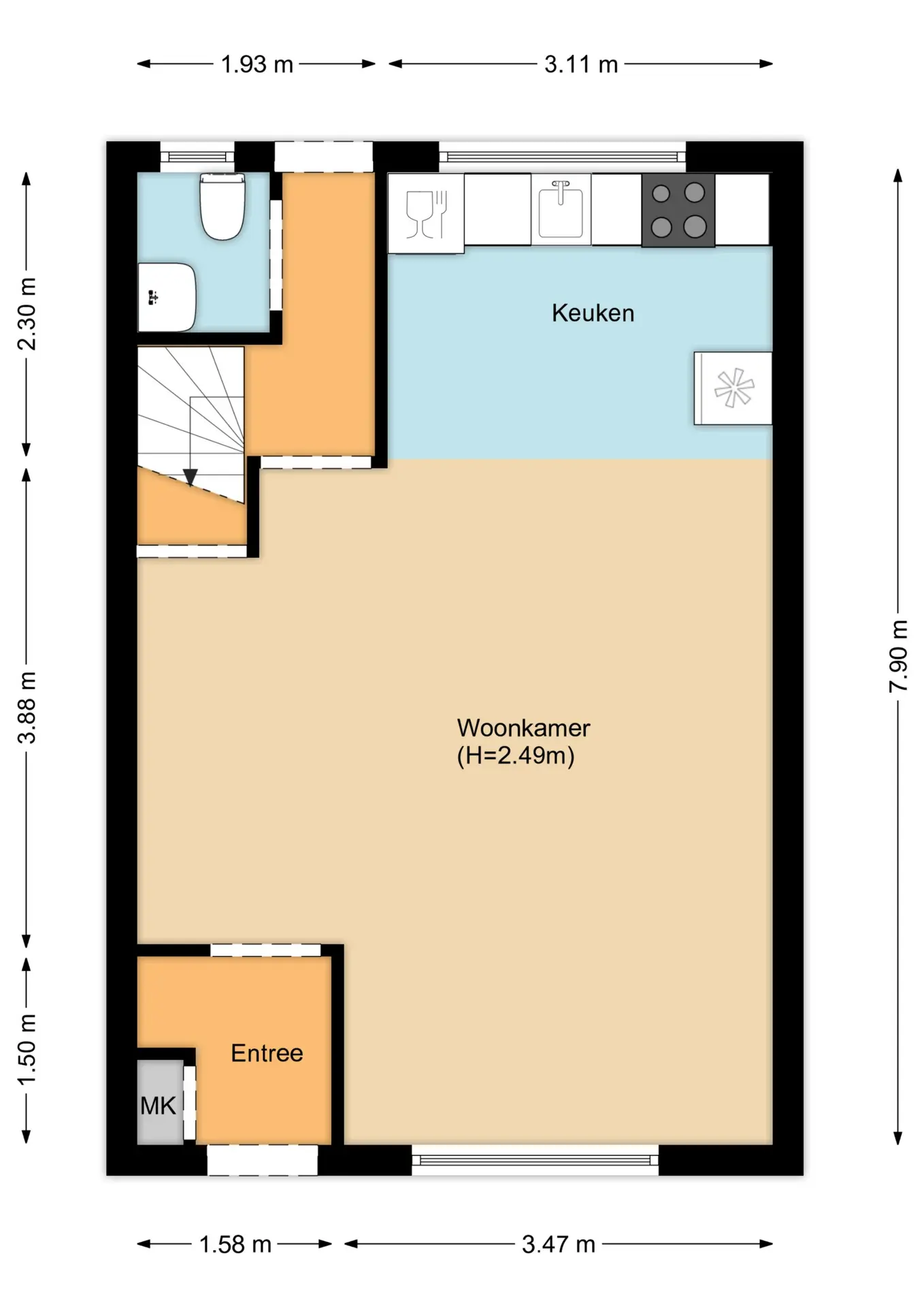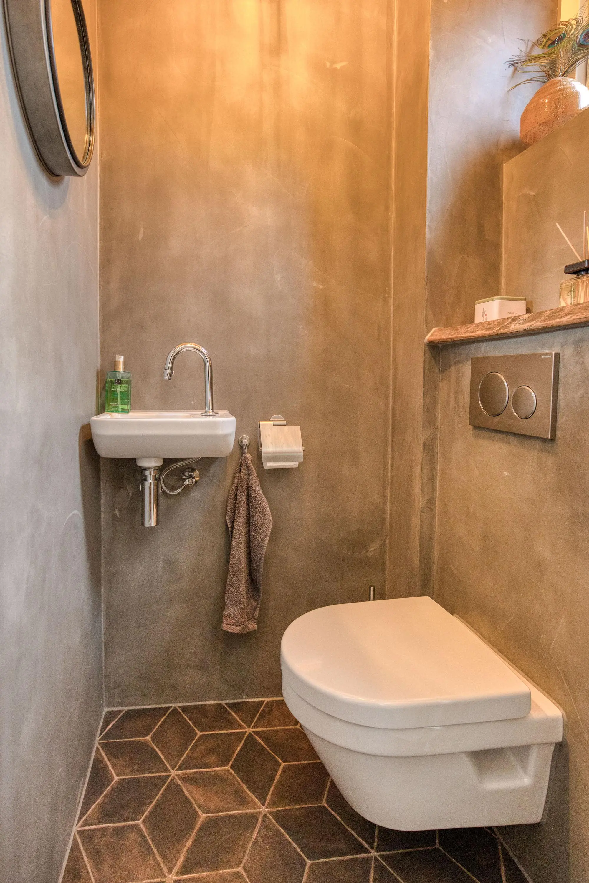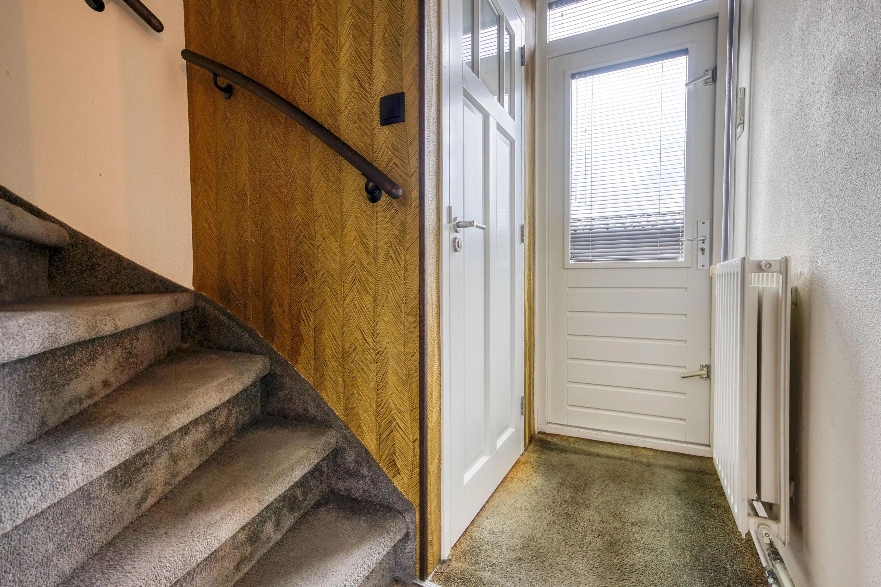 Bij binnenkomst treft u een nette hal met meterkast. De lichte, open woonkamer biedt volop ruimte voor een gezellige zithoek en eethoek. Aan de achterzijde bevindt zich de keuken, eenvoudig maar functioneel. Via de achterhal bereikt u het moderne toilet (afgewerkt met beton ciré), de trapopgang en de zonnige achtertuin.