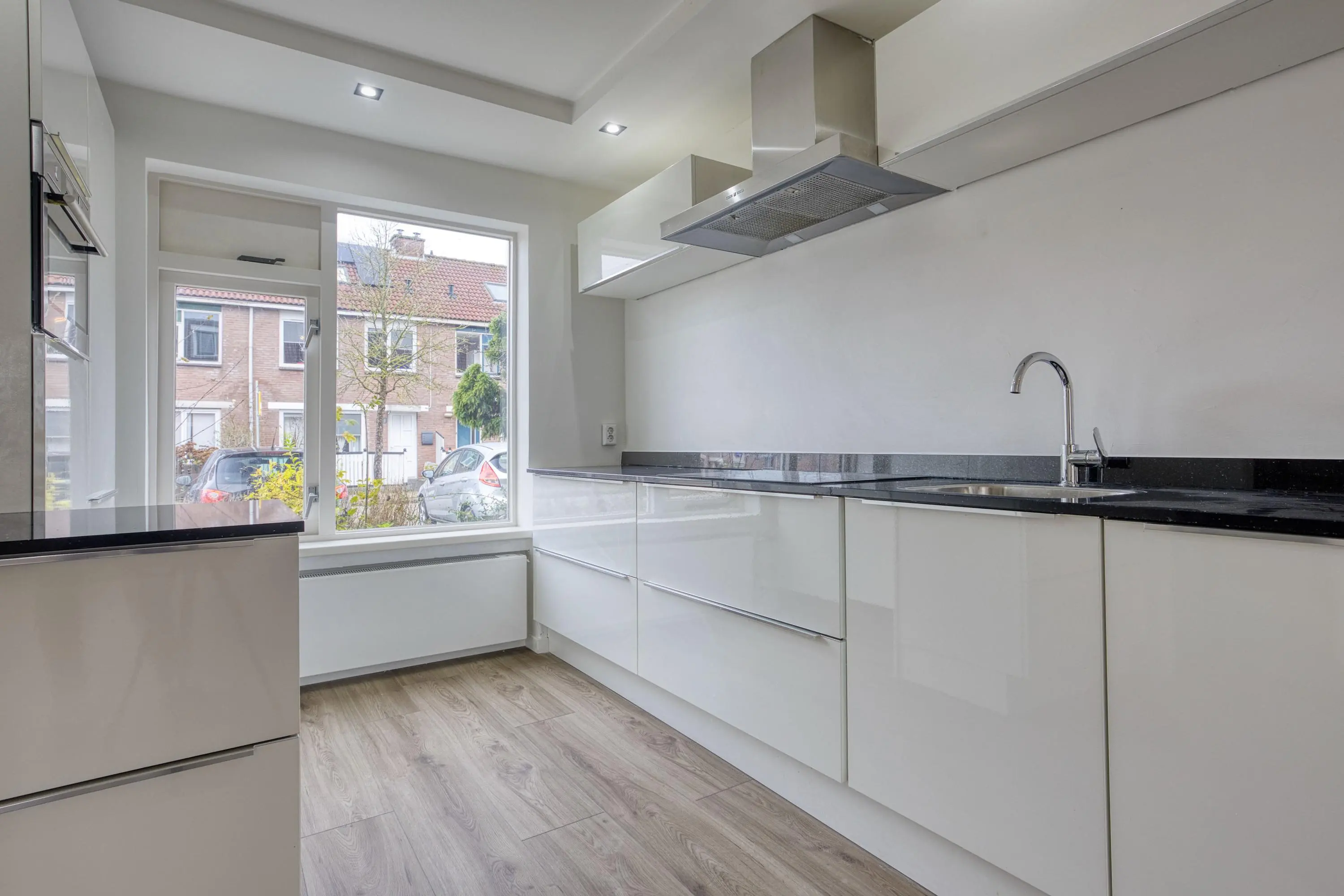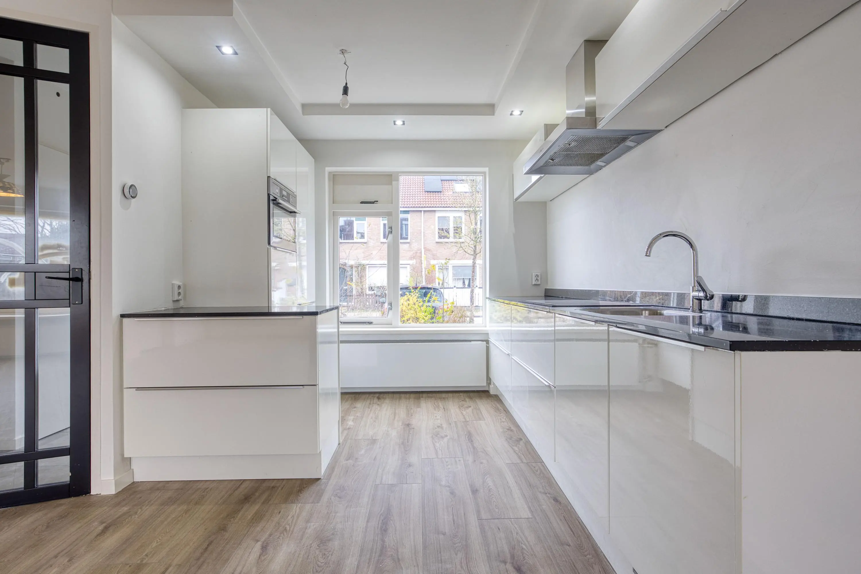 De lichte woonkamer met laminaatvloer vormt het hart van de woning. Aan de achterzijde stap je via de tuindeur de onderhoudsvriendelijke achtertuin in, compleet met berging en achterom. De moderne keuken aan de voorzijde is stijlvol uitgevoerd met een dubbele rechte opstelling, schiereiland, spotverlichting en diverse inbouwapparatuur.