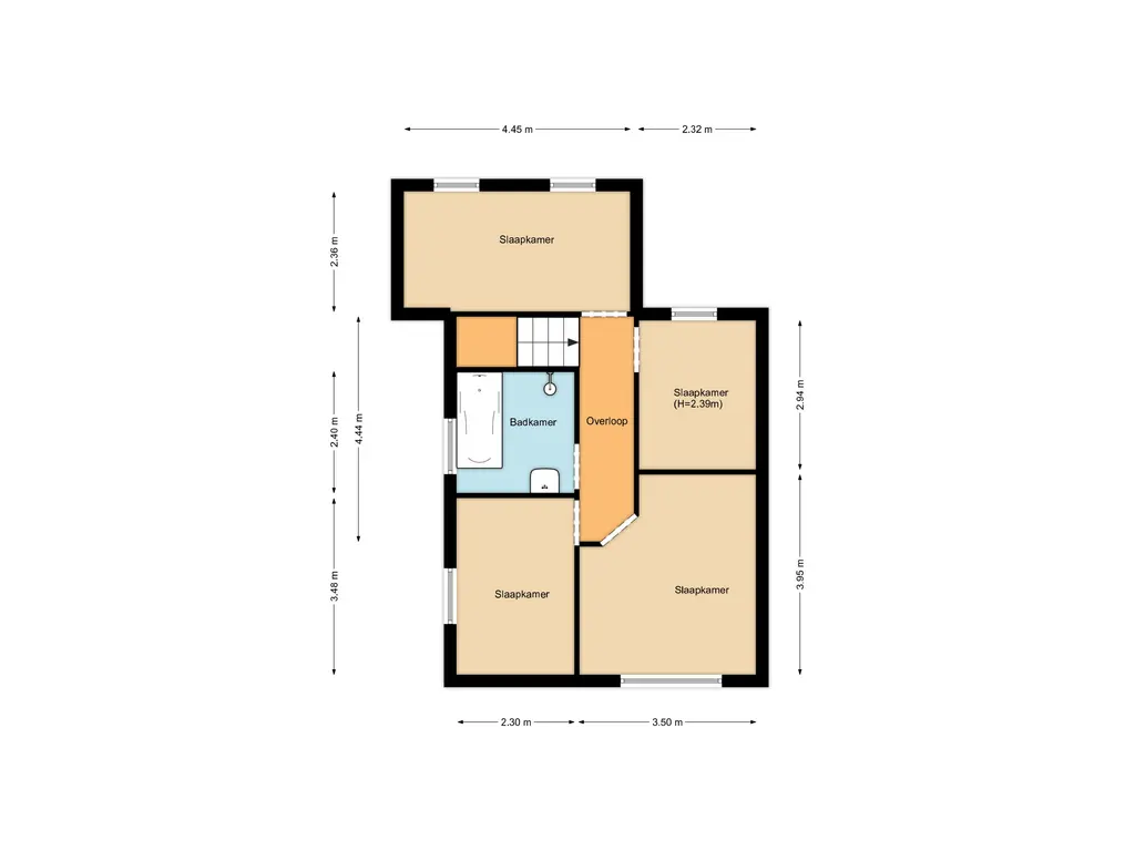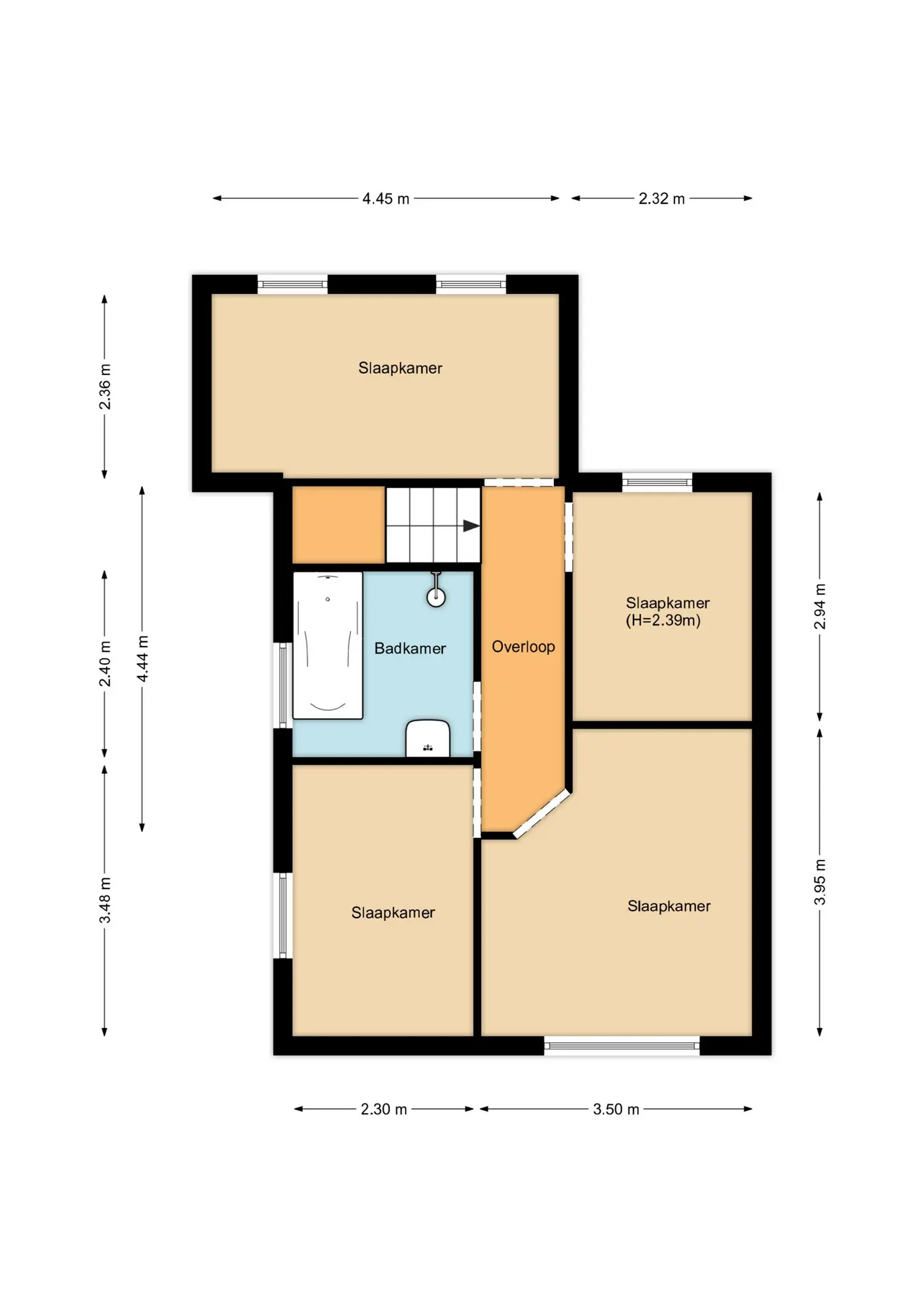 1e verdieping – Overloop met toegang tot vier slaapkamers (twee voor, twee achter) en de luxe badkamer.