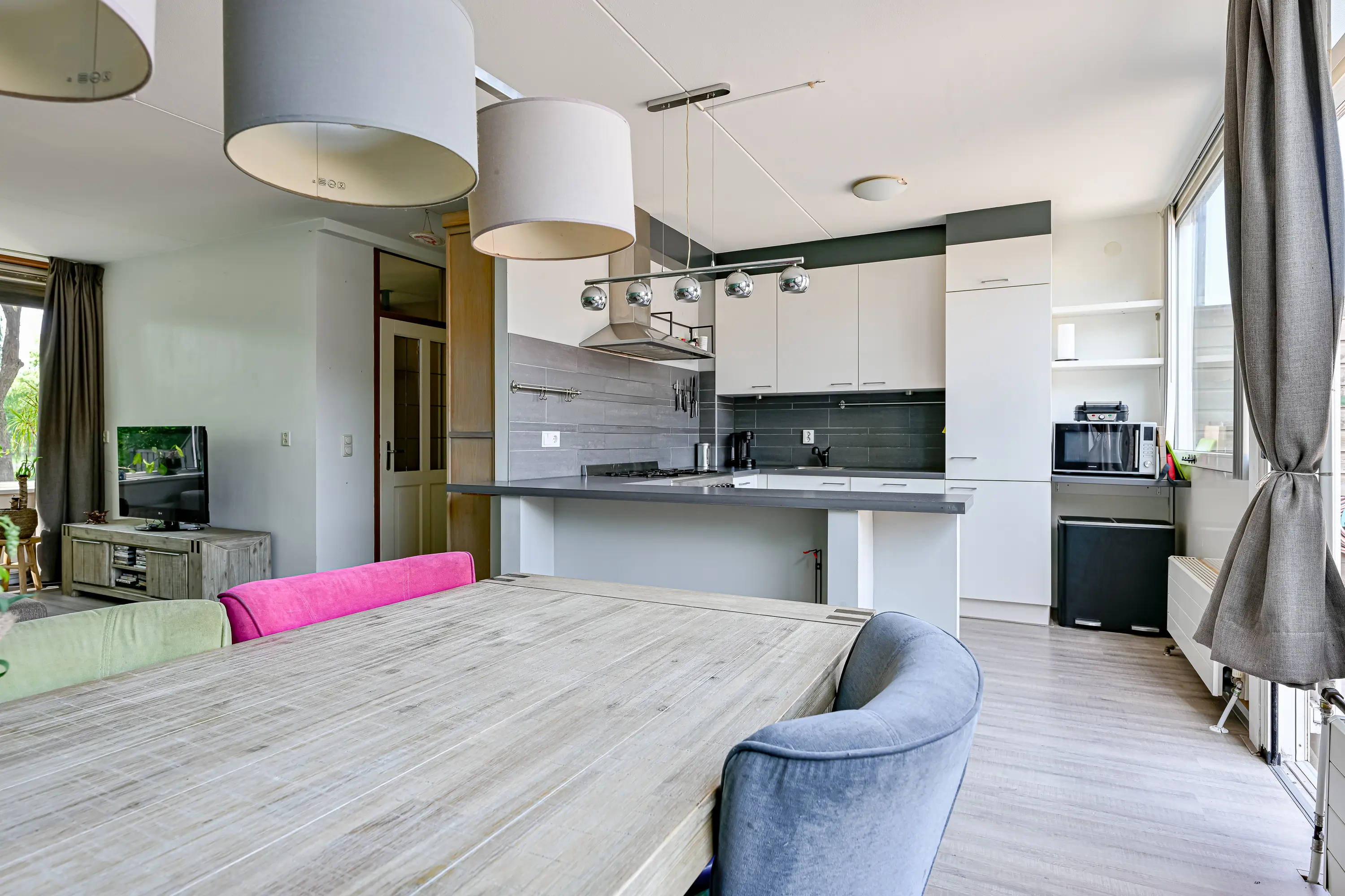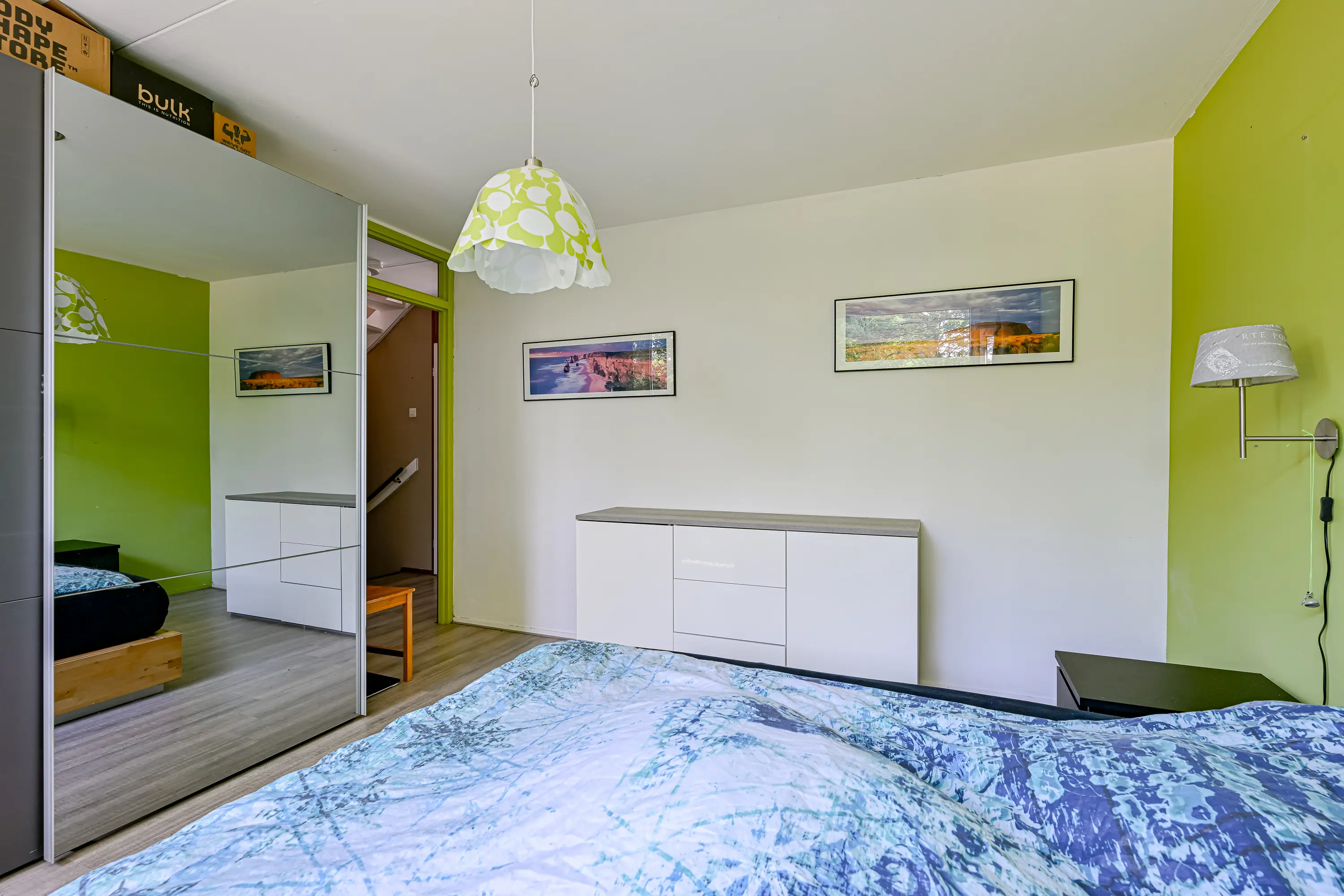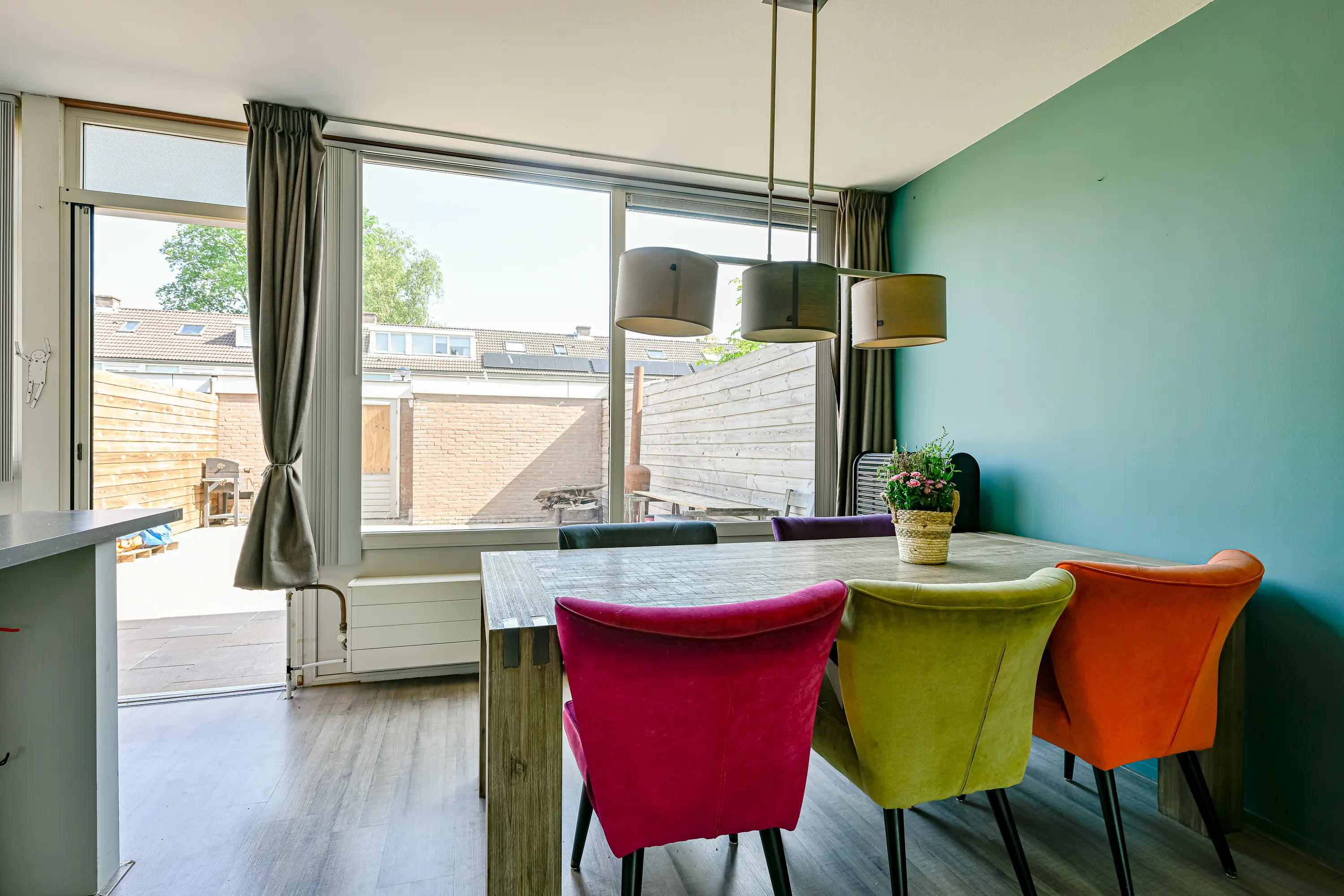 Begane grond: De entree/hal geeft toegang tot de trap naar boven, meterkast, toilet en de deur naar de woonkamer. De woonkamer is ruim en door de open keuken is er een fijne verbinding ontstaan tussen de zithoek en de eetkamer. Aan de voorzijde is op dit moment het zitgedeelte geplaatst vanwaar u zicht heeft op de rustige straat en het openbaar groen wat kenmerkend is voor deze wijk. U heeft zelfs zicht op de waterpartij welke door de gehele wijk heenloopt. Aan de achterzijde vindt u de open keuken en de eethoek. Vanuit de eethoek heeft u zicht op achtertuin. De open keuken is voorzien van diverse inbouw apparatuur. U heeft onder andere de beschikking over een koel-vriescombinatie, Smeg gasfornuis, afzuigkap en een vaatwasser. Verder is er voldoende kastruimte om al uw keukengerei in op te bergen. De gehele benedenverdieping is voorzien van glad stucwerk en een keurige laminaatvloer.
