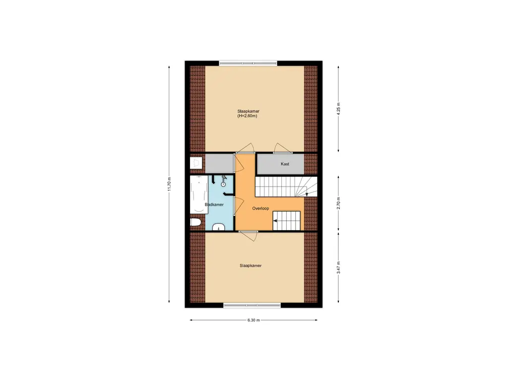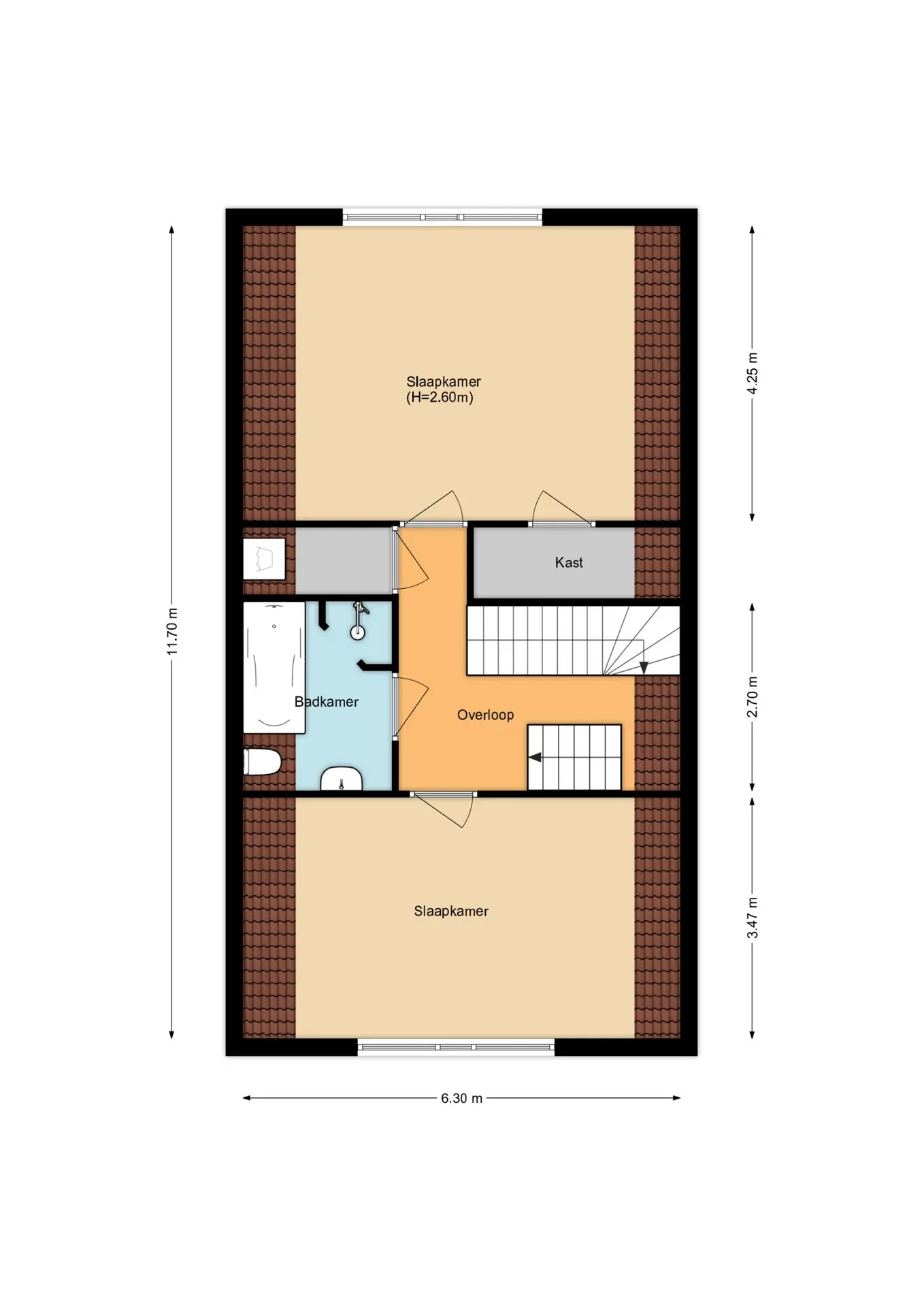 Ruime overloop met trap naar de 2e verdieping, toegang tot een ruime slaapkamer aan de voorzijde, badkamer met een hangcloset, wastafelmeubel, ligbad en een douchehoek, bergkast en een grote slaapkamer aan de achterzijde met een vaste kast en een inloopkast. Beide slaapkamers zijn erg ruim over de volledige breedte van de woning.