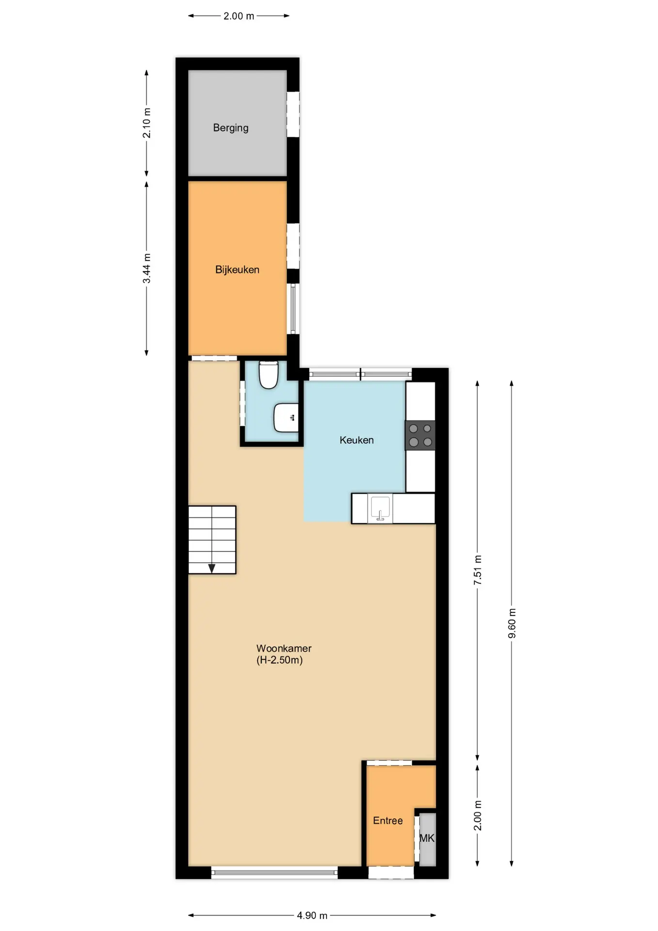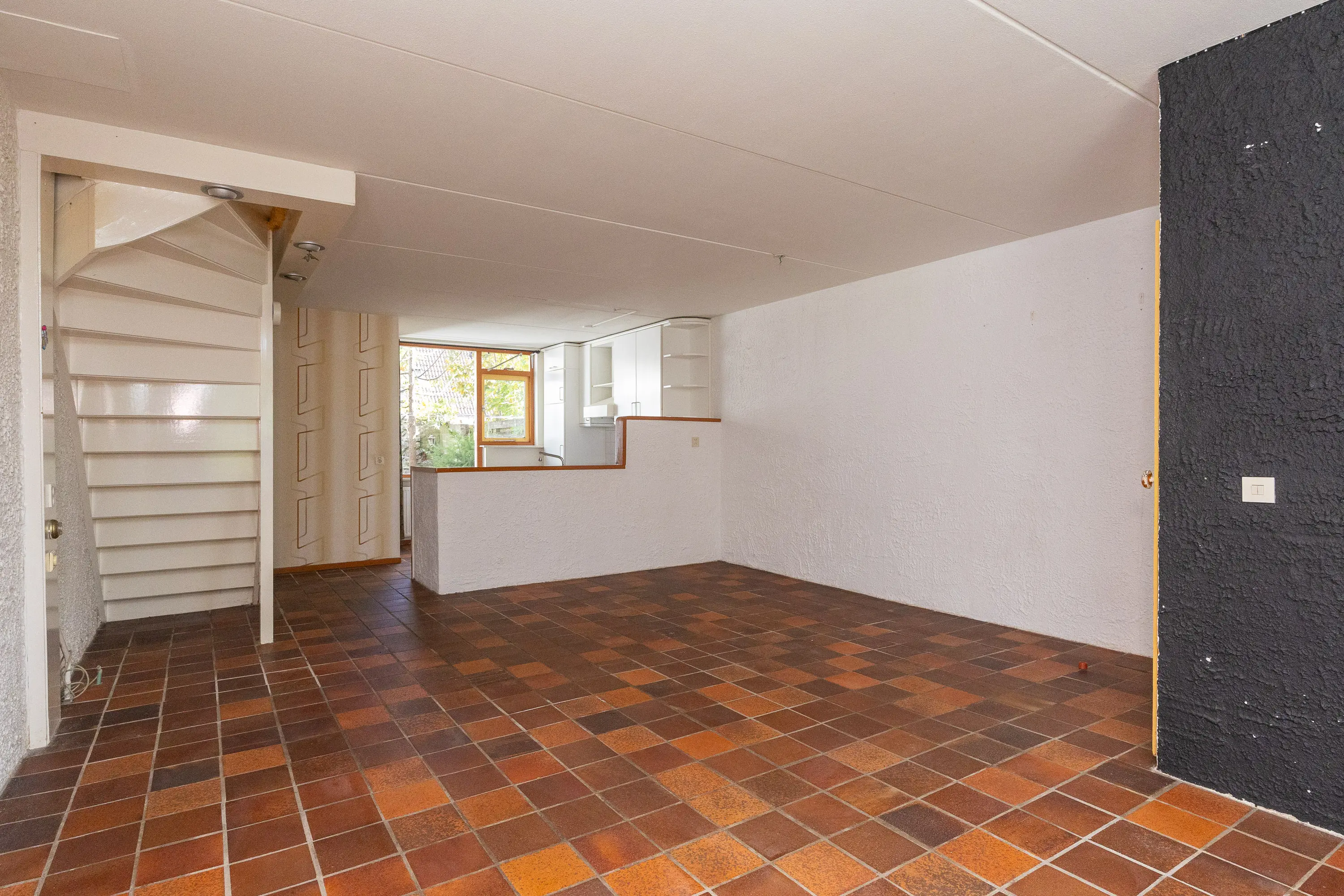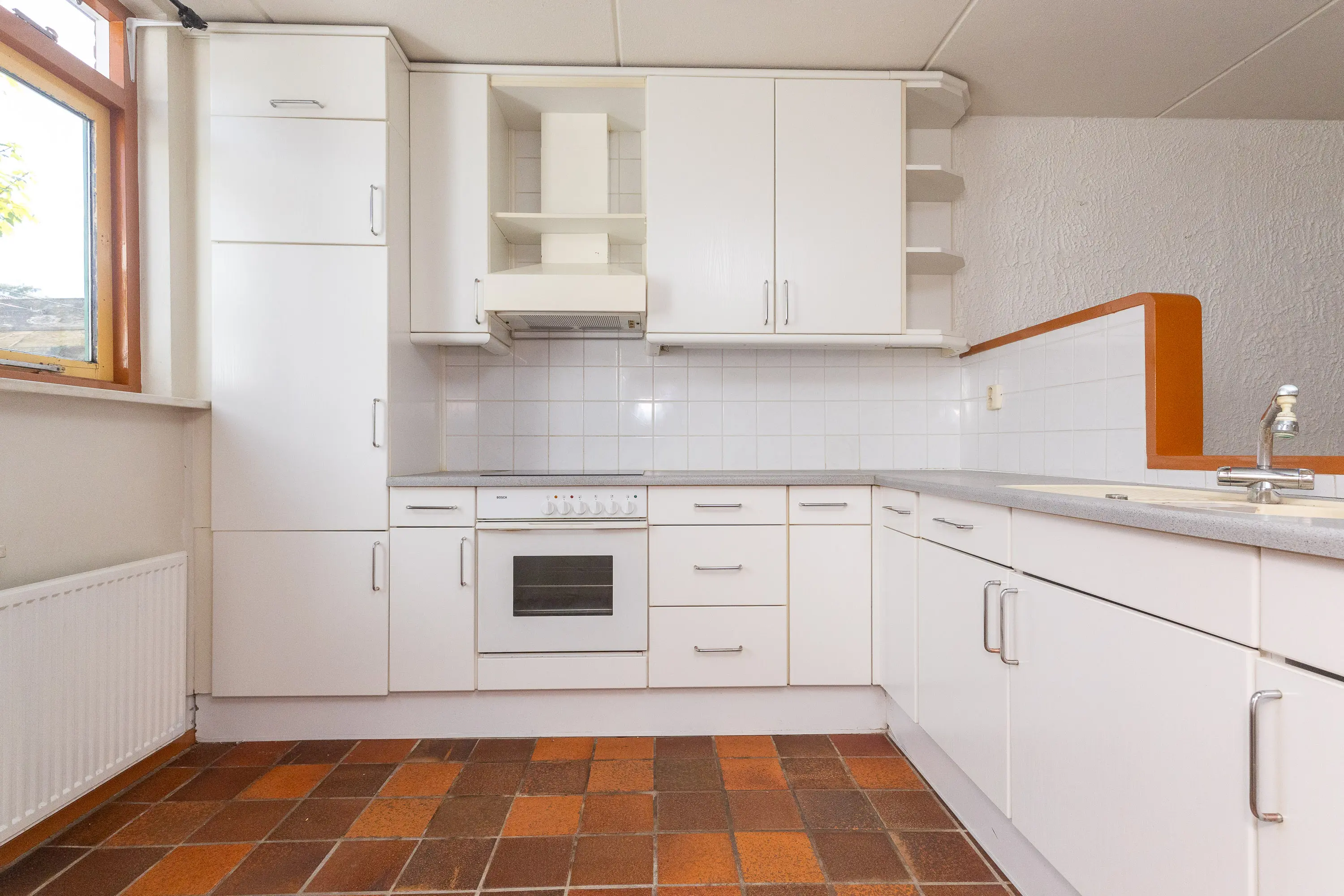 Via de hal bereik je de royale living met open keuken. Dankzij de grote raampartijen geniet je hier van veel lichtinval en een ruimtelijk gevoel. Aangrenzend aan de woning bevindt zich een ruime bijkeuken met toegang tot de tuin. In de tuin is ook nog een opberg ruimte gecreëerd, de tuin is tevens via een eigen poort aan de achterzijde bereikbaar