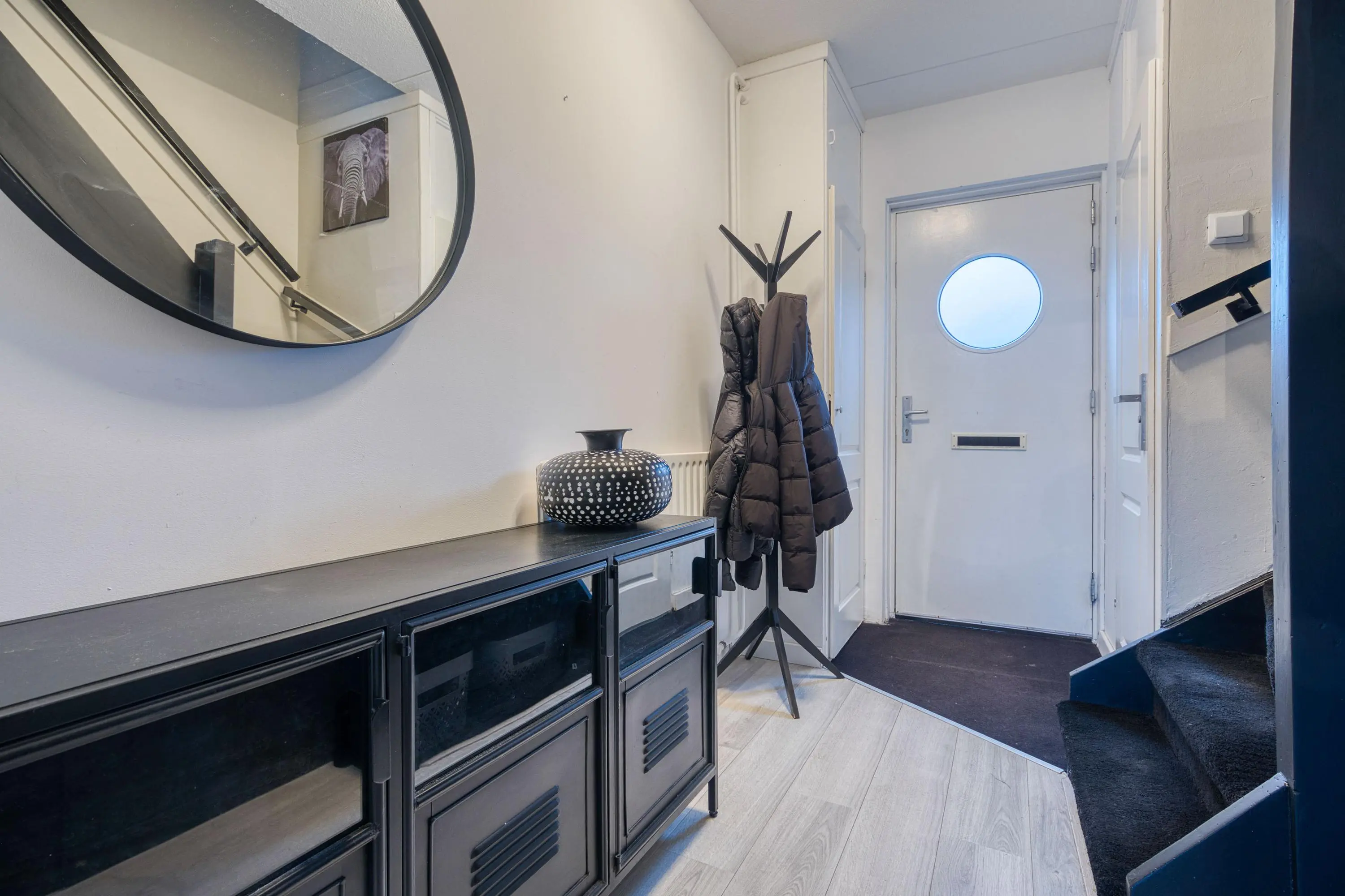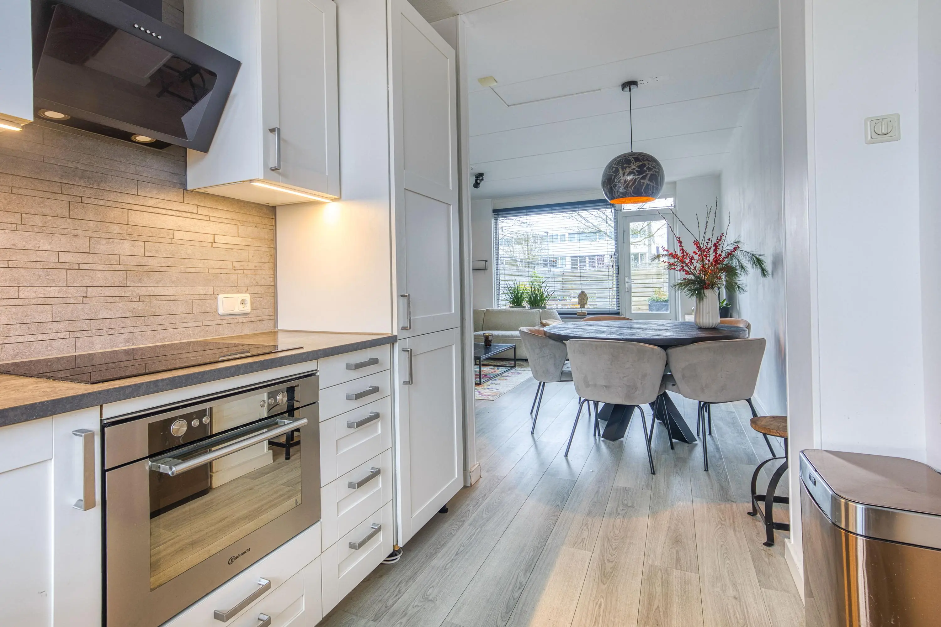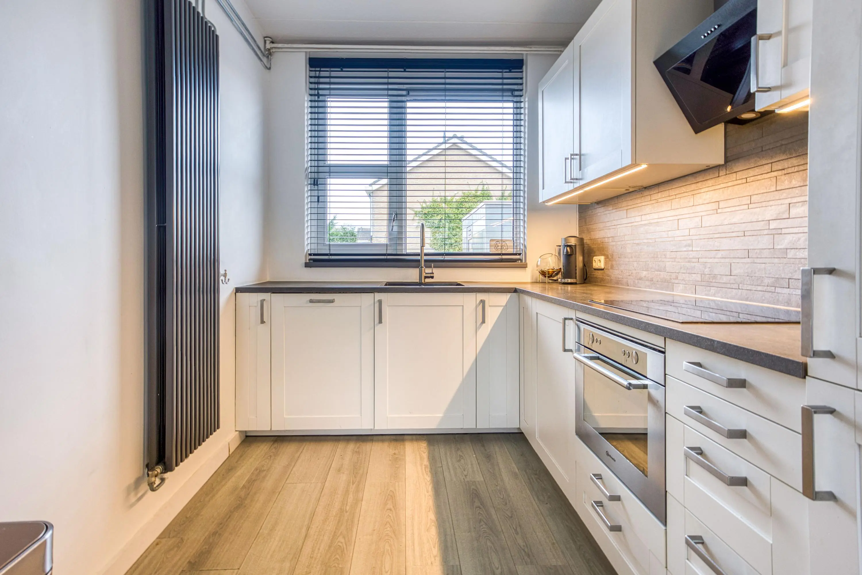 Bij binnenkomst kom je in de hal met toegang tot de woonkamer. De woonkamer is prettig licht en biedt voldoende ruimte voor zowel een gezellige zithoek als een eettafel. Aansluitend bevindt zich de moderne en nette keuken, die is voorzien van diverse inbouwapparatuur en voldoende werk- en bergruimte.