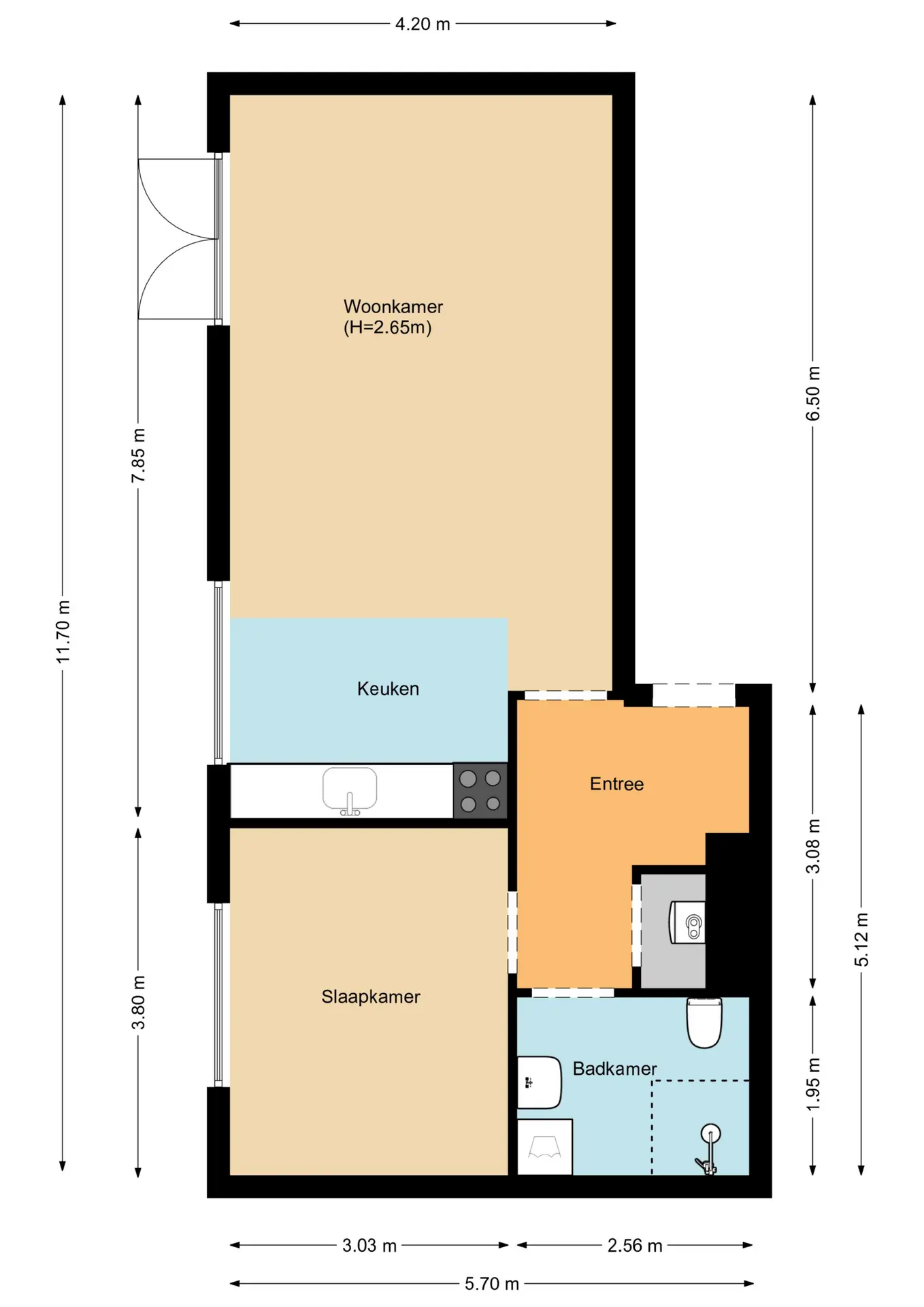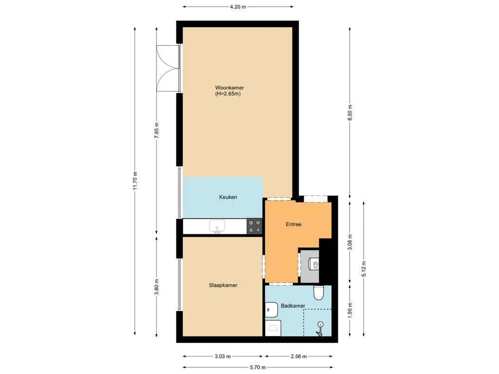 Entree, hal, meterkast, bergkast met opstelling van de C.V. ketel (2008), netjes betegelde badkamer met douche, toilet, wastafel en aansluiting voor de wasmachine, ruime slaapkamer, lichte woonkamer met openslaande deuren naar de tuin, open keuken in rechte opstelling met een 5-pits gaskookplaat en oven, afzuigkap.